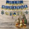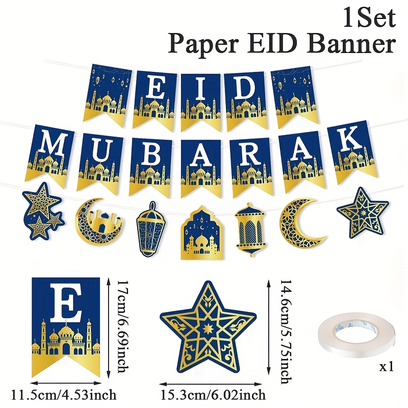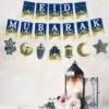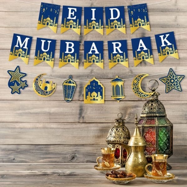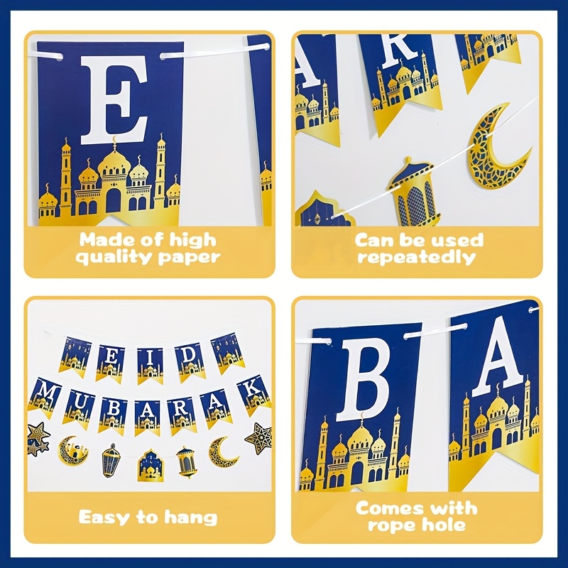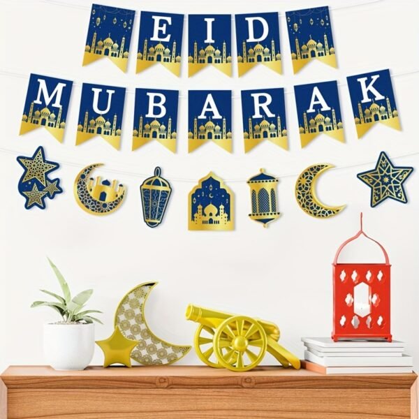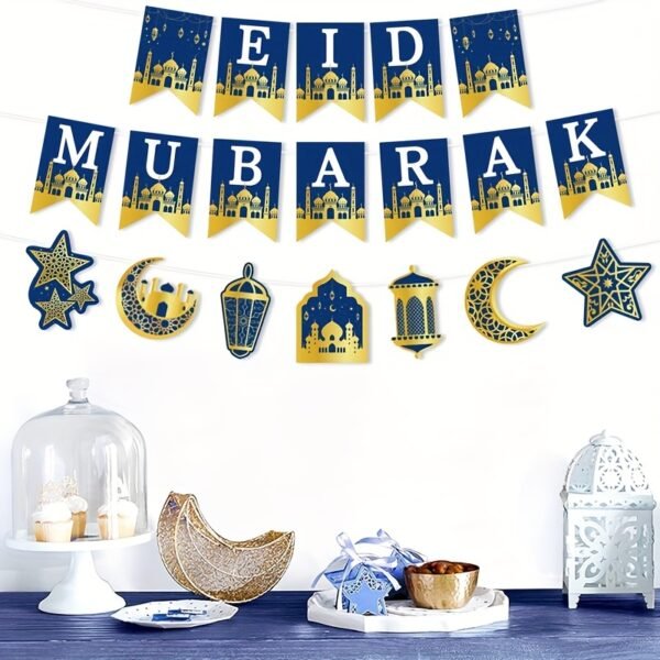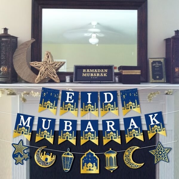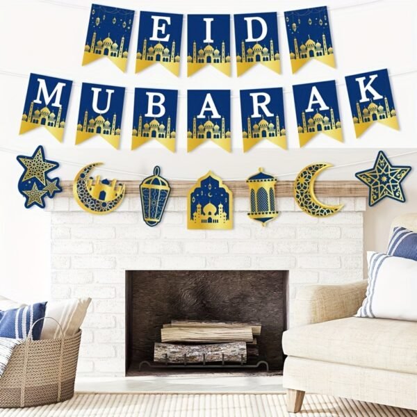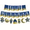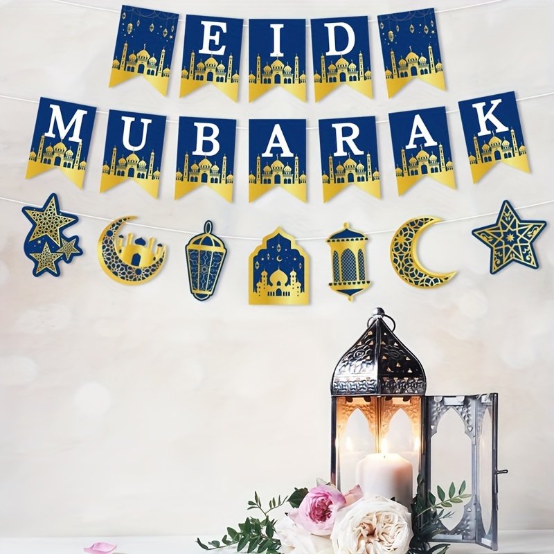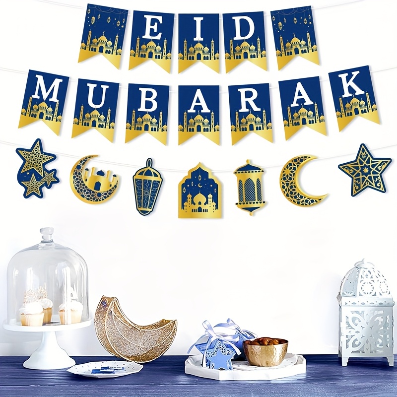 1 Ensemble, Bannière, Drapeau à Tirer Eid Mubarak, Drapeau à Tirer en Papier Bleu Doré Lune Château Étoile Lanterne, Décoration Suspendue Ramadan Kareem, Eid Mubarak, Fournitures de Fête Musulmanes Islamiques, Décoration de Ramadan pour la Maison, Cadeaux d’Aïd al-Fitr