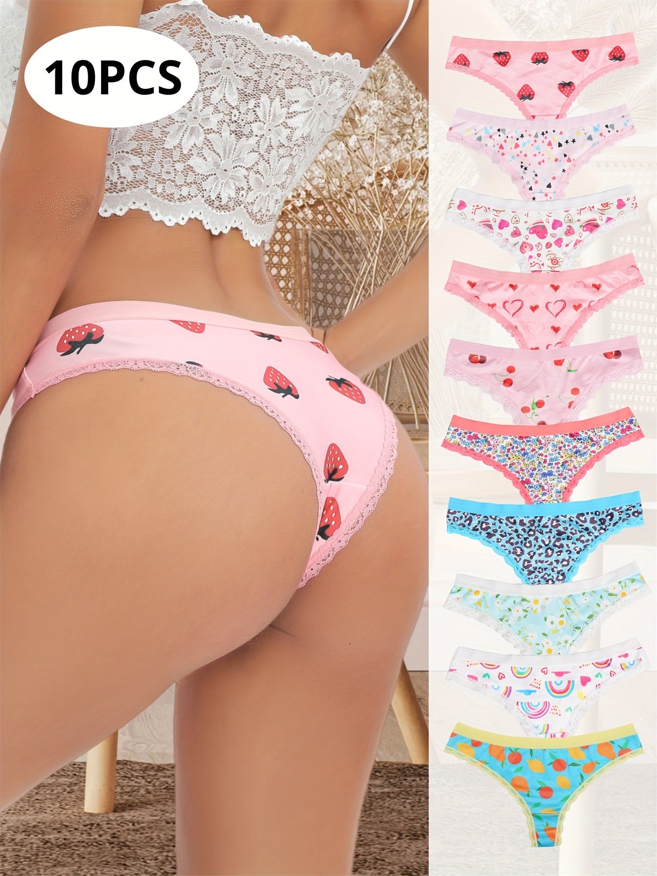 10 pièces de Strings et Mignons à Imprimés, Motifs Fruits & Cœurs & Léopards & Fleurs