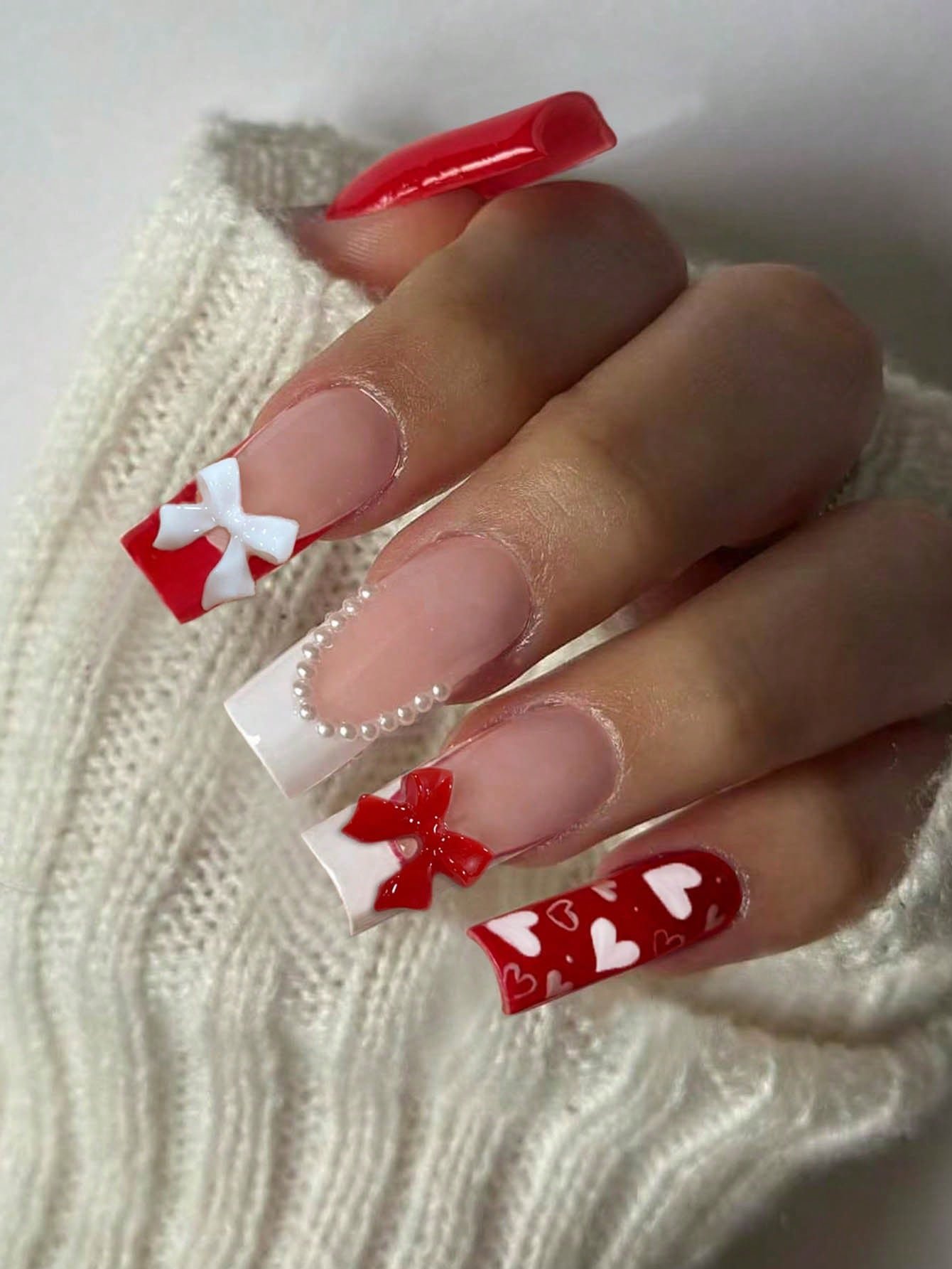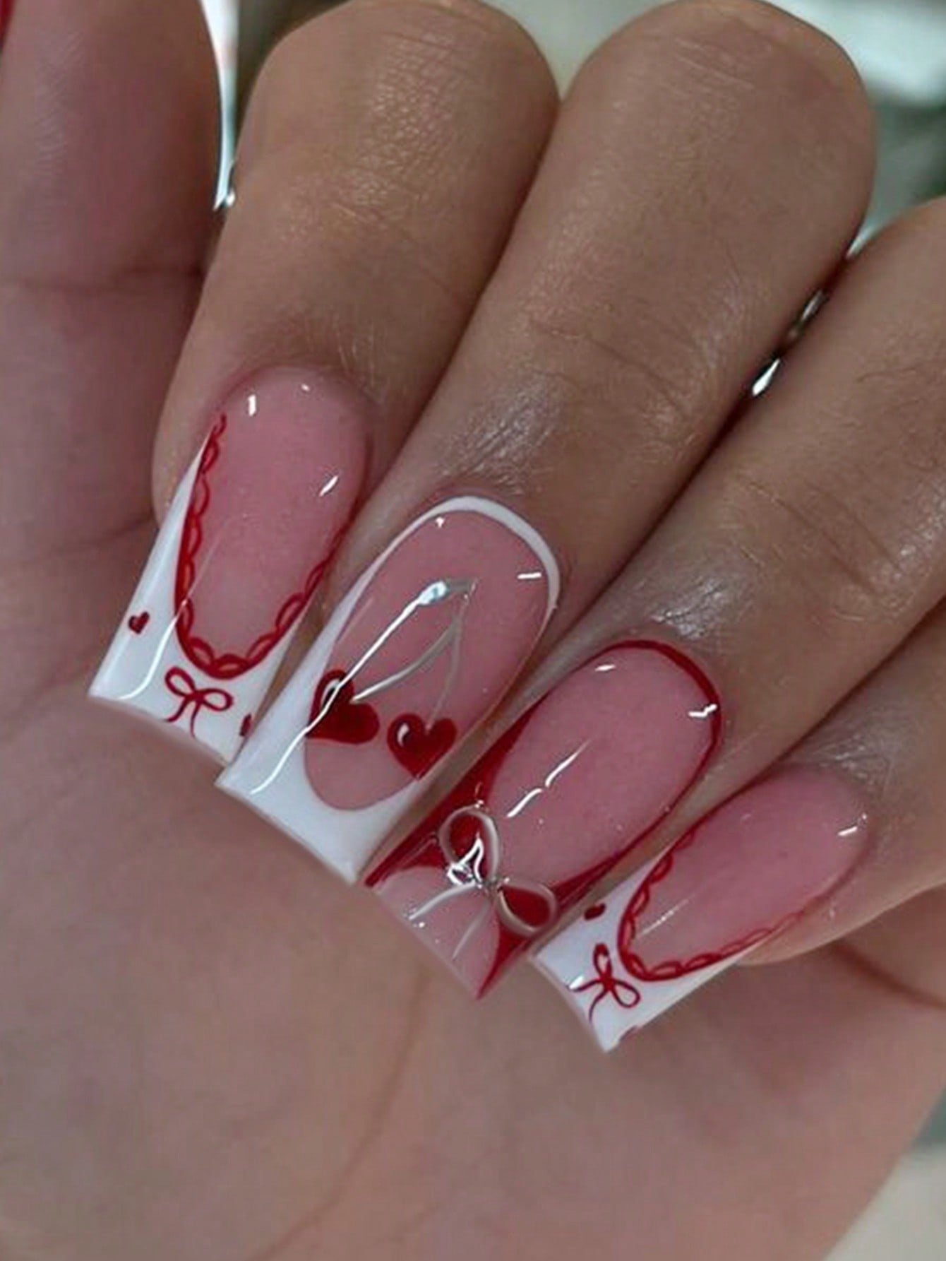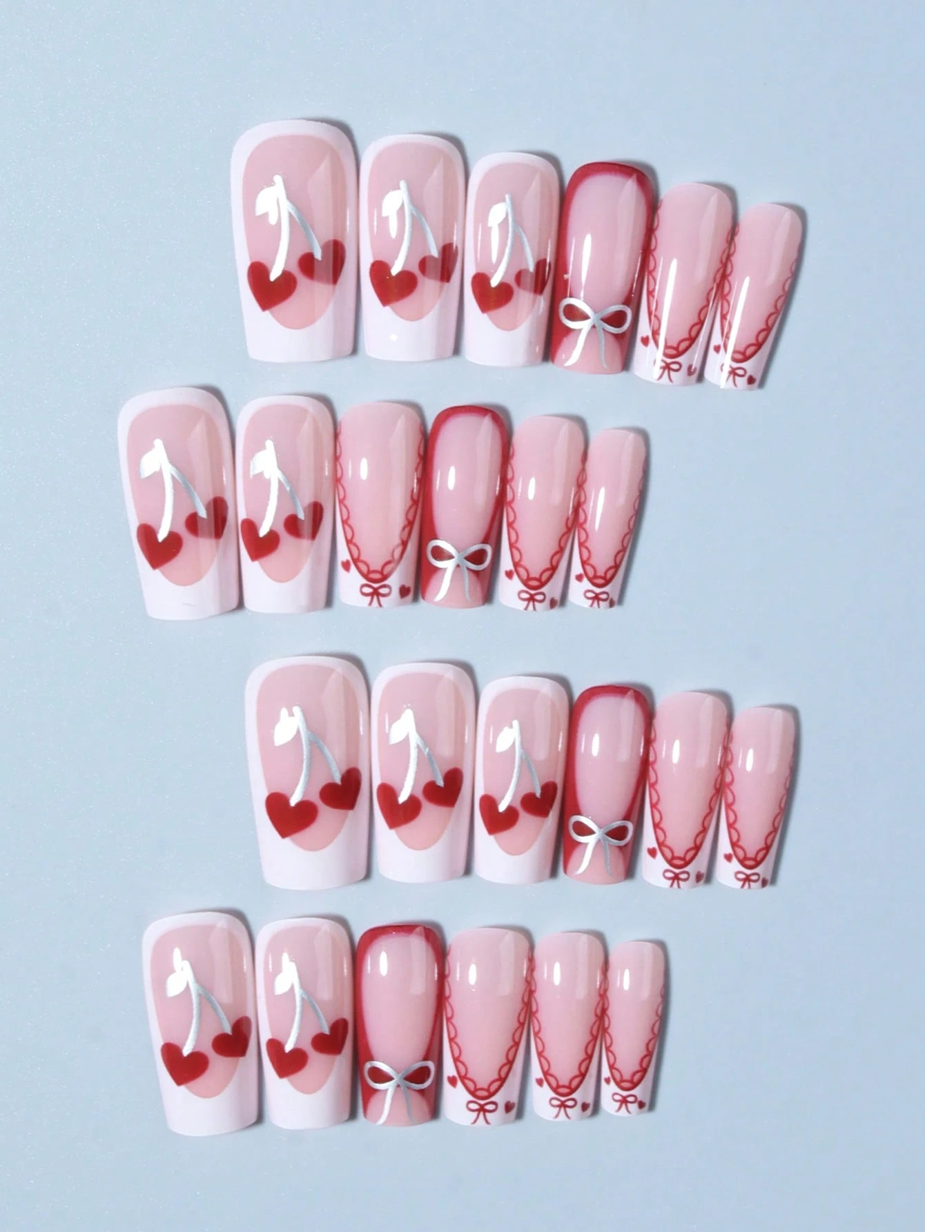 24 pièces Faux ongles carrés longs avec motif nœud et cerises, blancs, en acrylique. Comprend : 1 pièce de colle de gel et 1 pièce de lime à ongles. Rendez vos ongles brillants et beaux pour la Saint-Valentin. Ces ongles conviennent parfaitement pour les