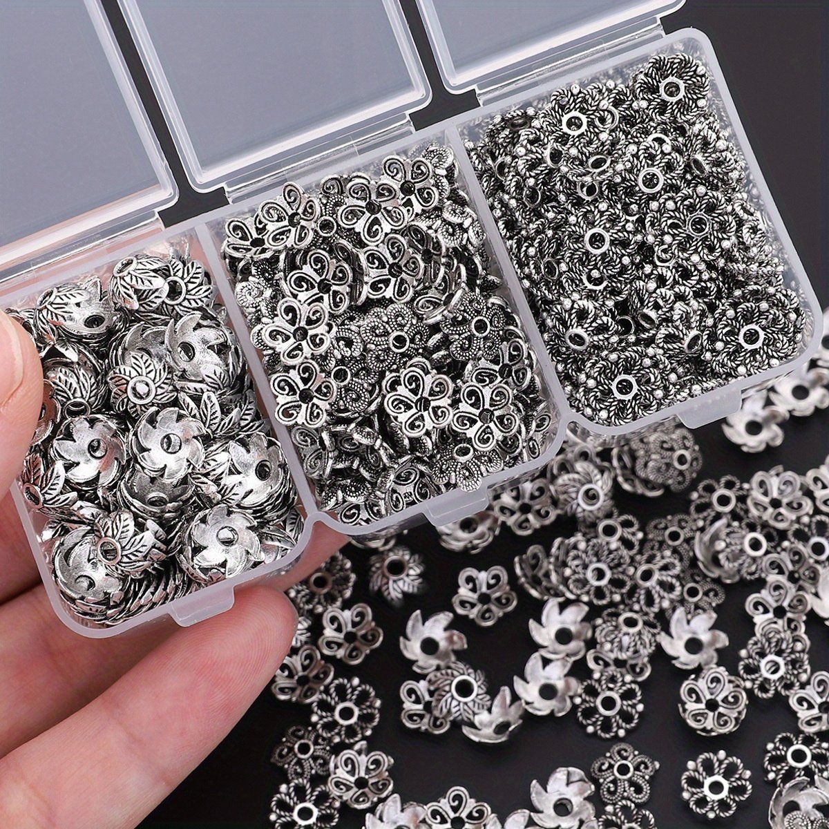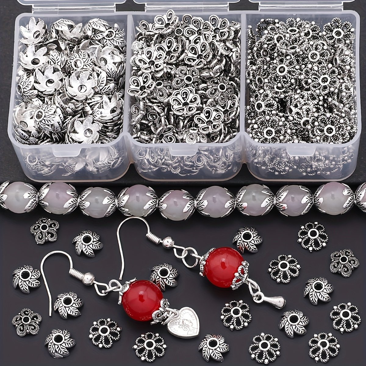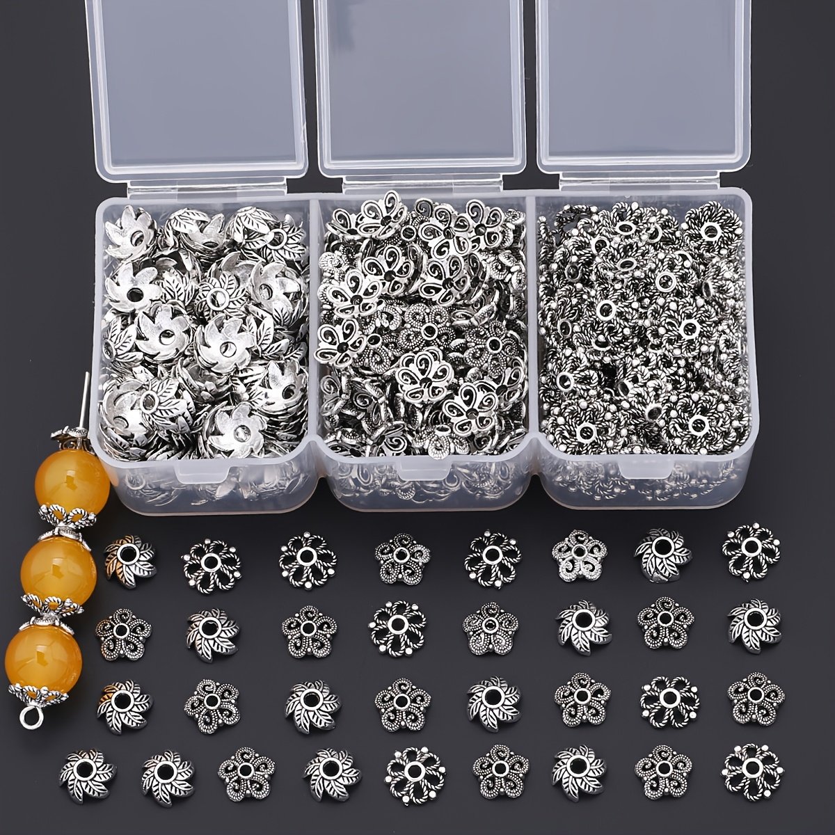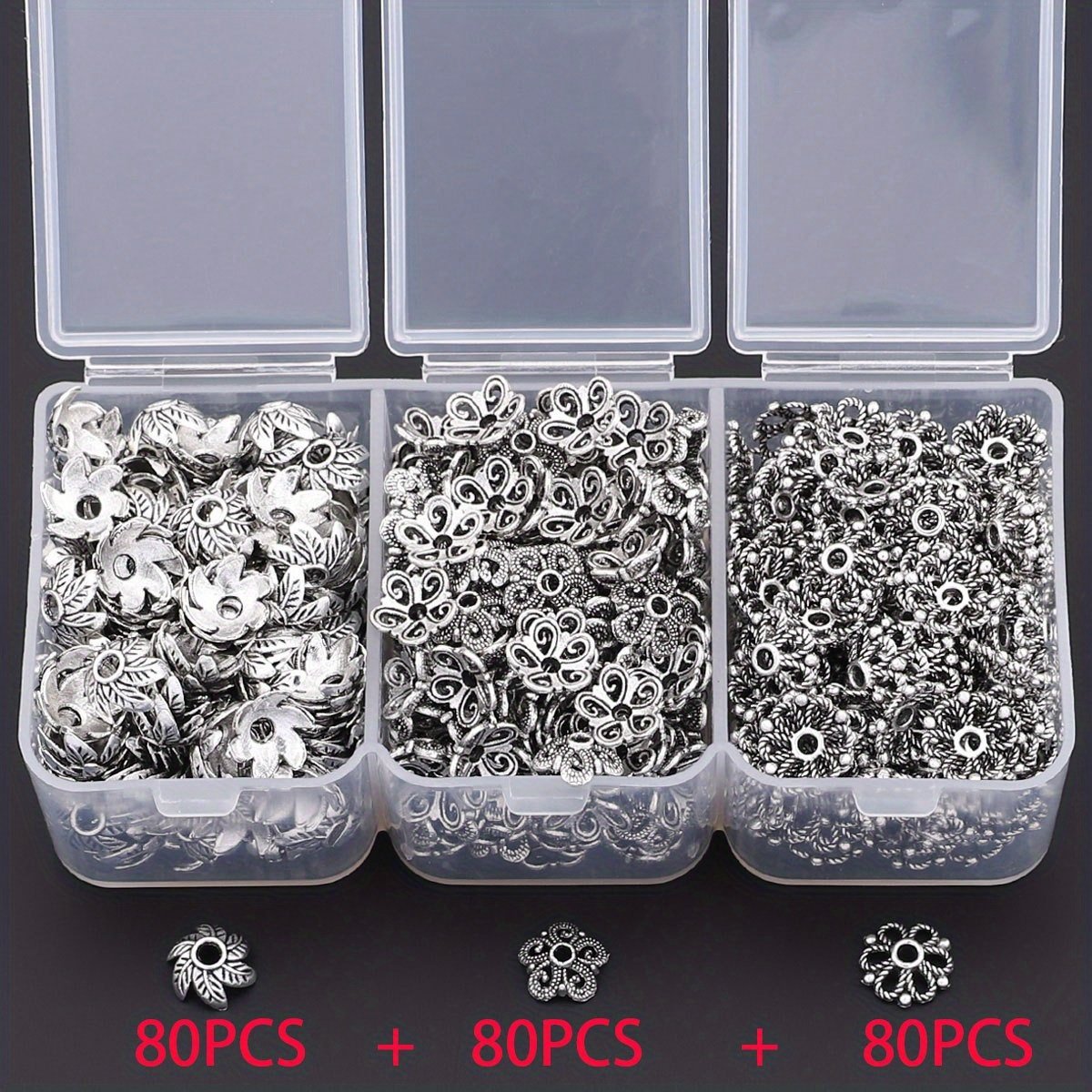 240 pièces/boîte 3 styles de capuchons en forme d'épissure à feuilles bouclées, couvre-chapeaux perlés, embouts frangés pour espacers et bases de création boucles d'oreille, patins fermoirs bracelets colliers connecteurs DIY accessoires matériels adapta