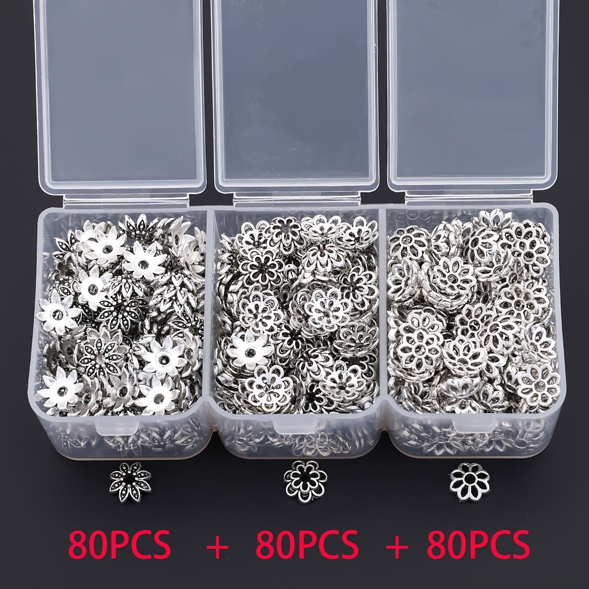 240pcs par boîte, 3 styles de embouts floraux, embouts de fleurs, embouts de perles, embouts de pompons