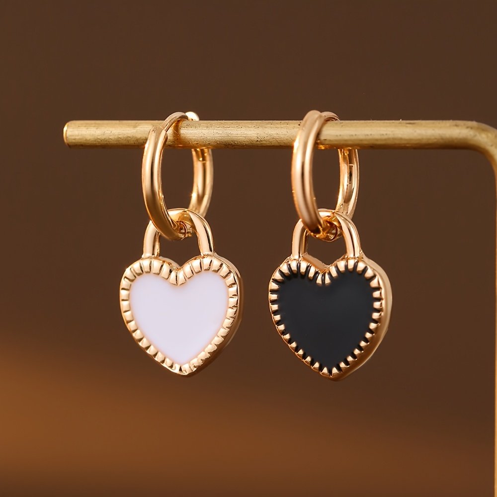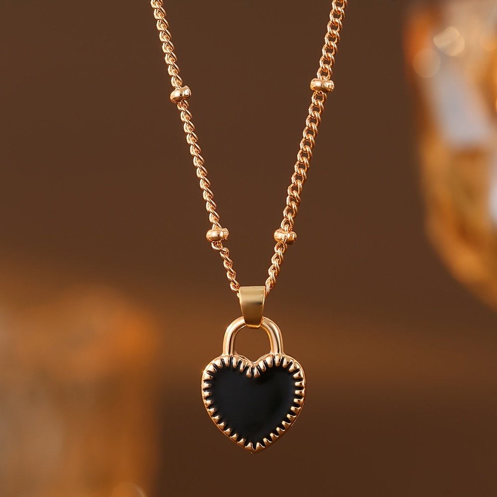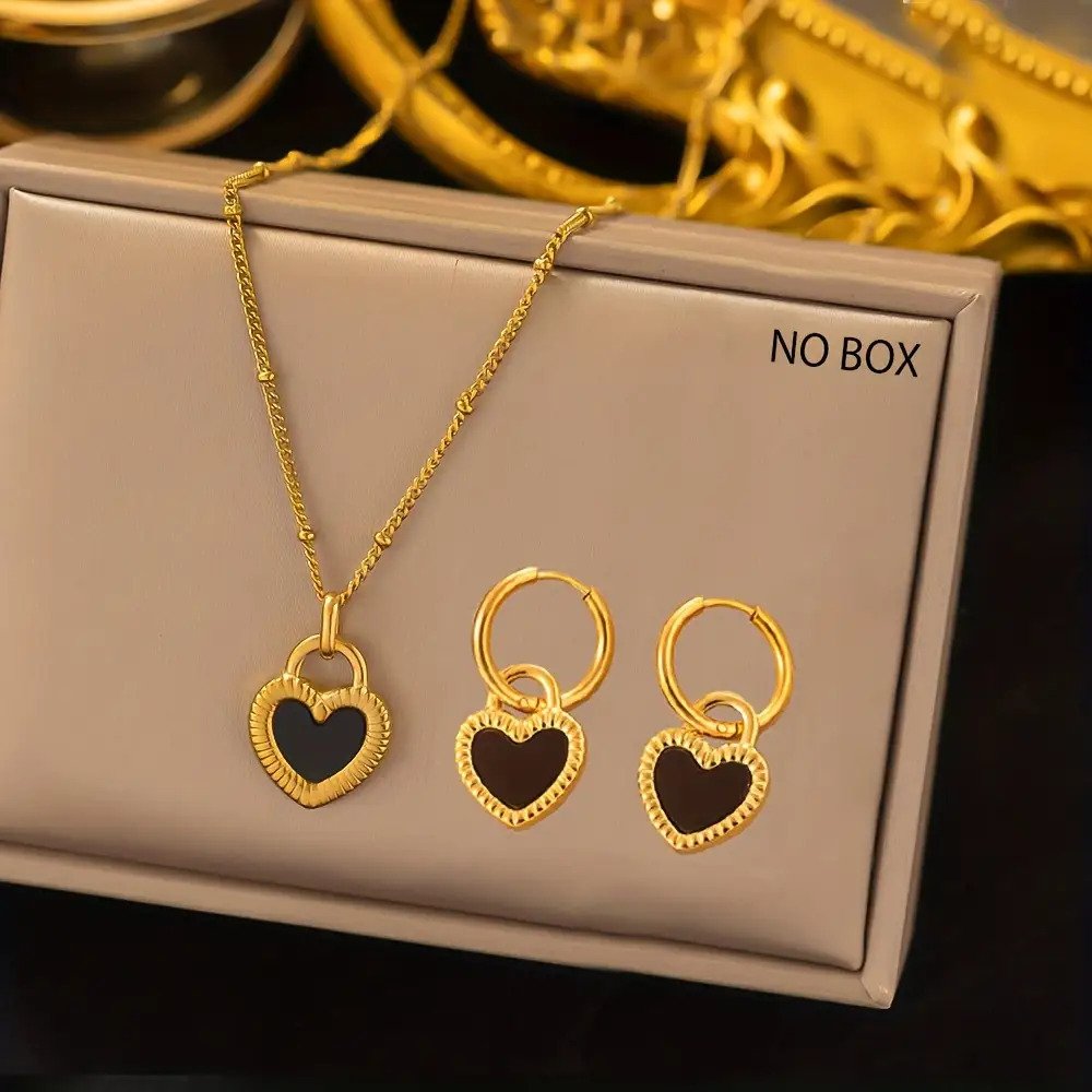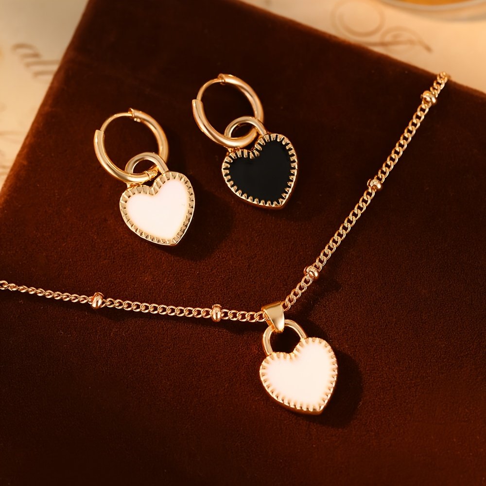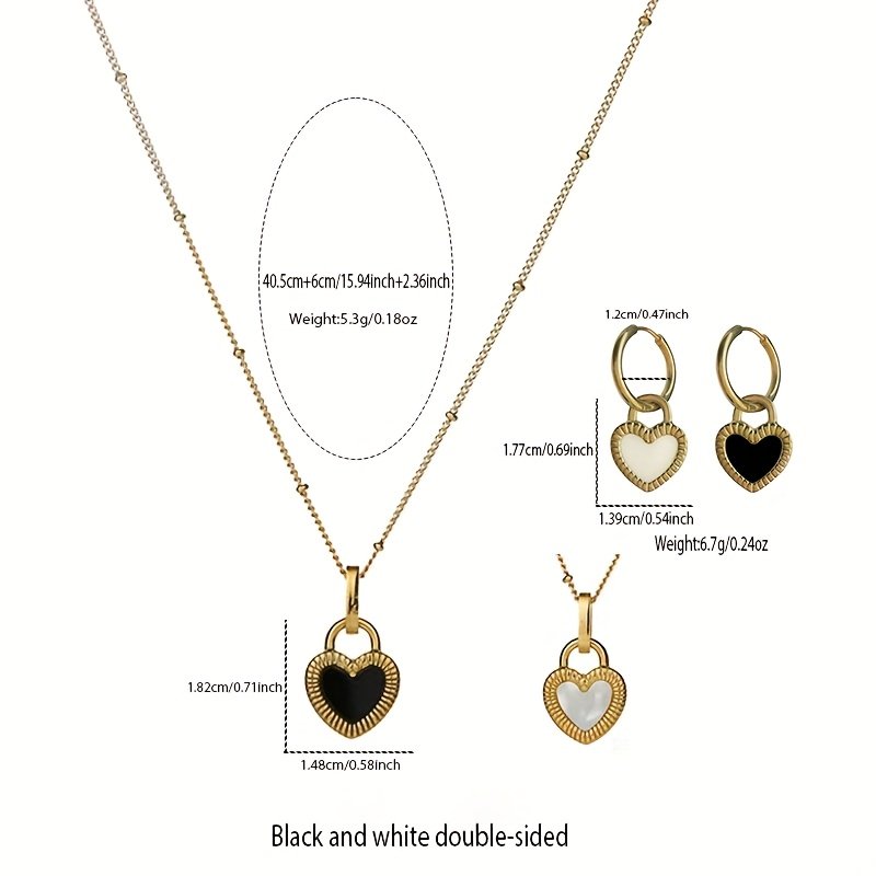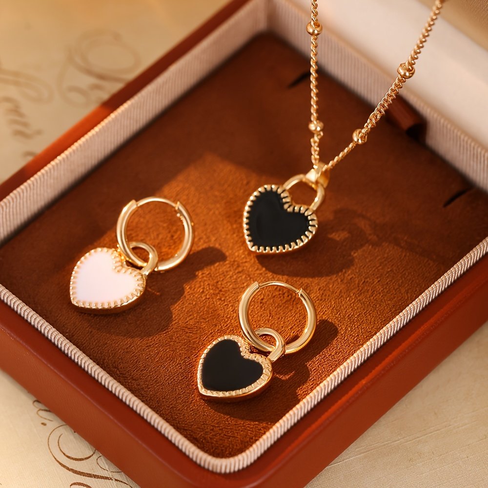 3 pièces Ensemble de Bijoux pour Femme : Pendentif Cœur Noir et Blanc Léger et Tendance, Acier Inoxydable 304 Plaqué Or 18K, Inclut un Collier + une Paire de Boucles d'Oreilles