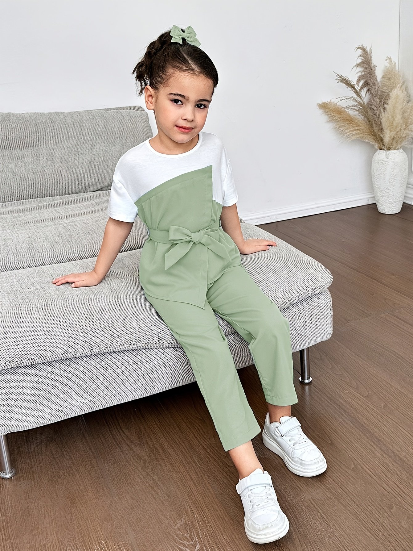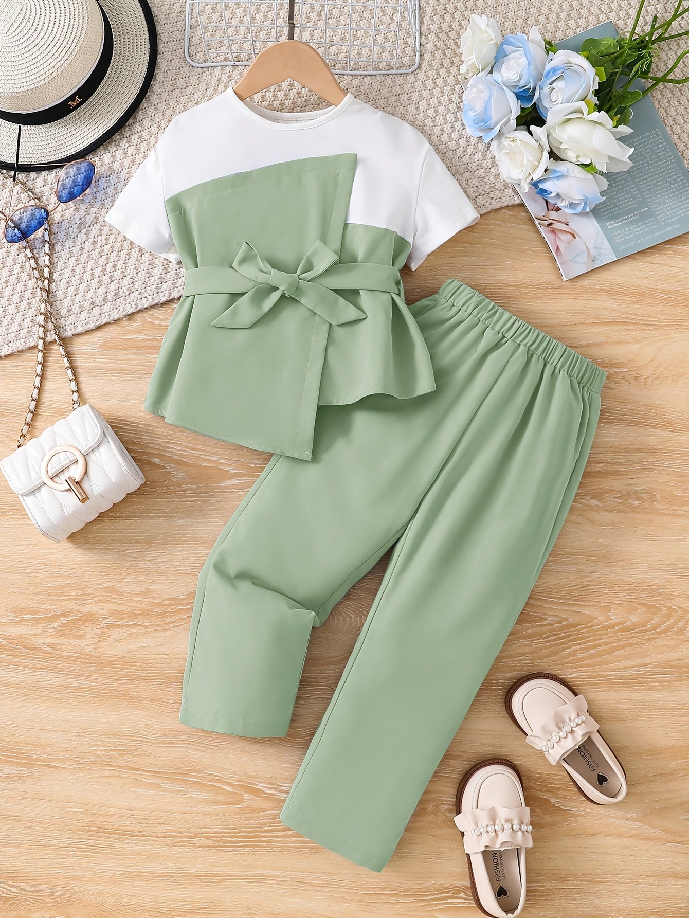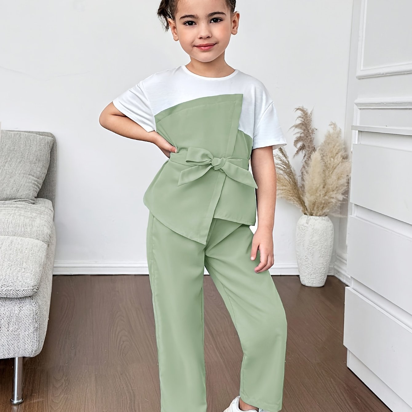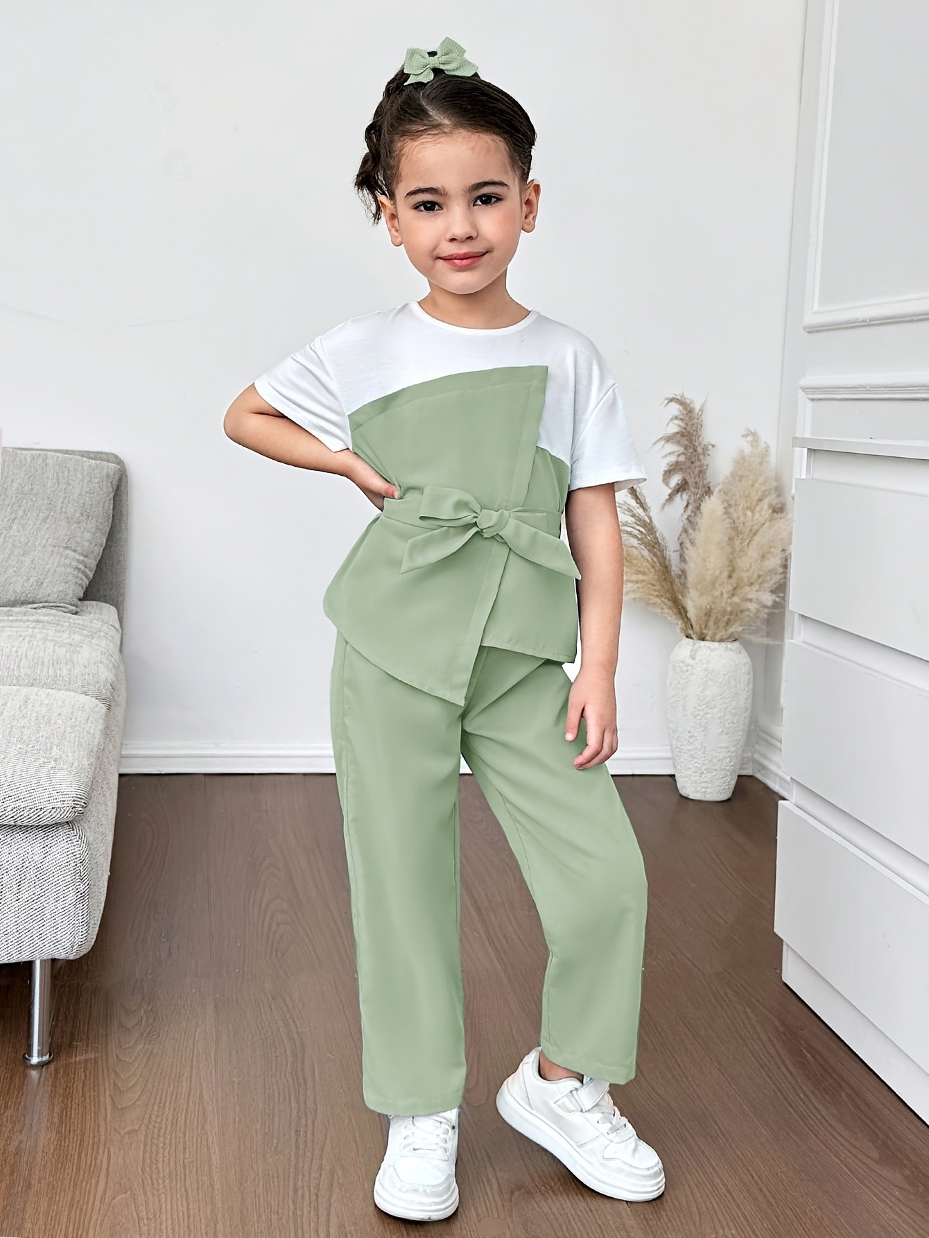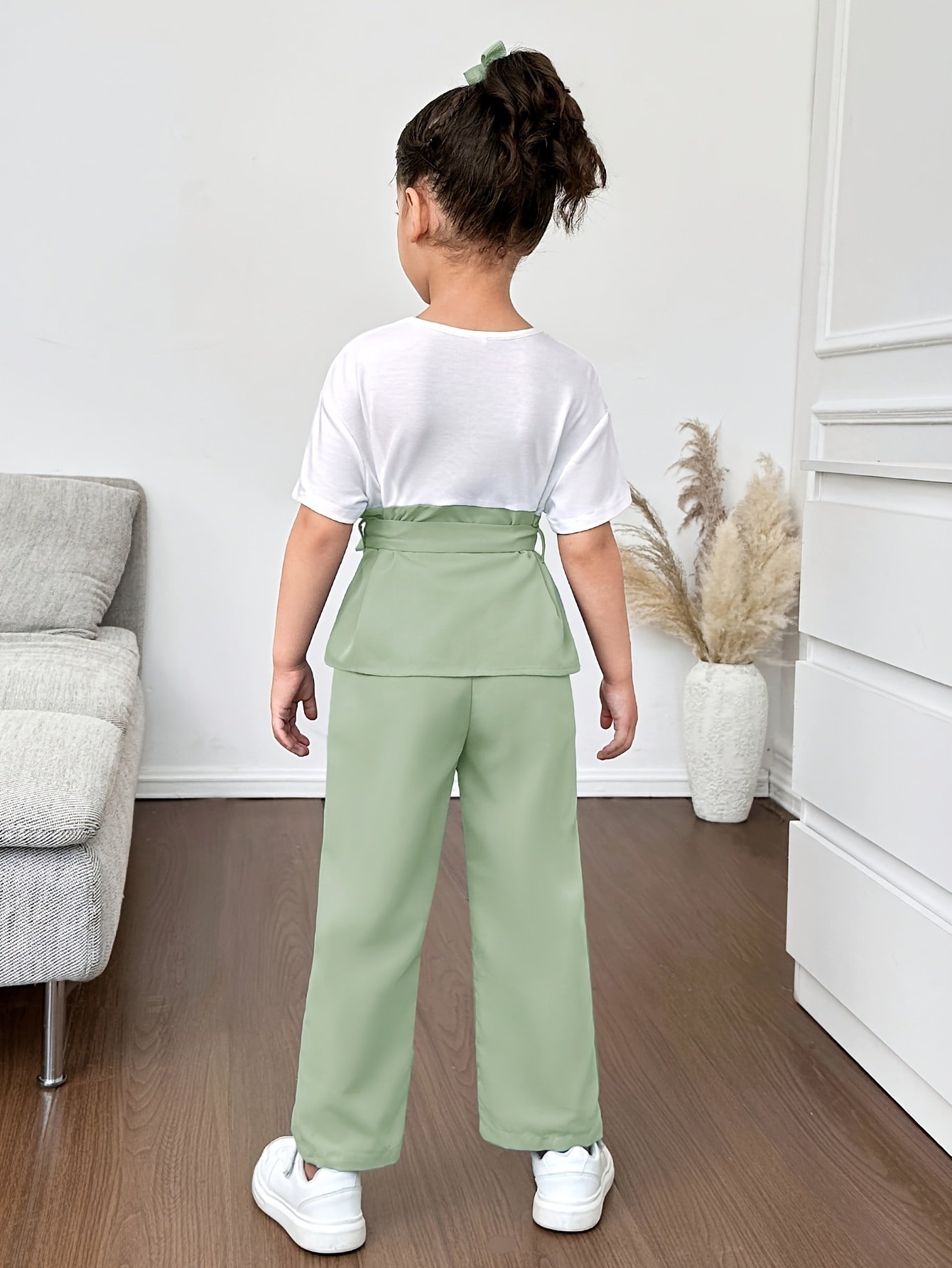 3 pièces Ensemble Décontracté Fille Printemps/Été T-Shirt 2-en-1 + Pantalon Large et Ceinture Assortie, Idéal pour l’Extérieur