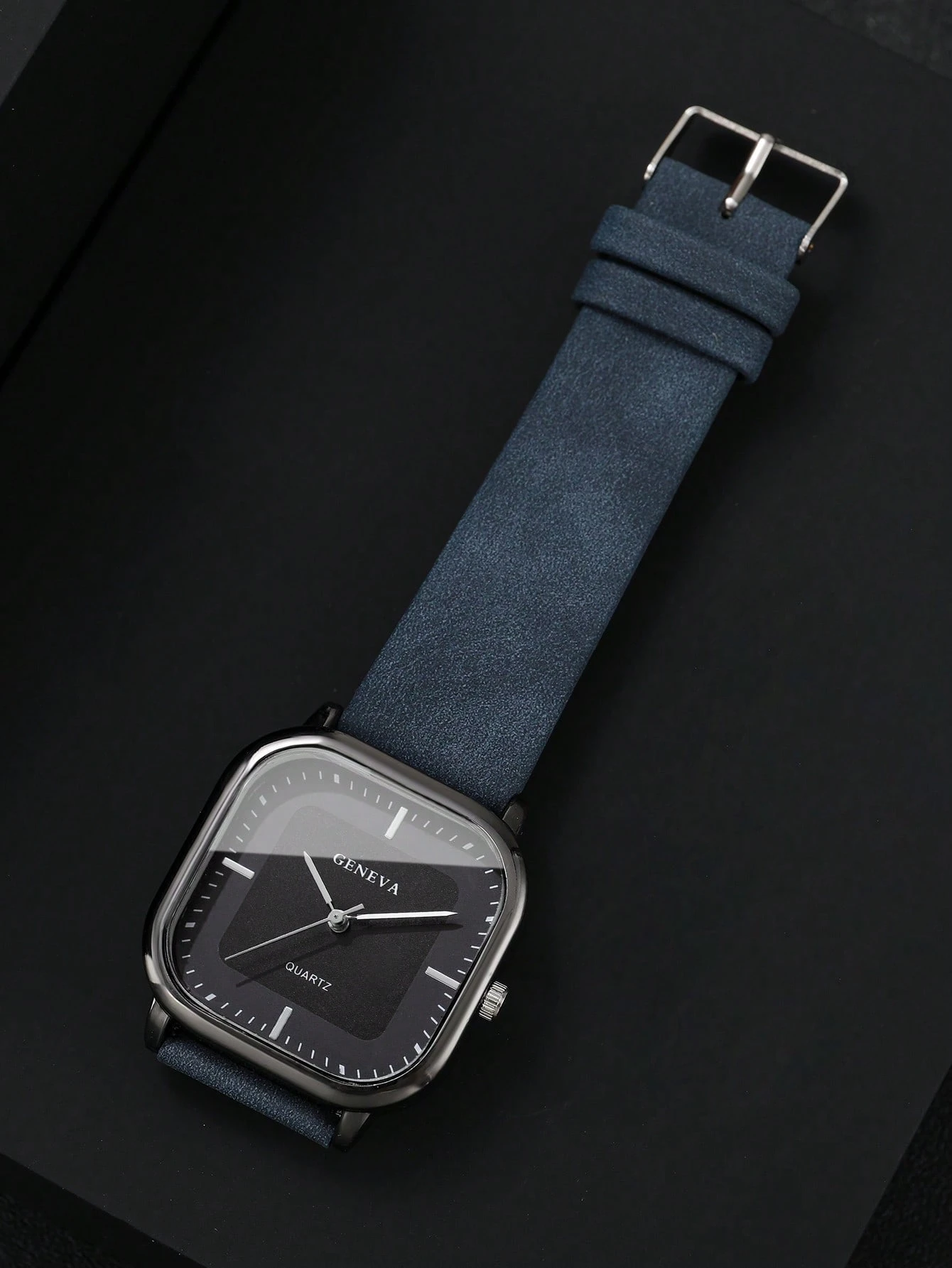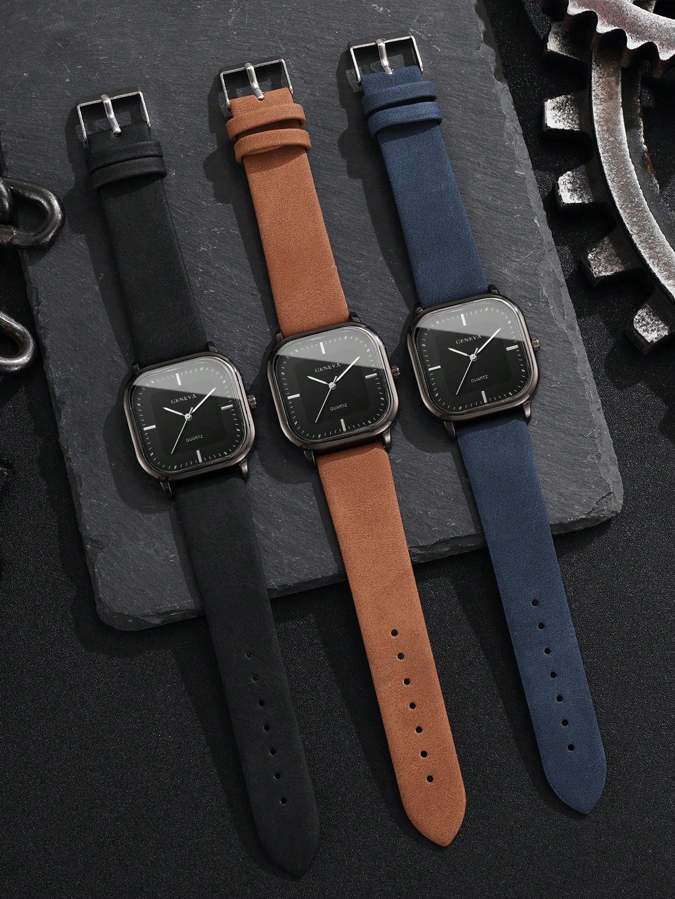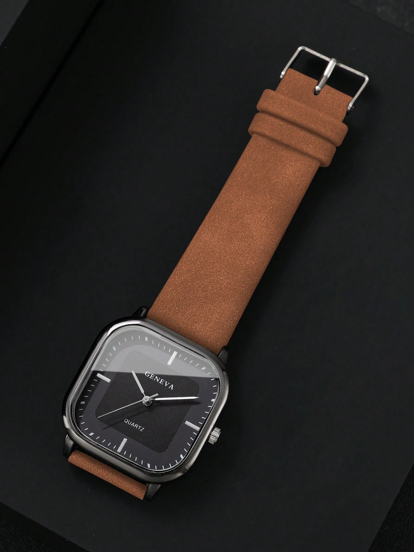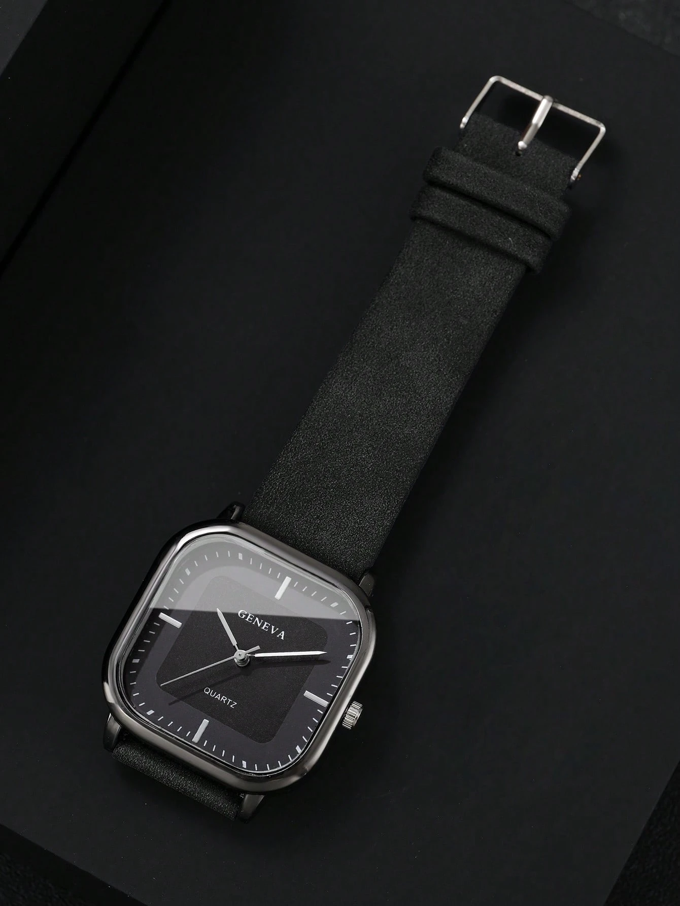 3 pièces Set : Montre à quartz avec cadran carré minimaliste et accessoire de ceinture pour hommes, boîte de montre non incluse