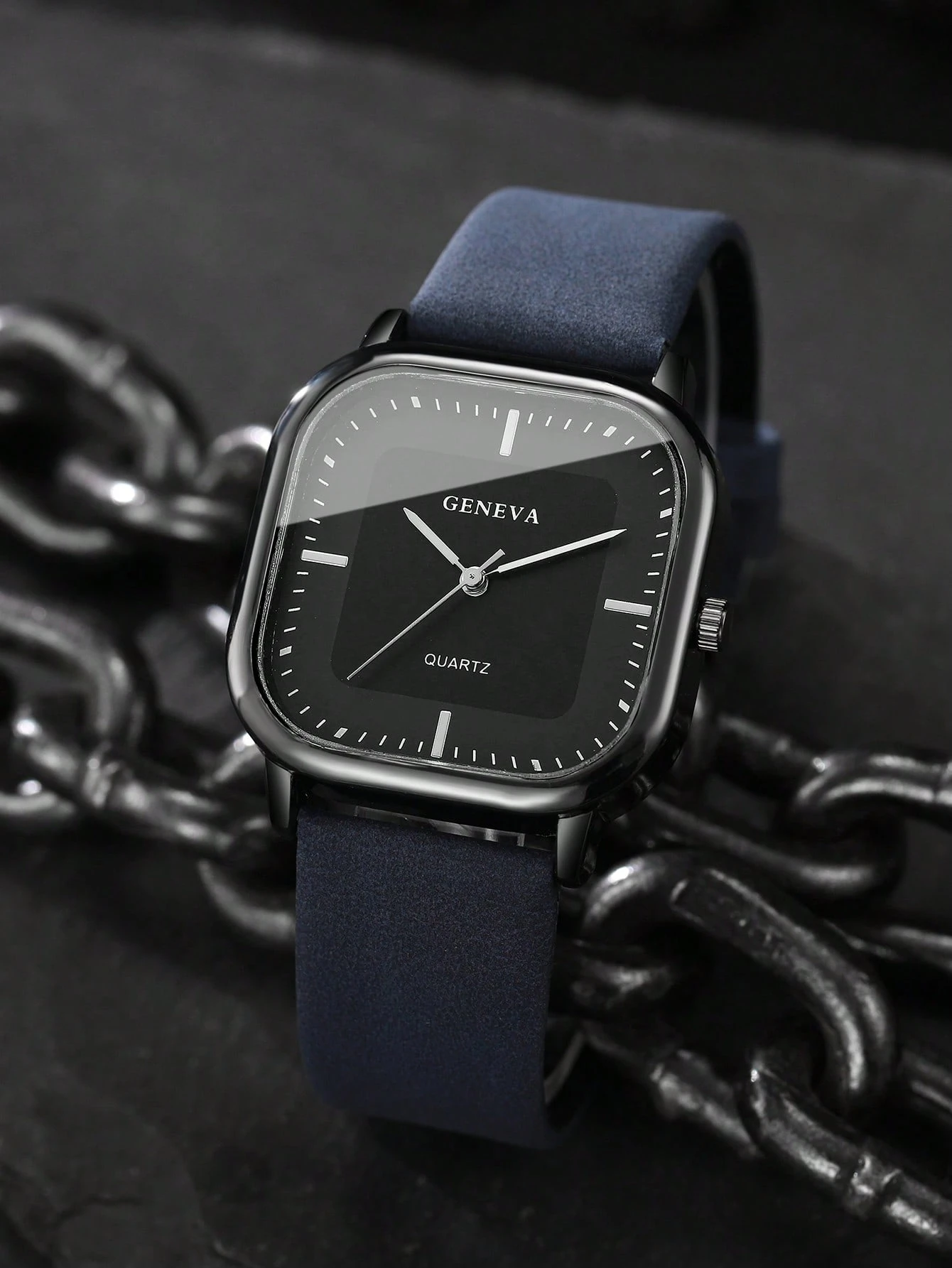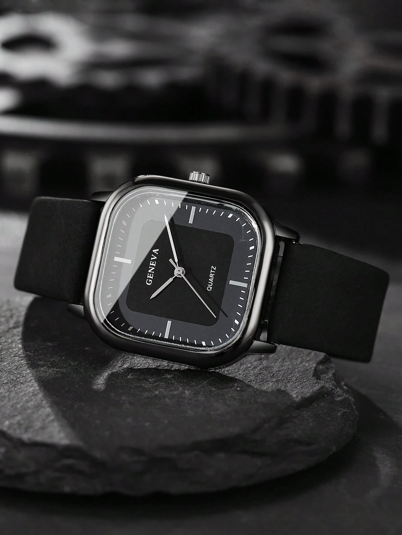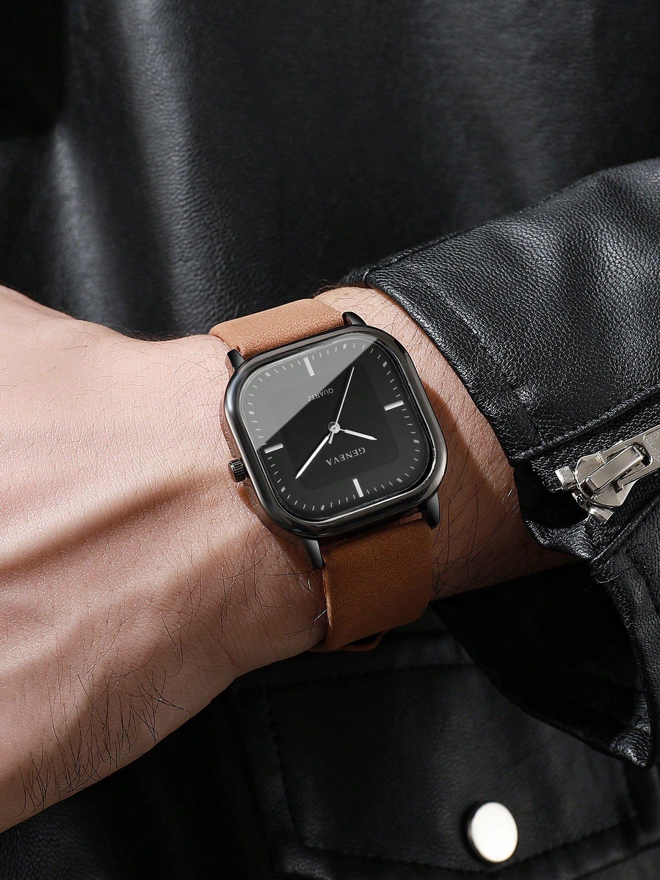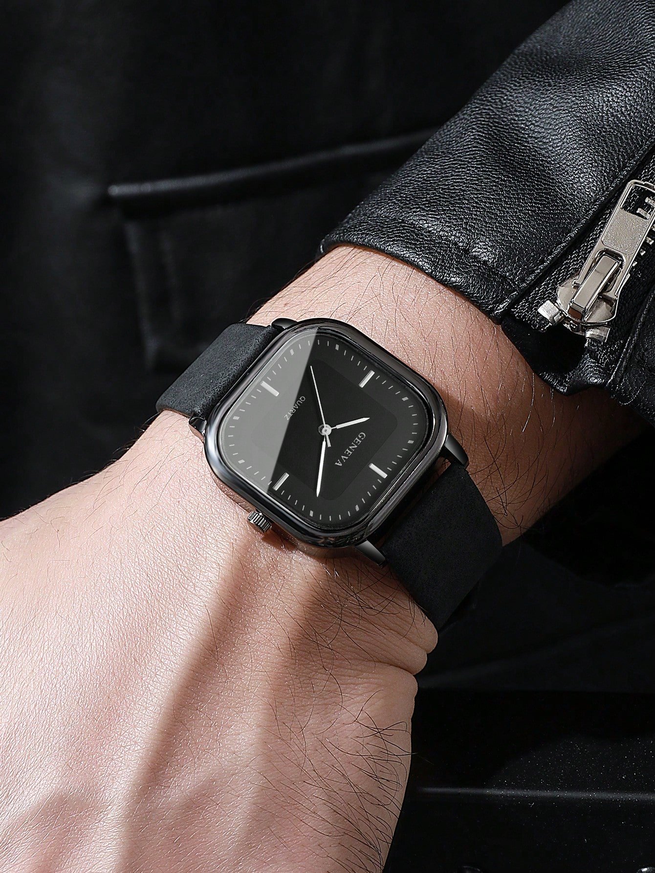 3 pièces Set : Montre à quartz avec cadran carré minimaliste et accessoire de ceinture pour hommes, boîte de montre non incluse