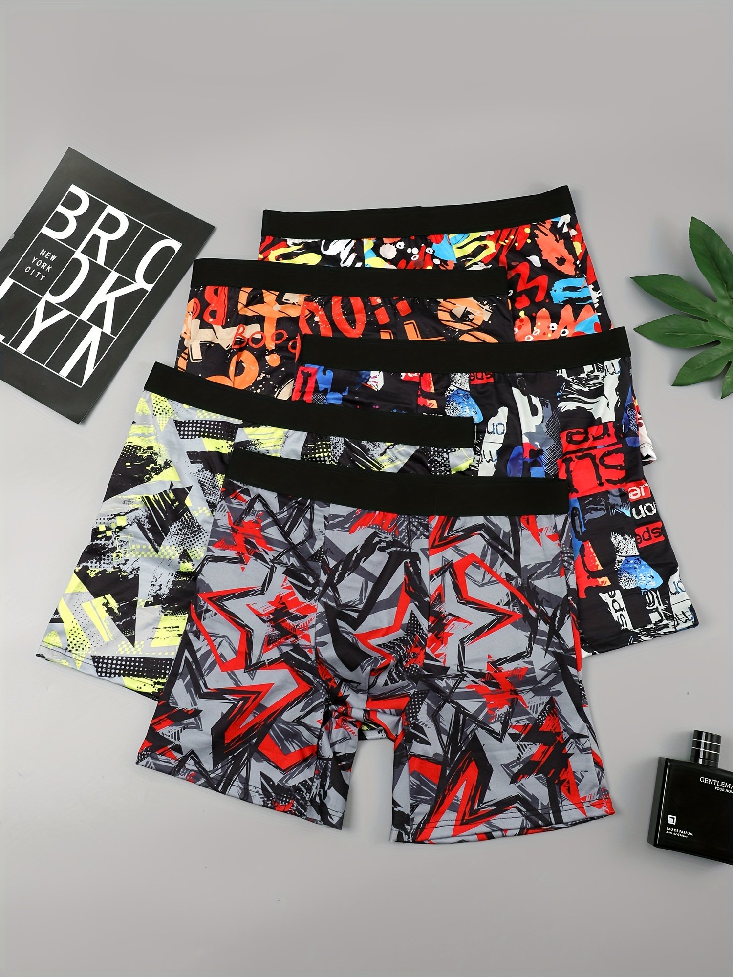 5 boxers longs pour hommes – Motif graffiti géométrique, sous-vêtements extensibles, tissu doux opaque lavable en machine, tenue décontractée confortable, design amusant, matériau respirant, ensemble multi-pack, essentiel de mode