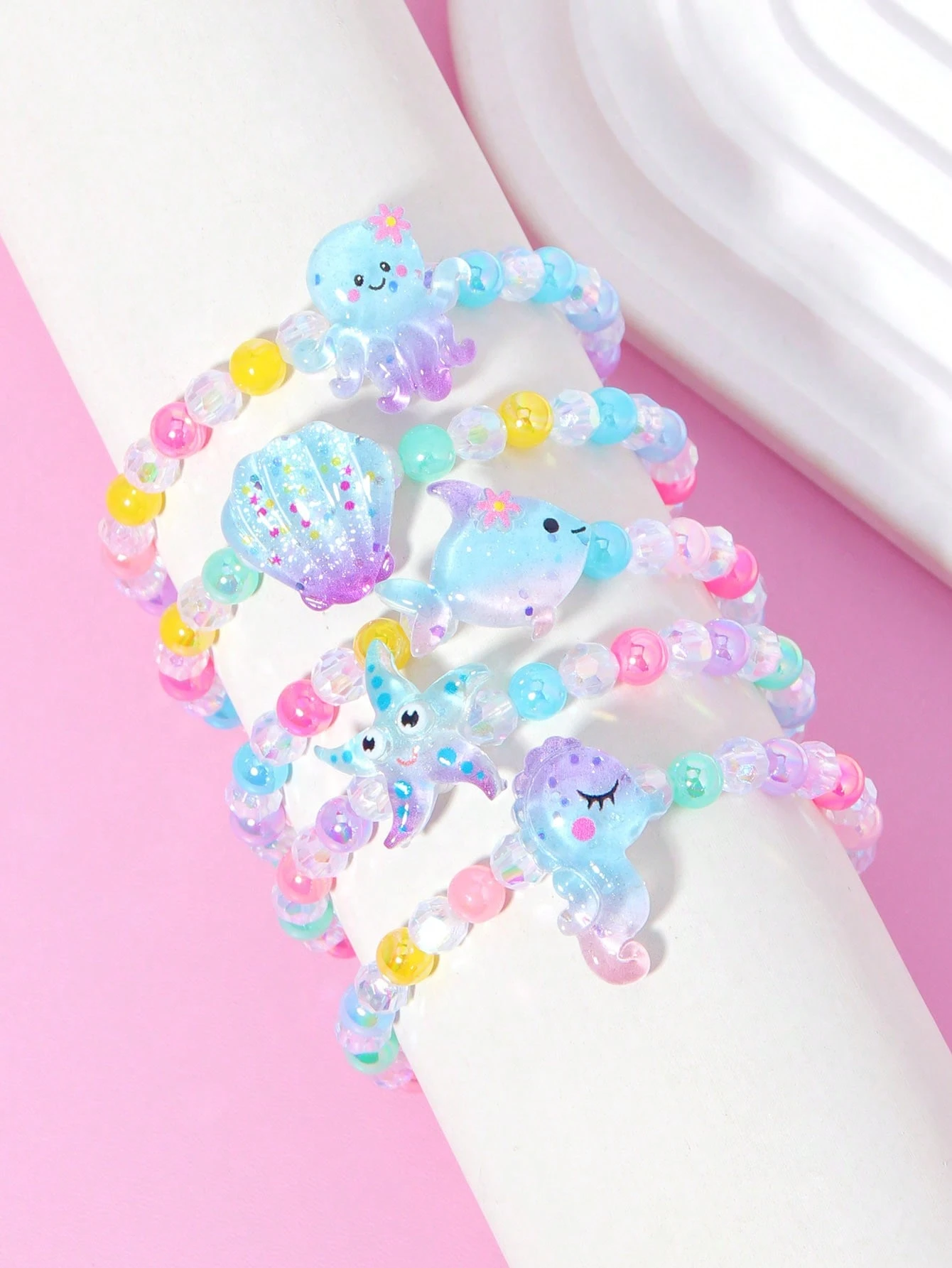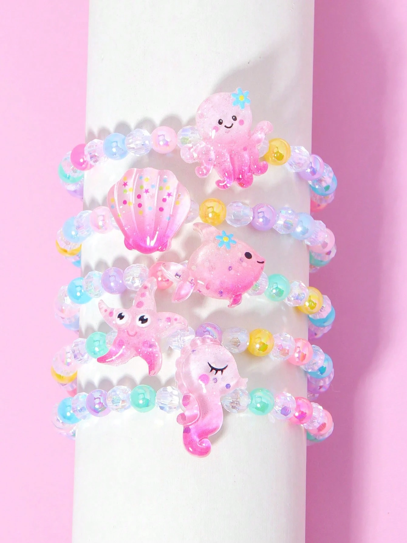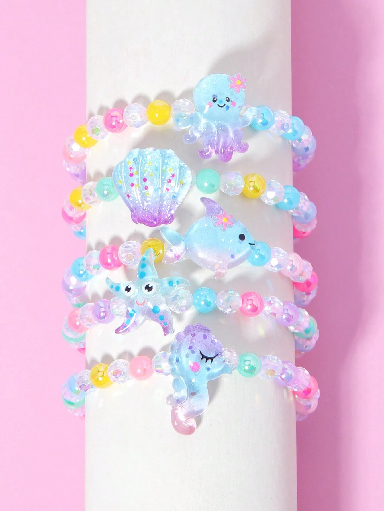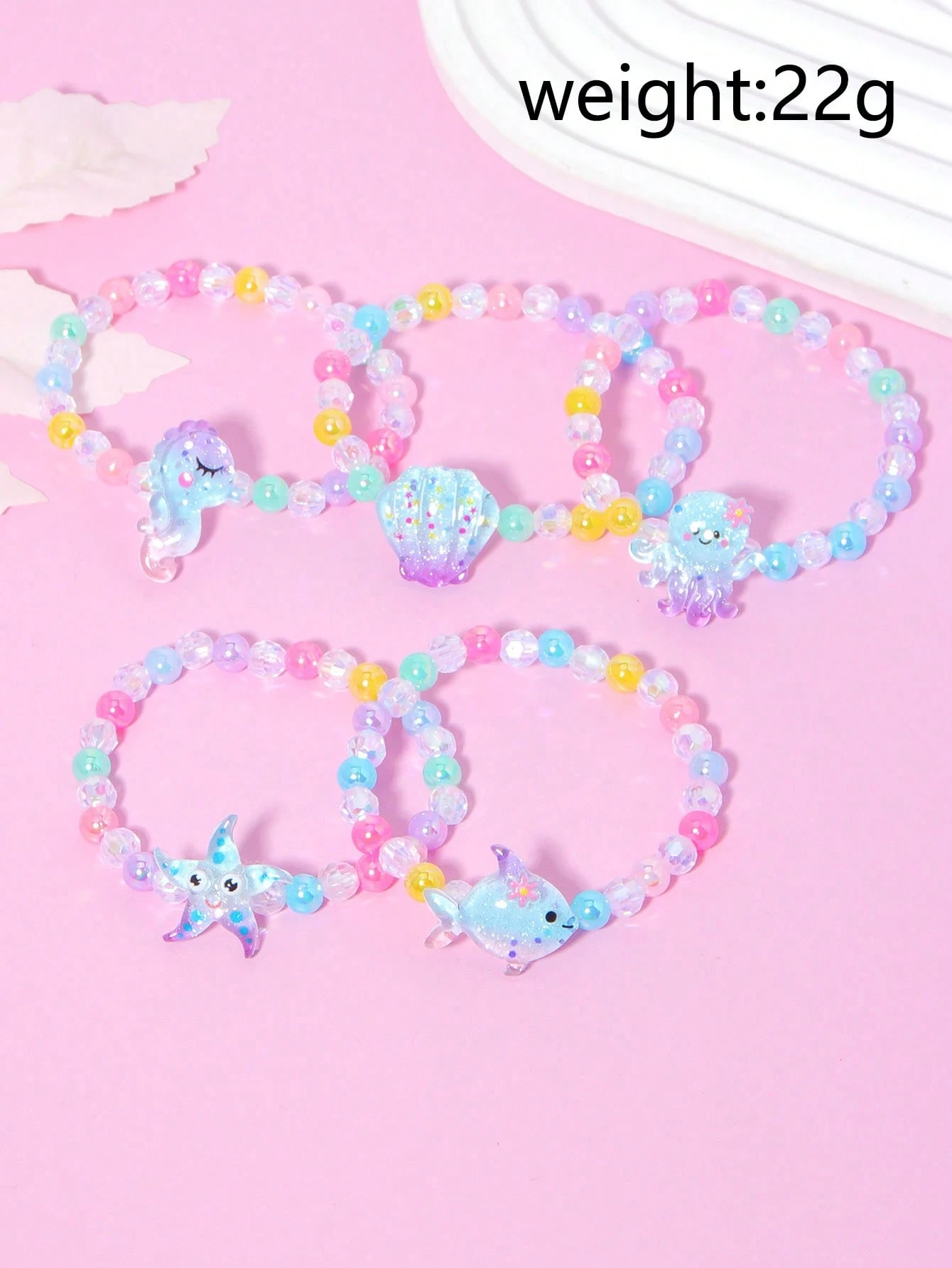 5 Bracelet et parure de bijoux avec perles représentant des thèmes marins mignons : poulpe, coquillage, poisson, hippocampe, étoile de mer. Convient pour les fêtes, l'école, les cadeaux d'anniversaire pour les filles