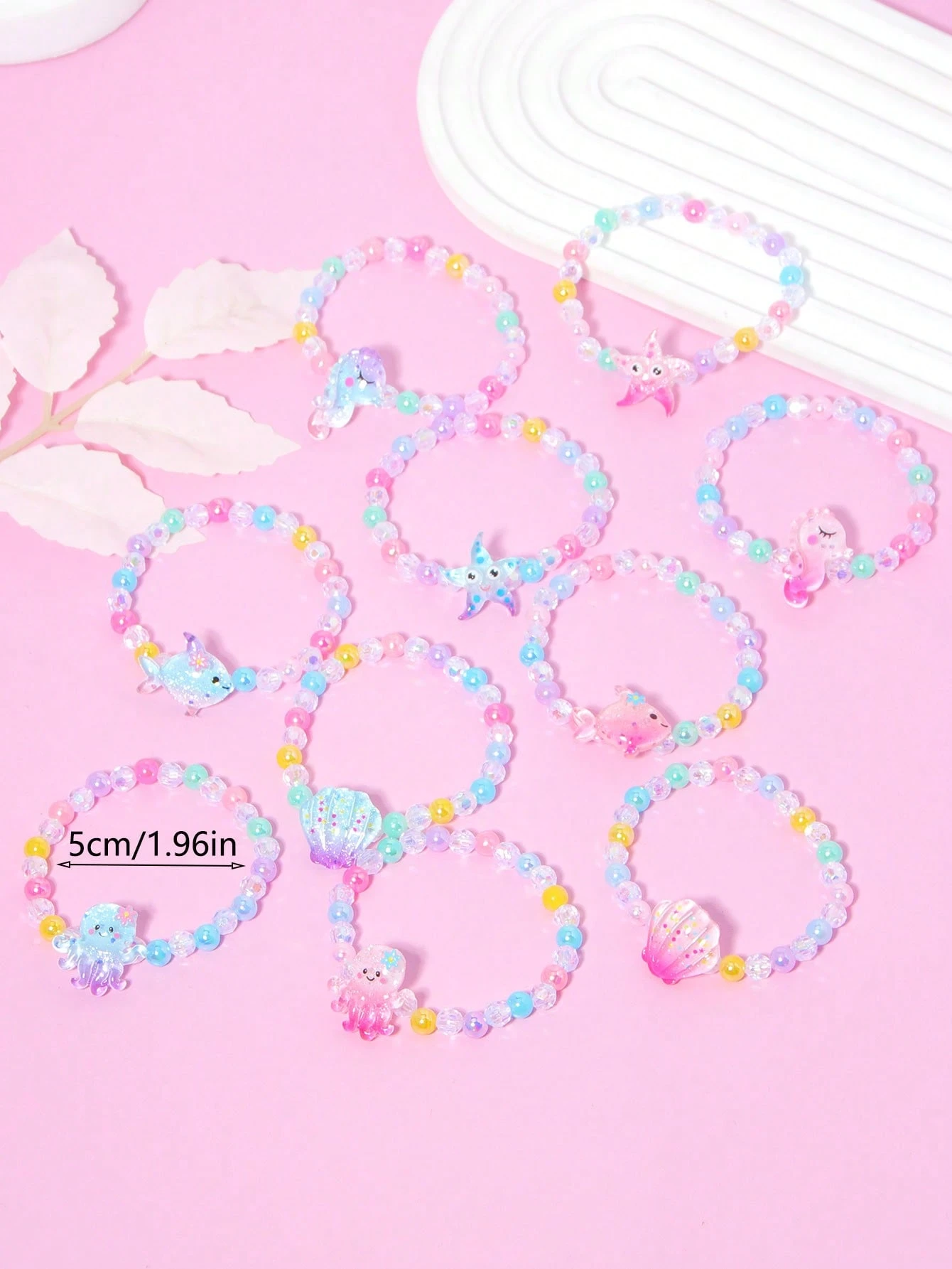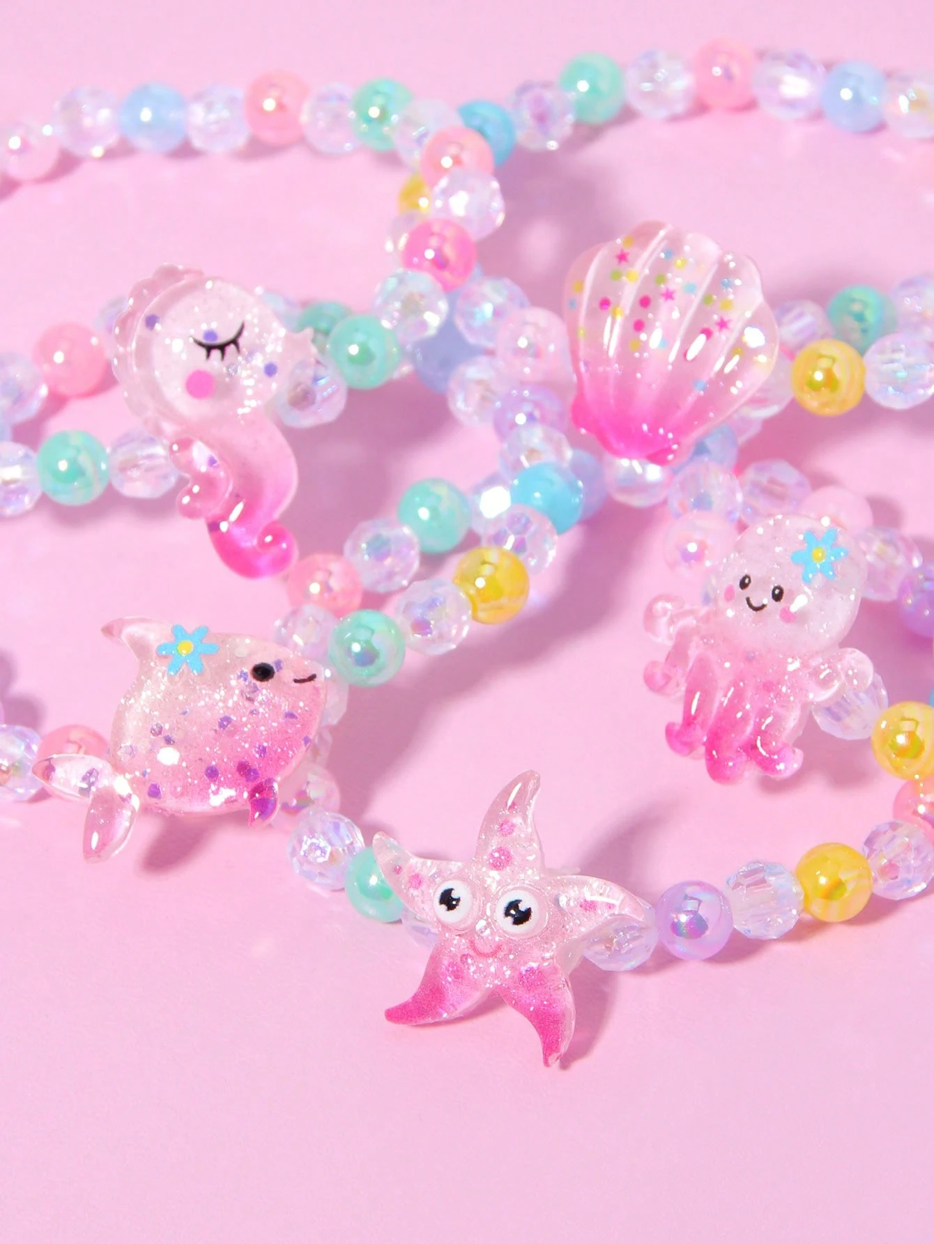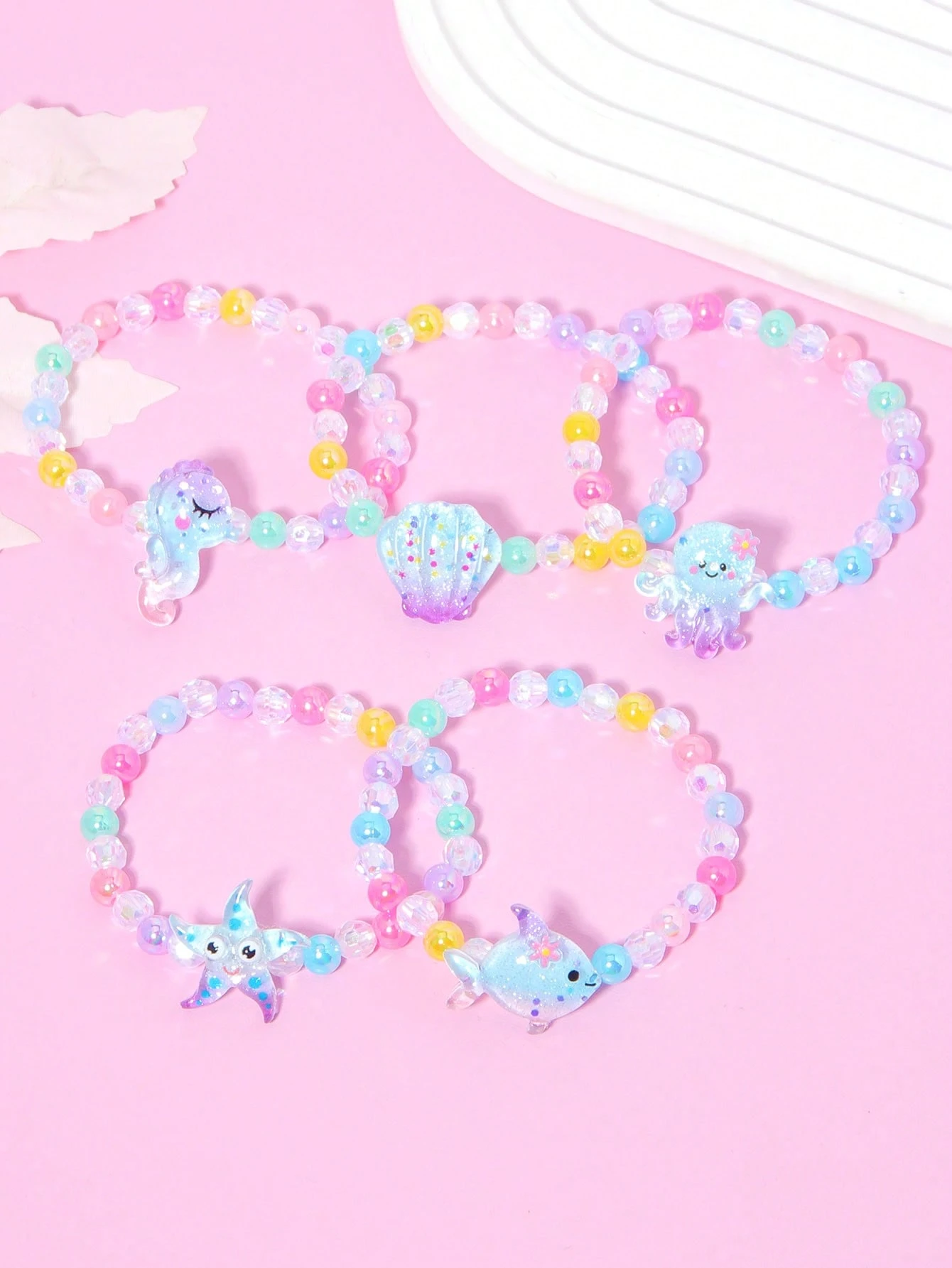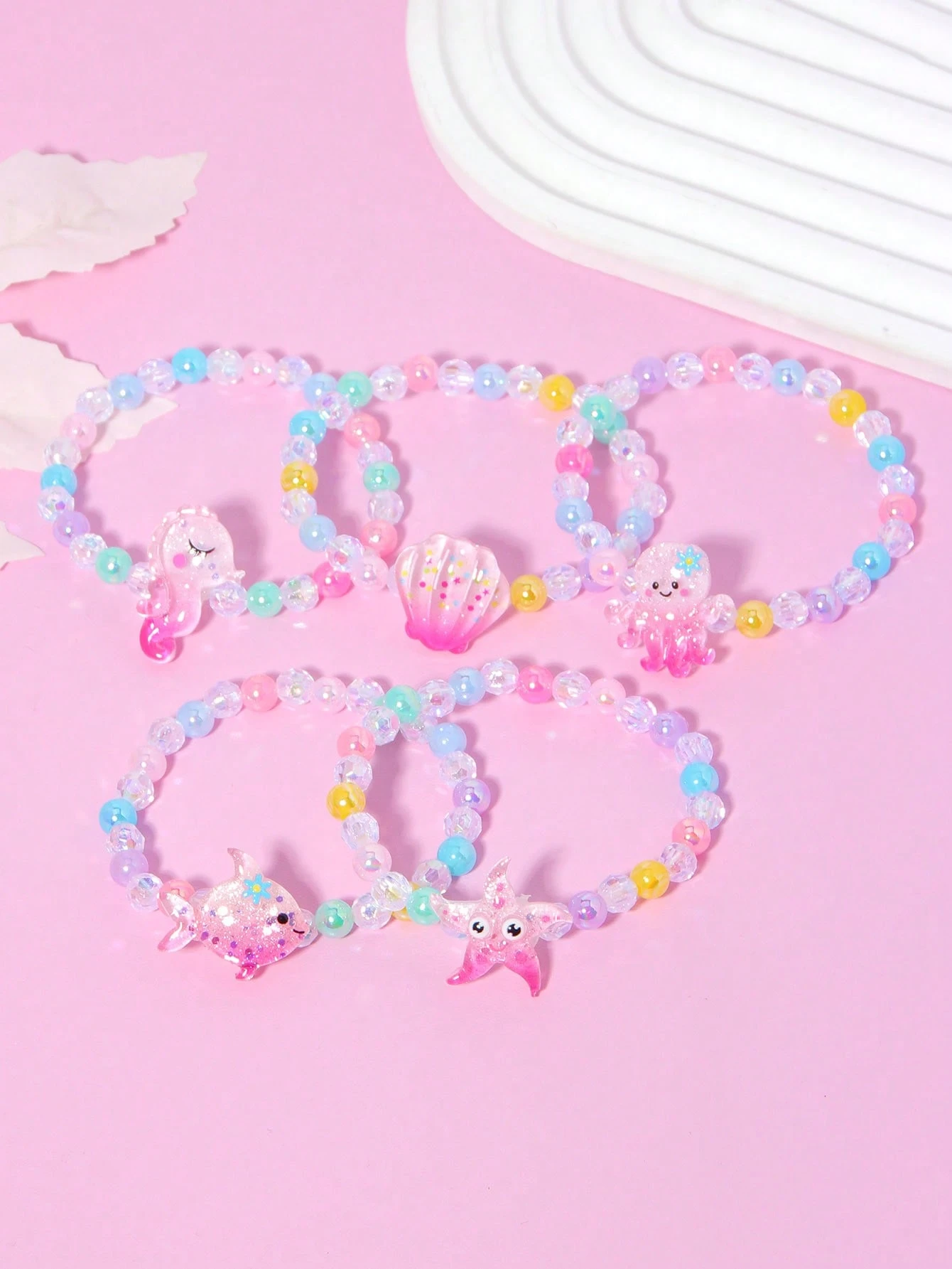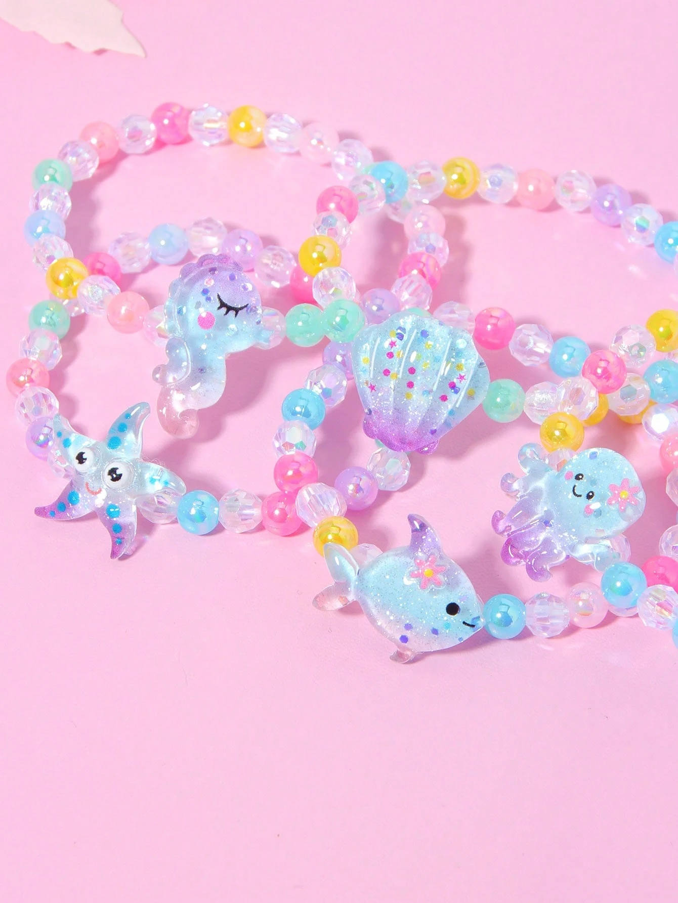 5 Bracelet et parure de bijoux avec perles représentant des thèmes marins mignons : poulpe, coquillage, poisson, hippocampe, étoile de mer. Convient pour les fêtes, l'école, les cadeaux d'anniversaire pour les filles