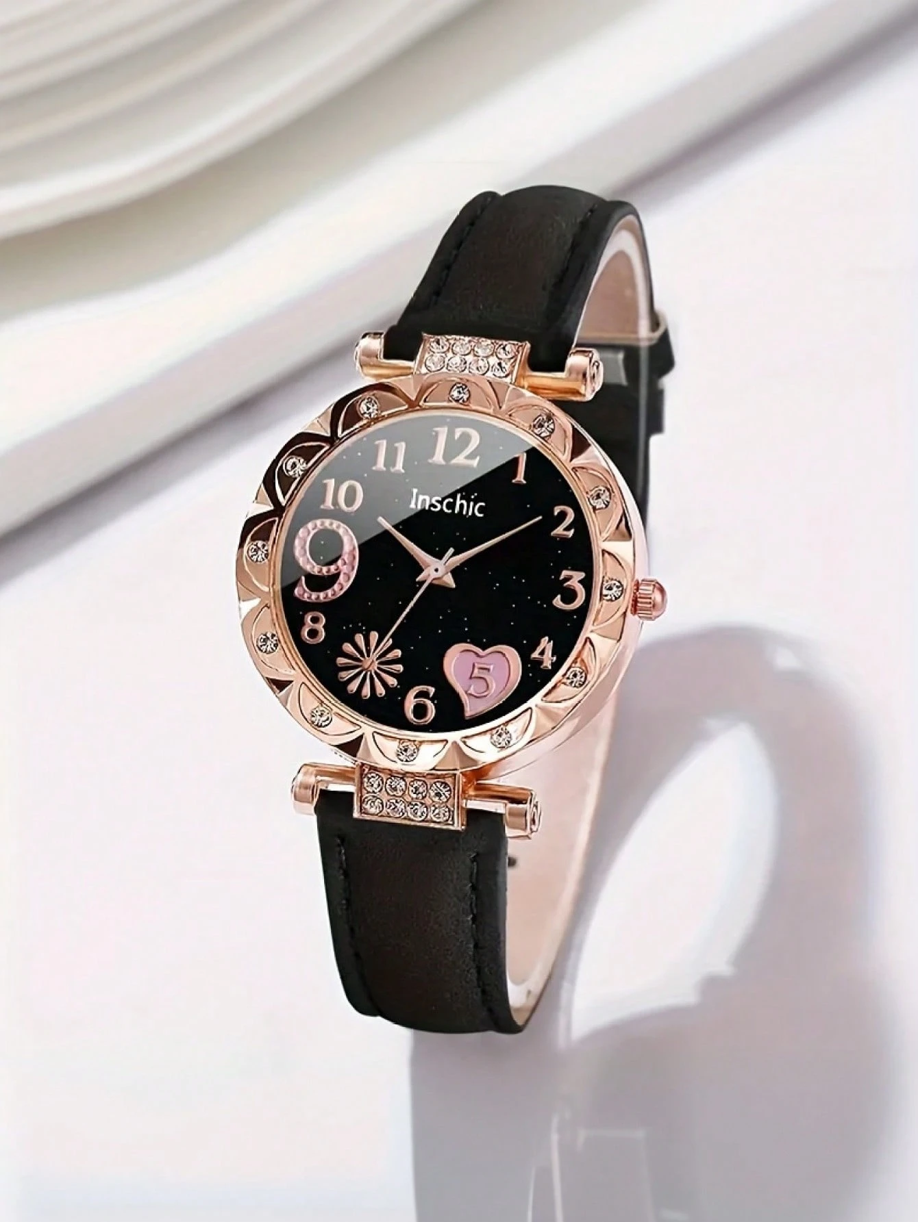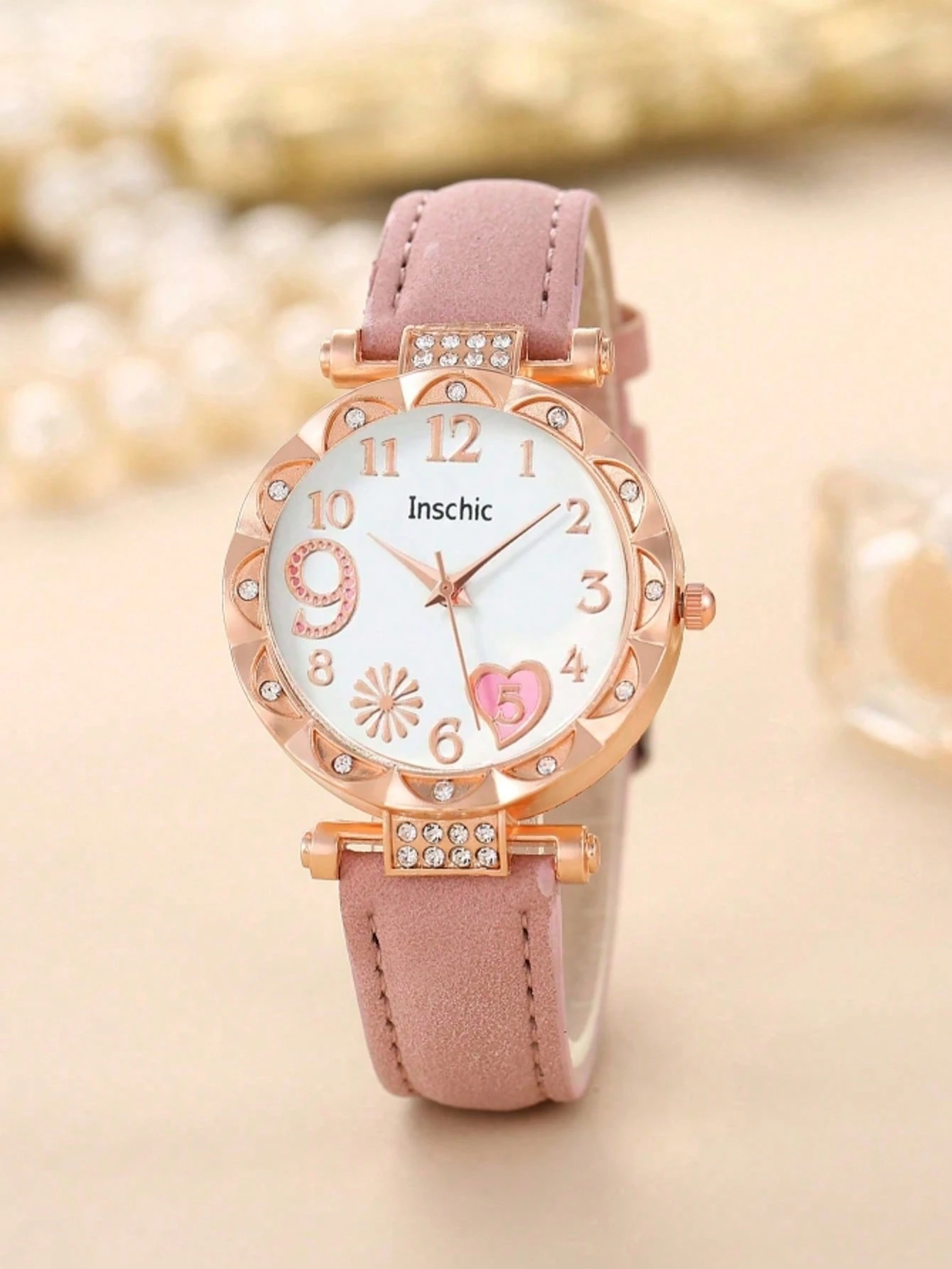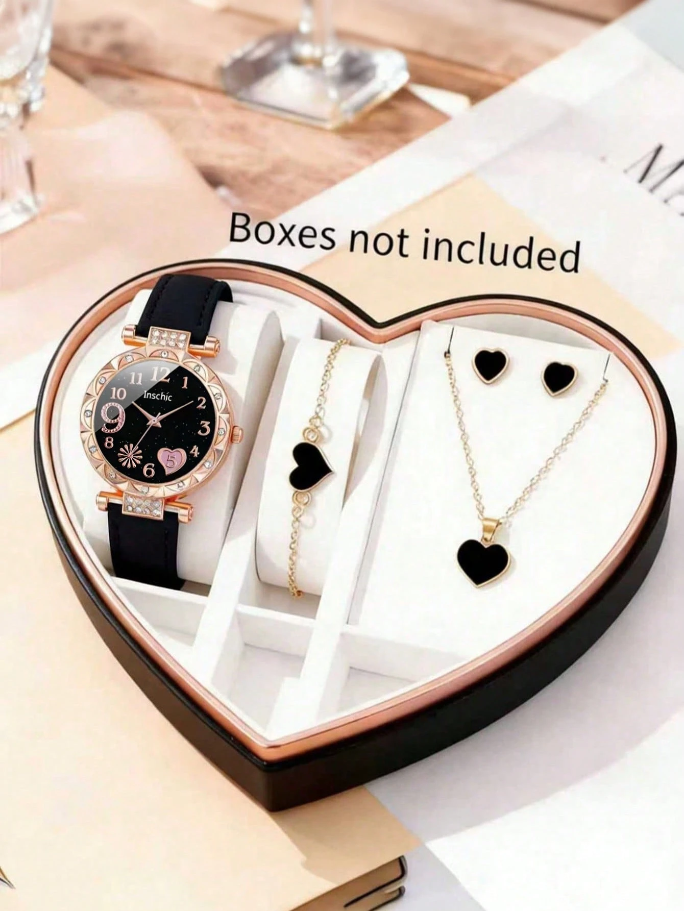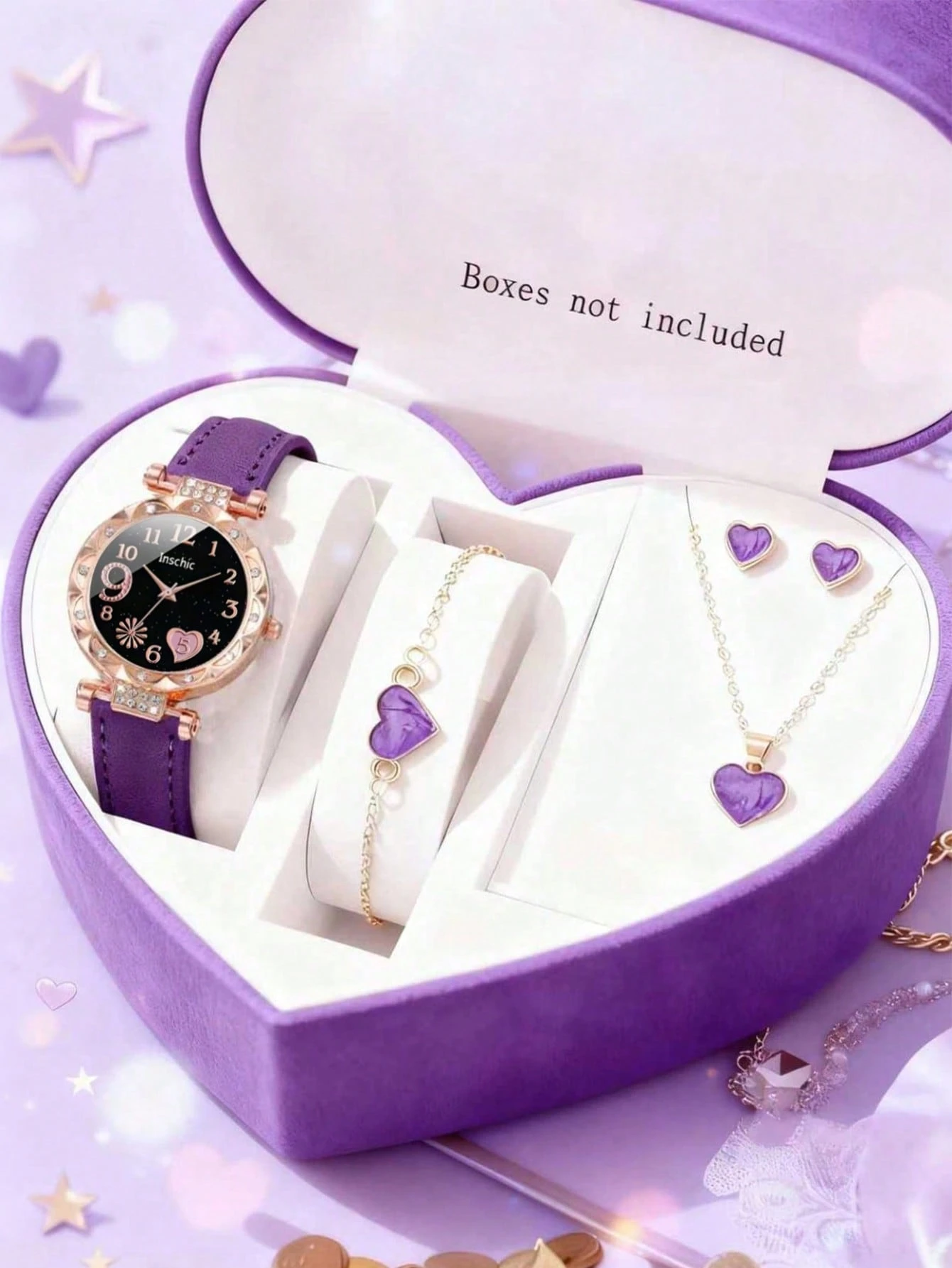 5 pièces Montre à quartz élégante avec cadran en forme de cœur et de feu d'artifice pour filles, convient pour le port par les filles. Ensemble assorti comprenant un collier, un bracelet et des boucles d'oreilles en forme de cœur. Cadeau parfait pour les
