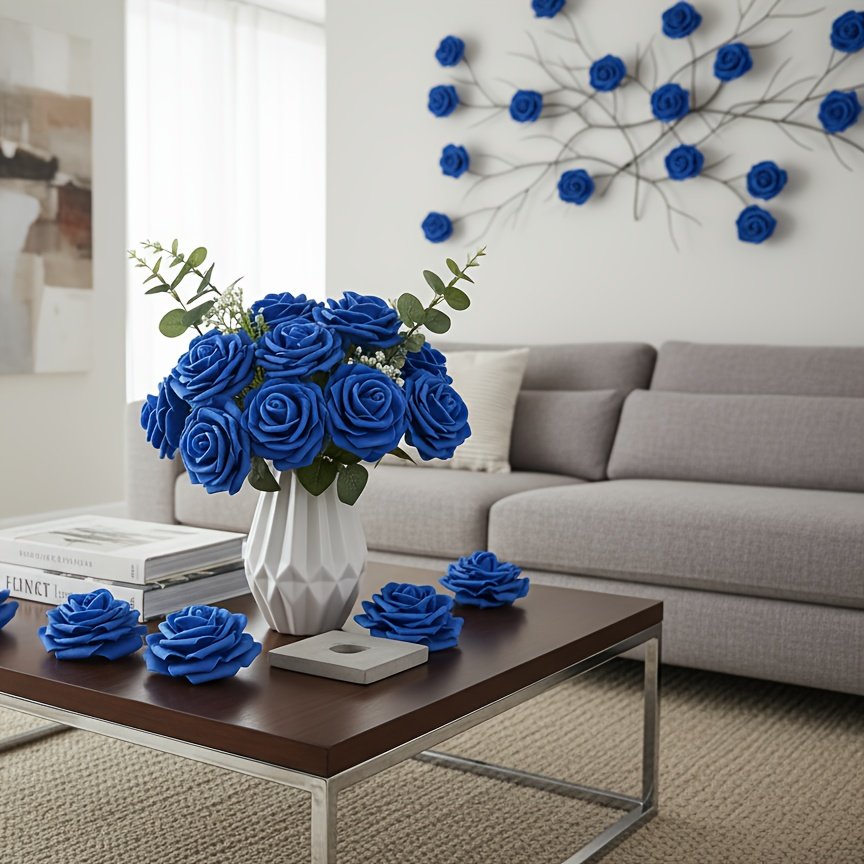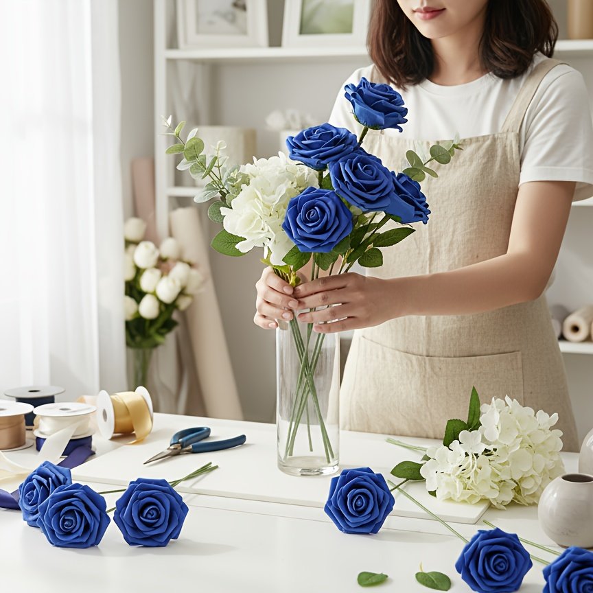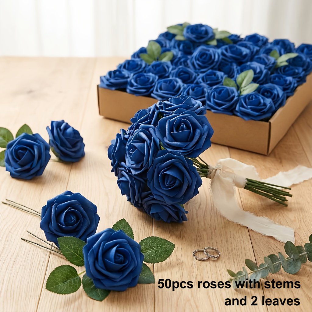 50 Roses Artificielles, Chacune avec 2 Feuilles de Rose, Tiges Flexibles Pliables à Volonté, Fleurs en Mousse Bleue Élégantes et Réalistes, Idéales pour Bouquets de Mariage, Saint-Valentin, Halloween et Bouquets DIY, Durables et Sans Entretien
