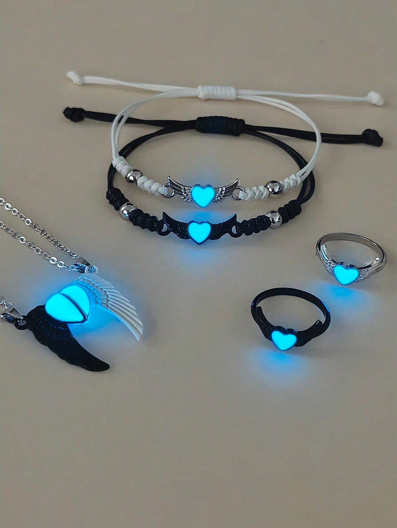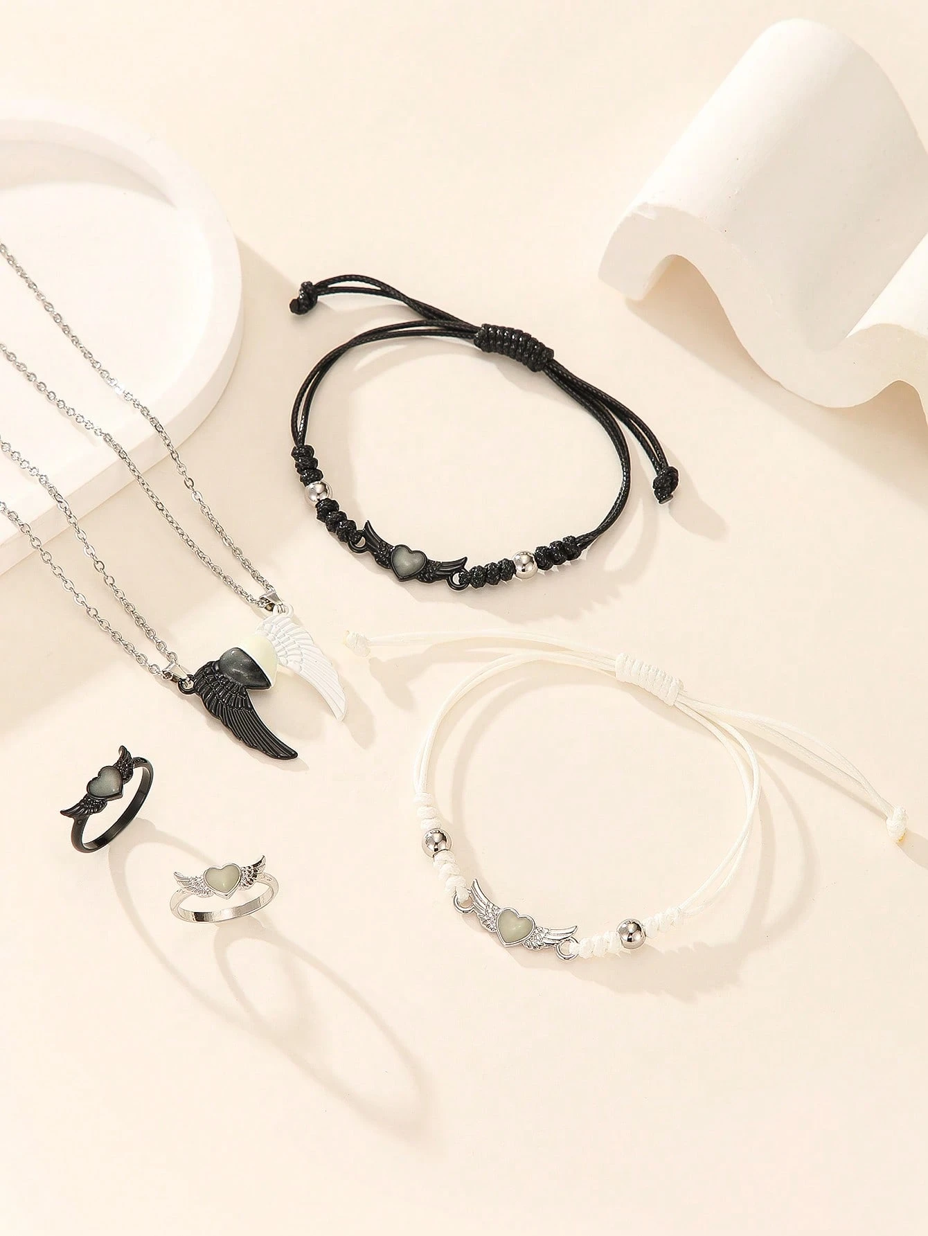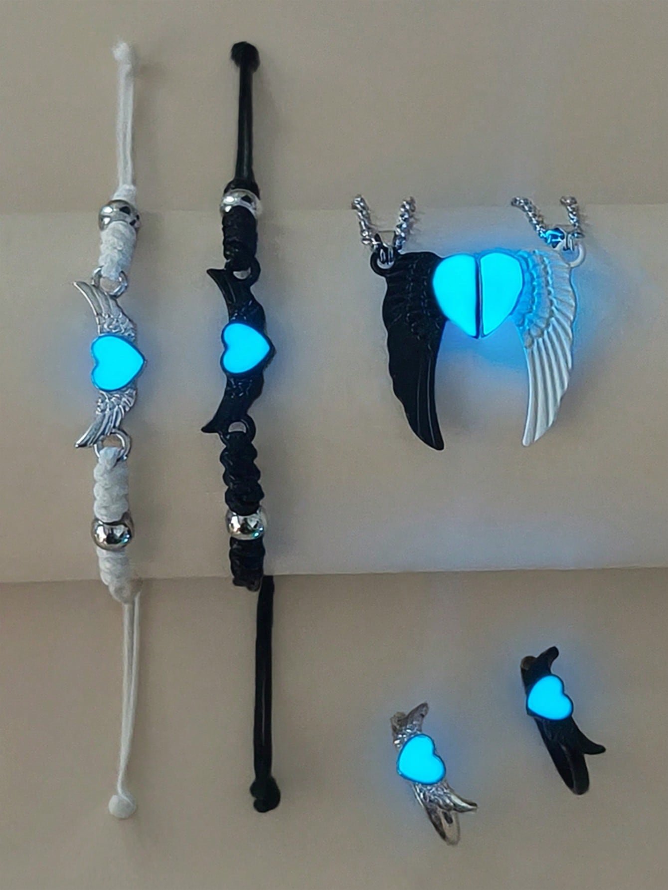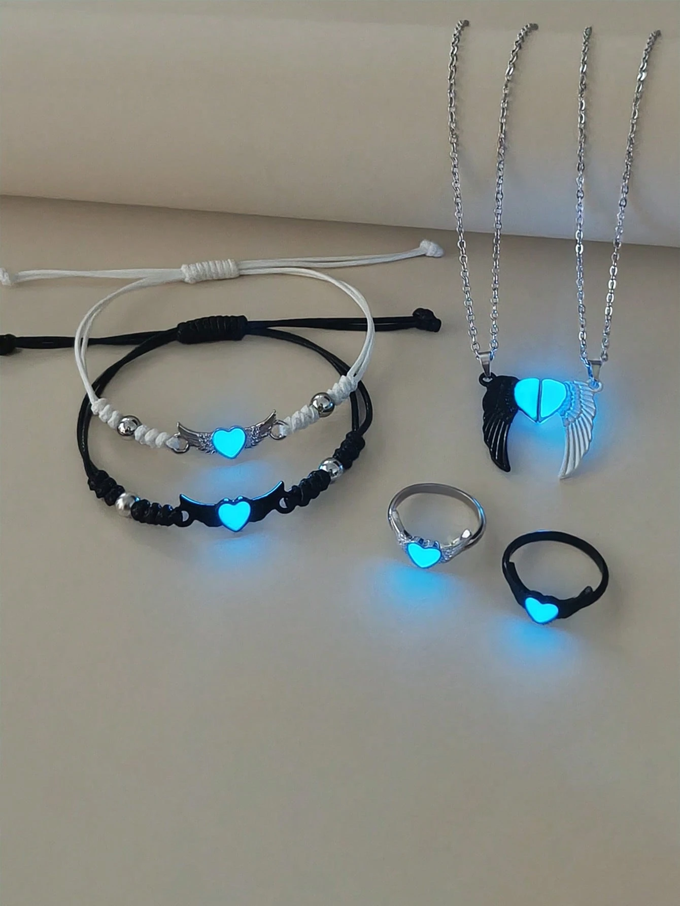 6 pièces/set Collier, bracelet et bague en acier inoxydable avec ailes d’ange phosphorescentes pour couple/amitié. Accessoires de couple décontractés convenant pour un port quotidien et un cadeau pour la Saint-Valentin