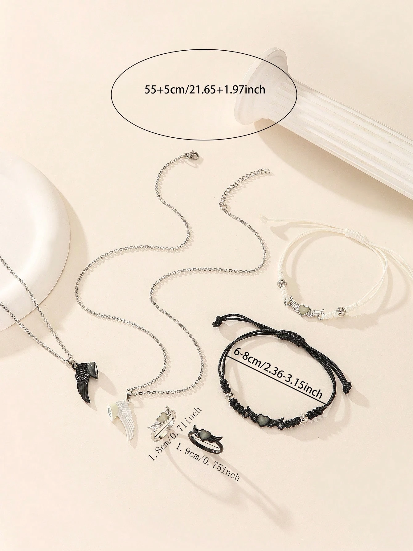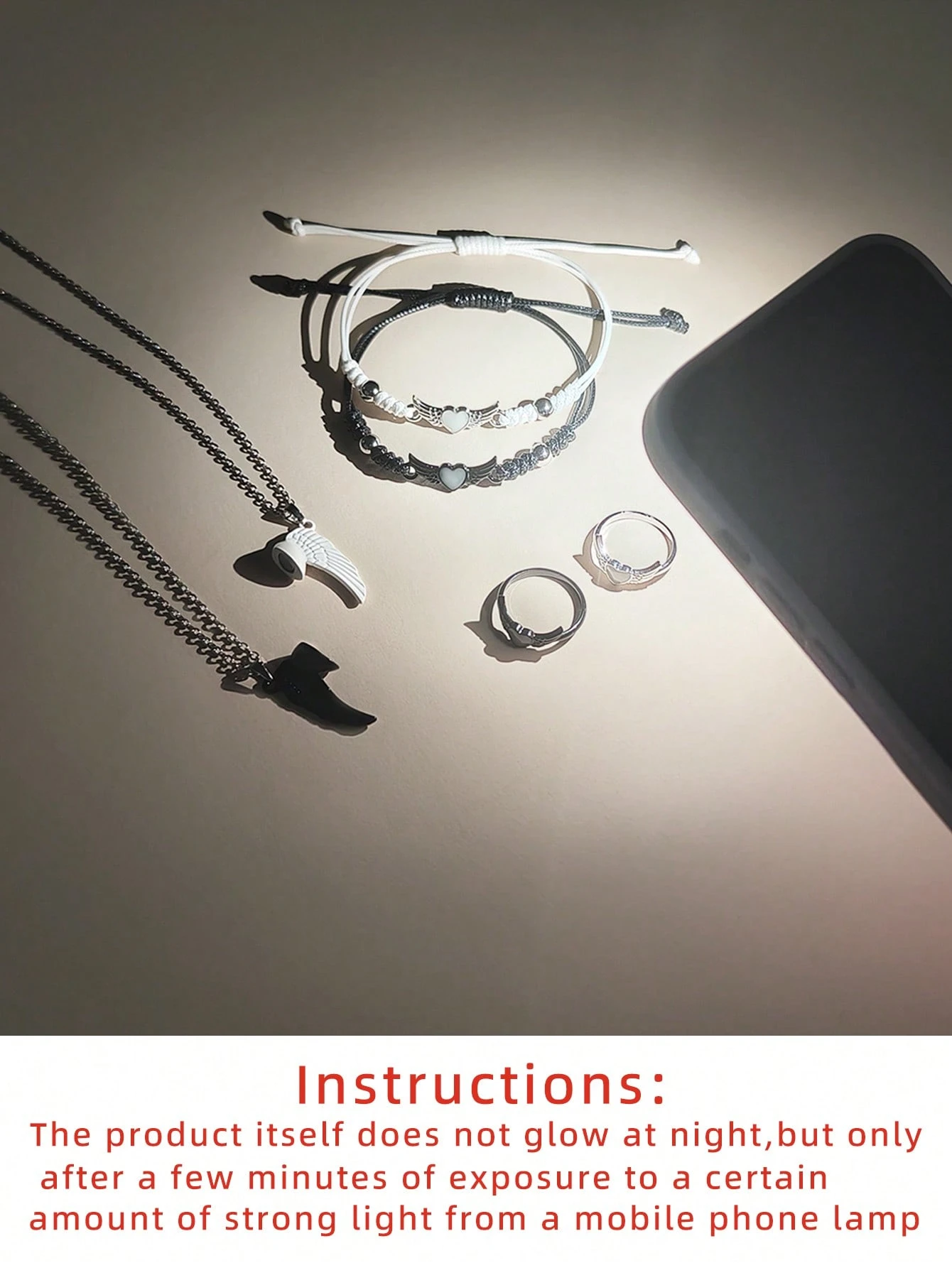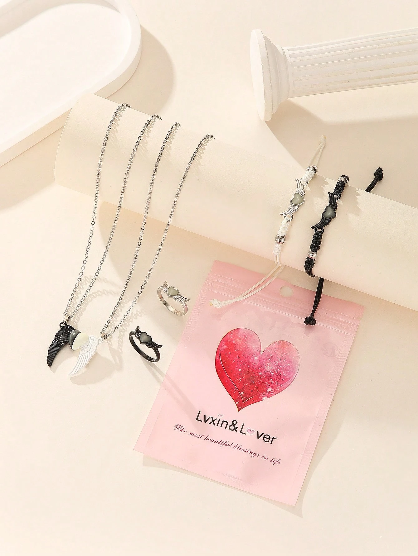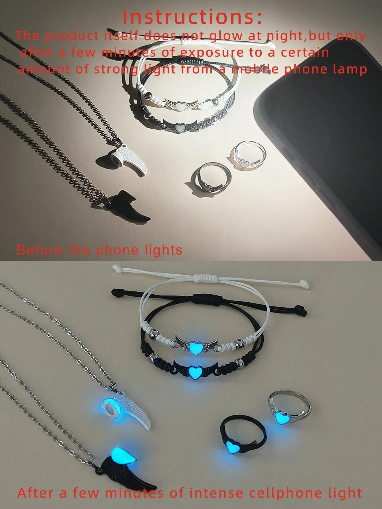 6 pièces/set Collier, bracelet et bague en acier inoxydable avec ailes d’ange phosphorescentes pour couple/amitié. Accessoires de couple décontractés convenant pour un port quotidien et un cadeau pour la Saint-Valentin