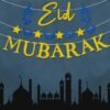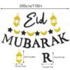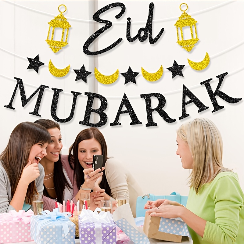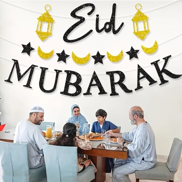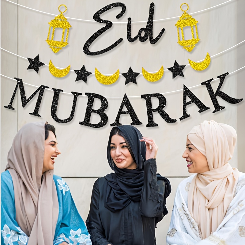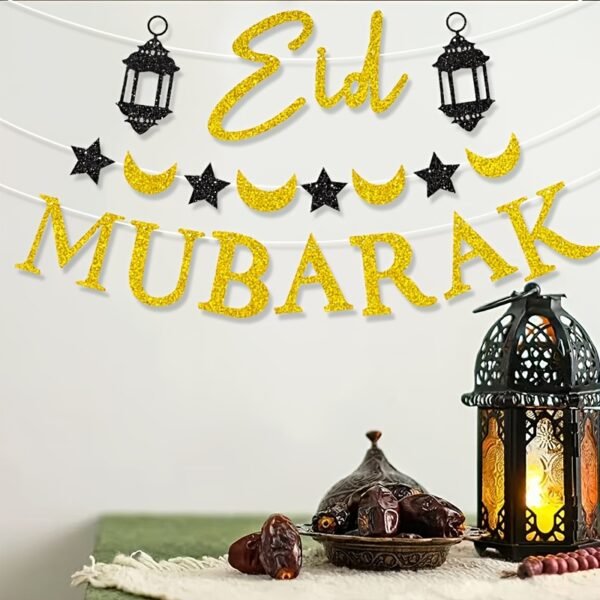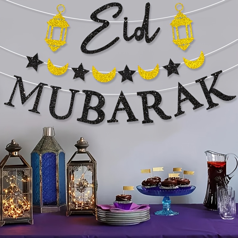 Bannière de Fête Eid Mubarak avec Étoile, Lune, Lanterne, Lettres Noires, Dorées et Bleues, Décoration de Fête, Guirlande de Lettres Pailletées Lune