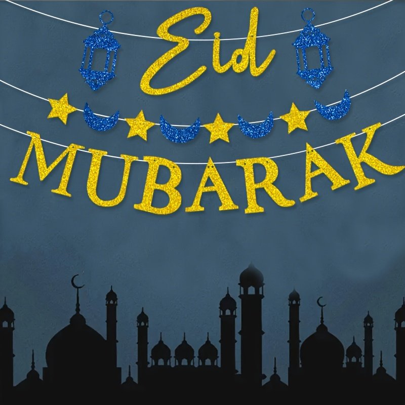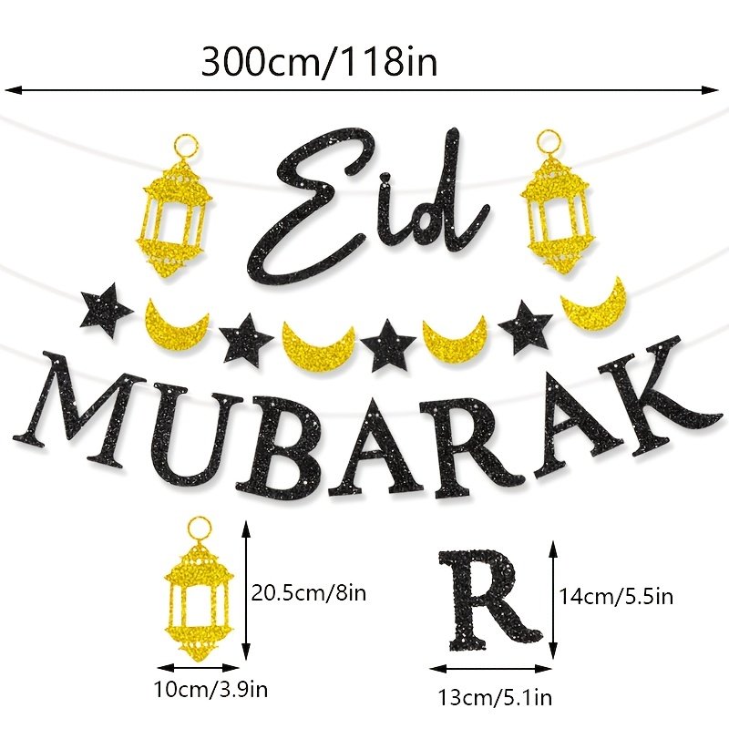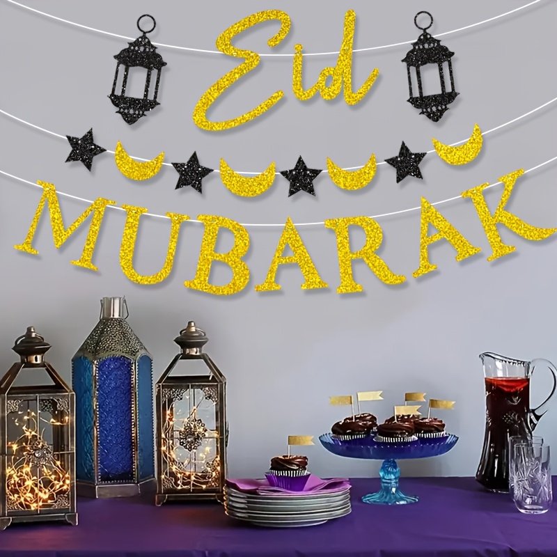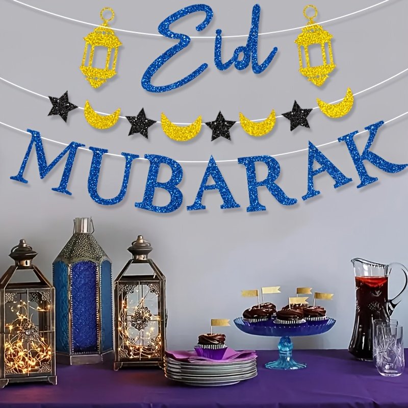 Bannière de Fête Eid Mubarak avec Étoile, Lune, Lanterne, Lettres Noires, Dorées et Bleues, Décoration de Fête, Guirlande de Lettres Pailletées Lune