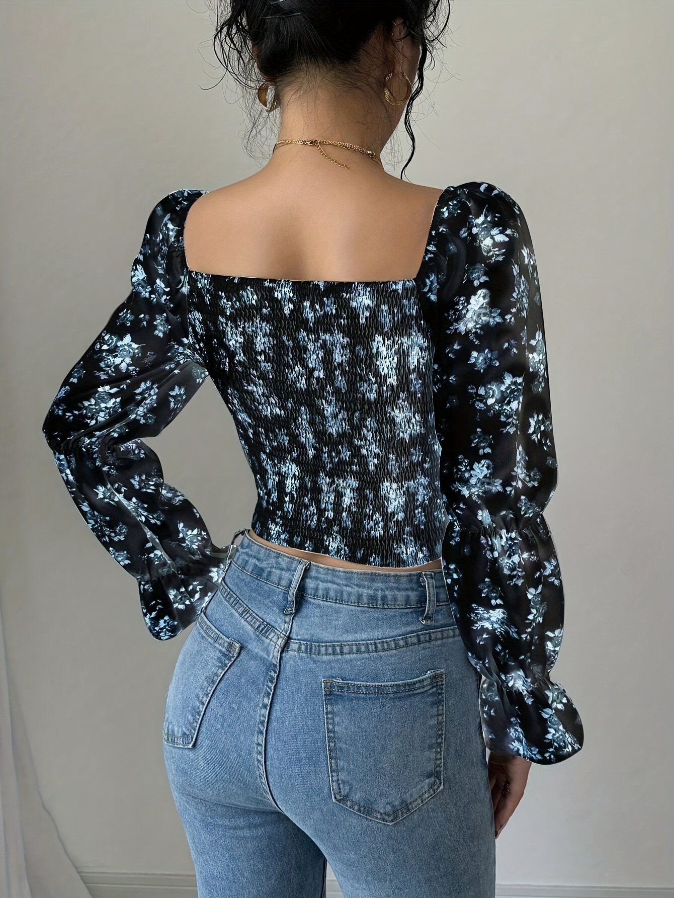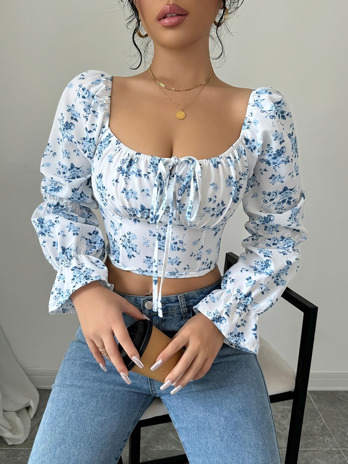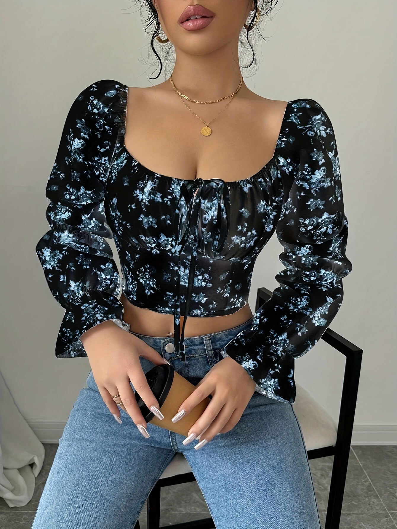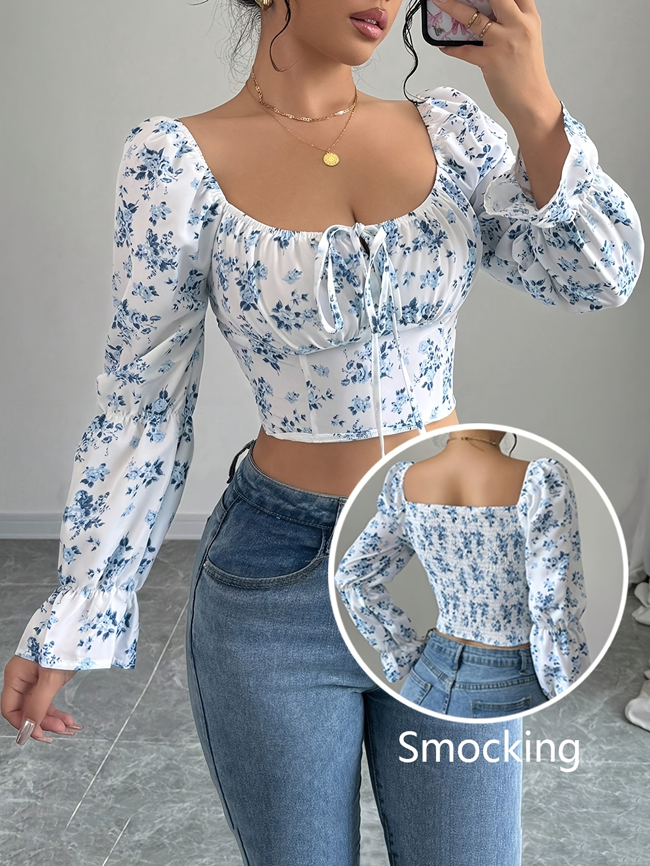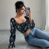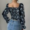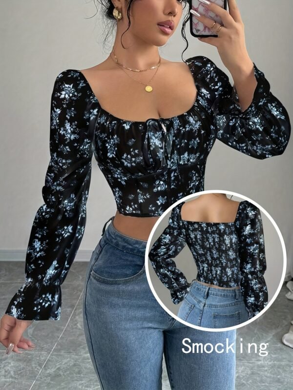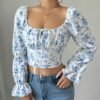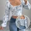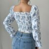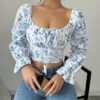 Blouse à col carré floral blanc pour femme avec manches cloche à volants