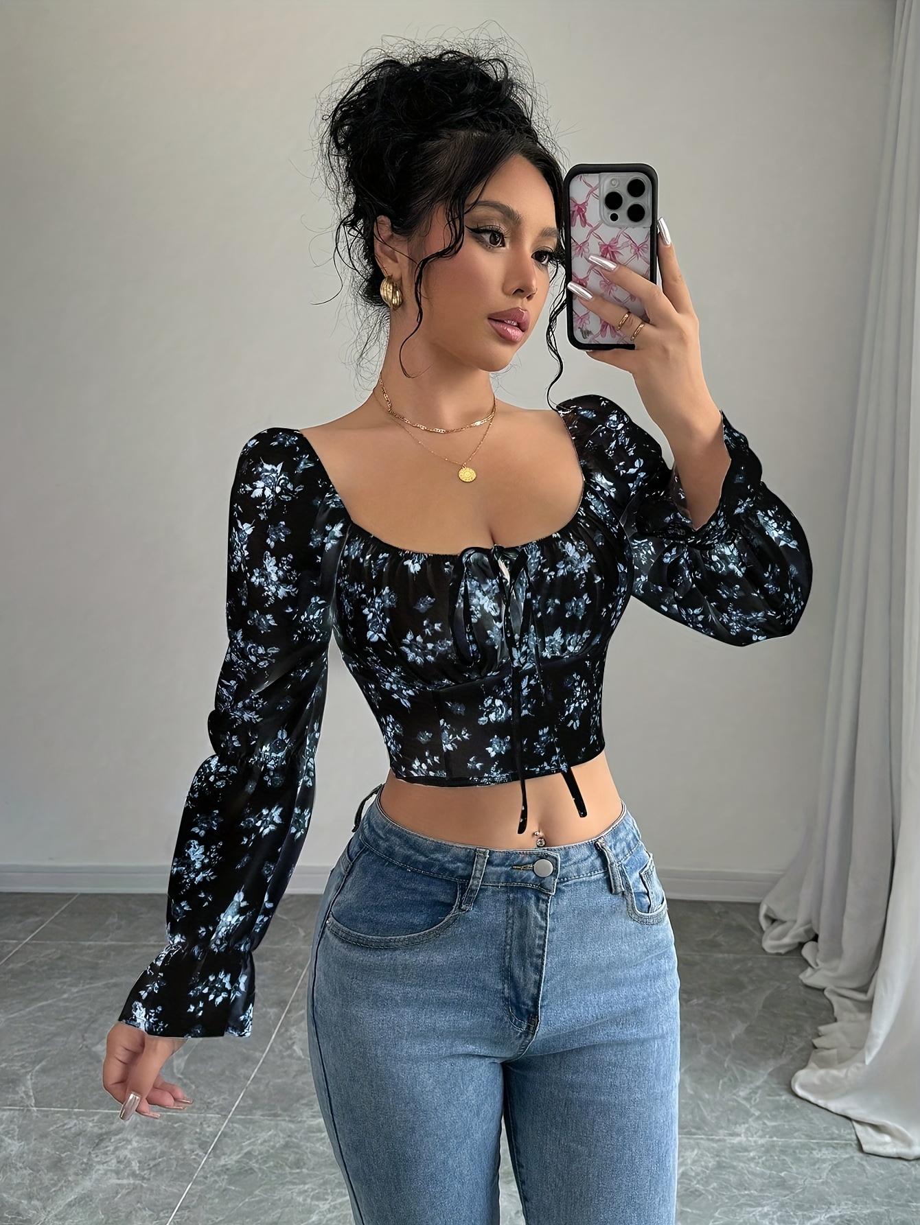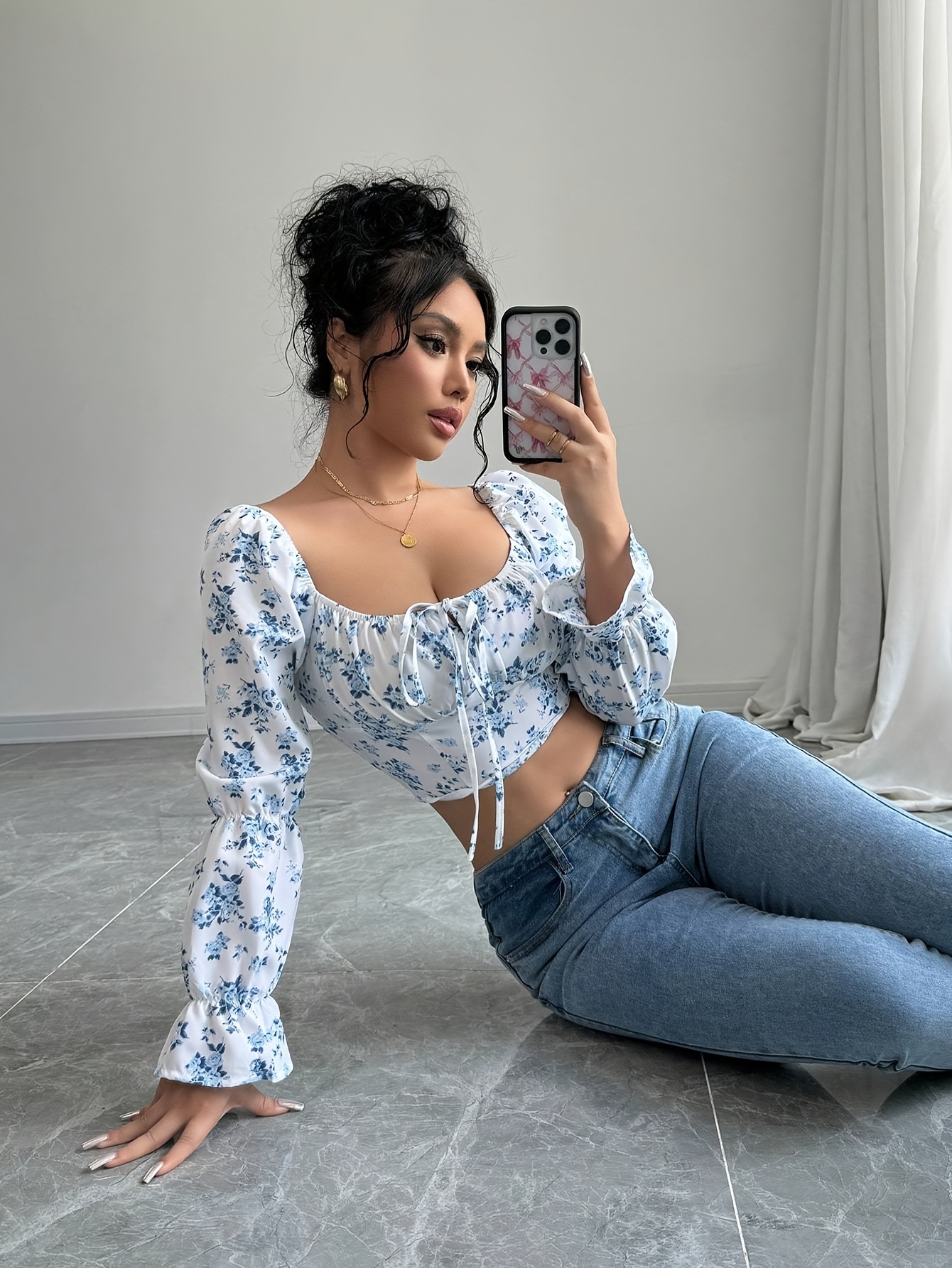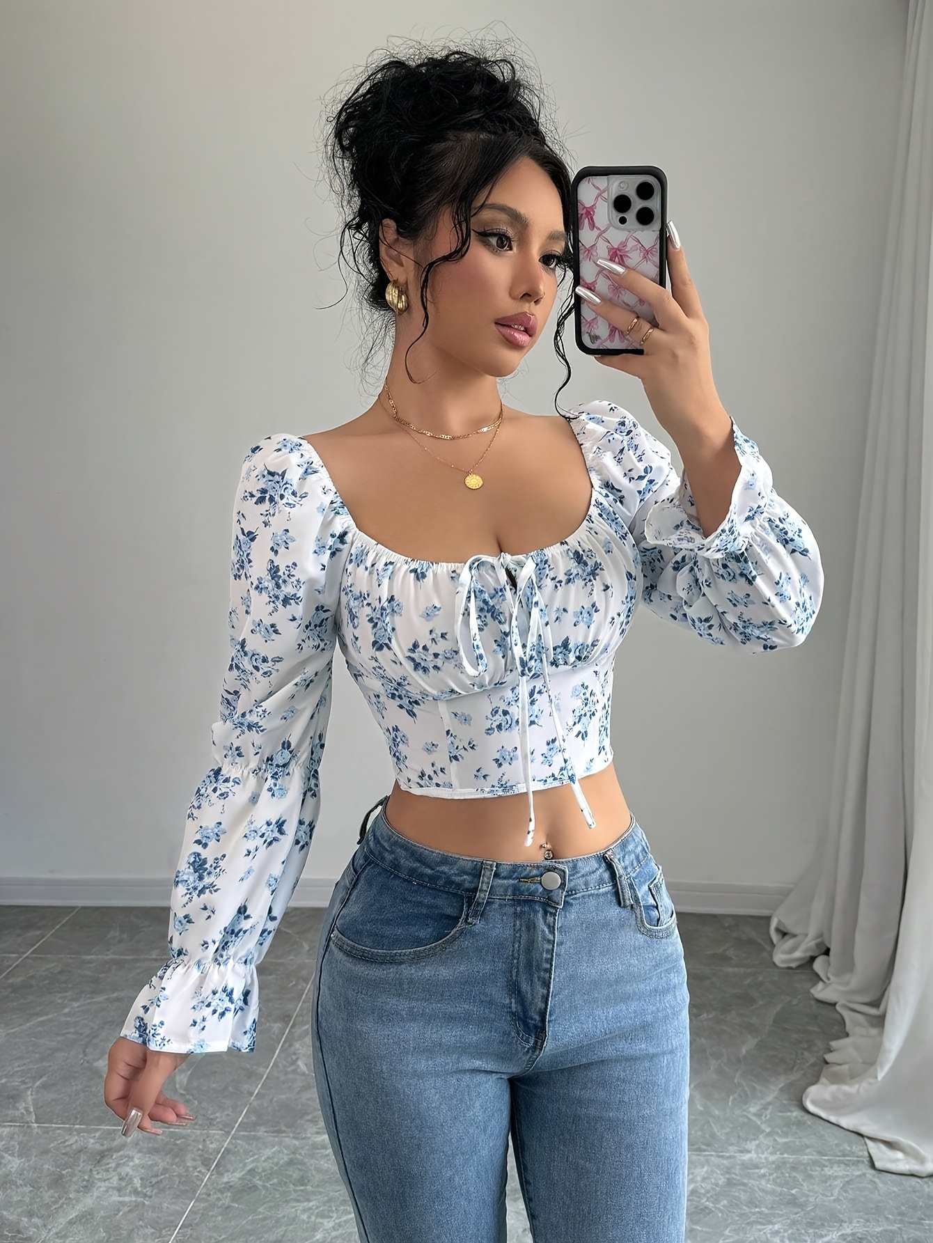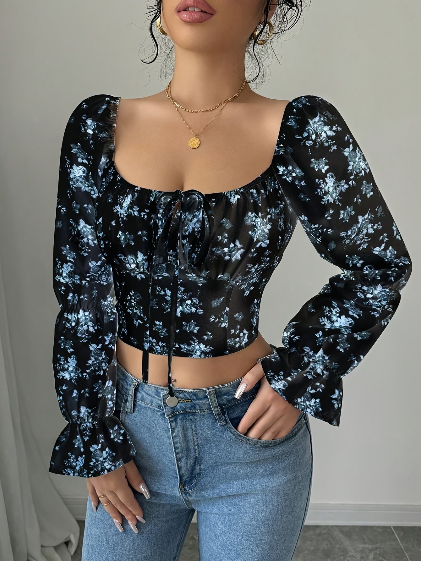Blouse à col carré floral blanc pour femme avec manches cloche à volants
