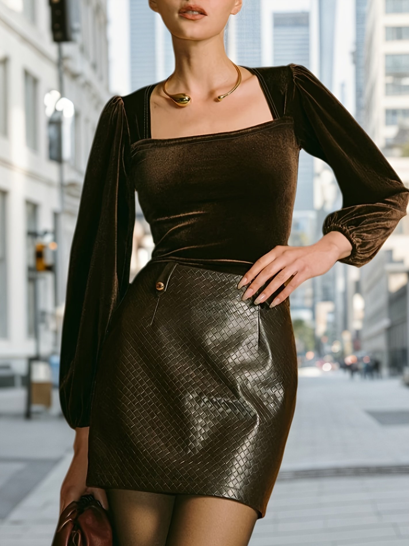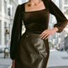 Blouse élégante à manches longues Col carré chic, tissu velours