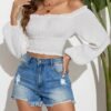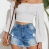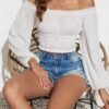 Blouse Élégante Femme à Manches Bouffantes et Bretelles Dénudées avec Ourlet Froncé – Léger, Semi-Transparent, Lavable en Machine pour Printemps, Été, Automne, Haut Décontracté ou Chic, Mode Saisonnière, Top Estival Aéré avec Détails de Boutons Décoratifs