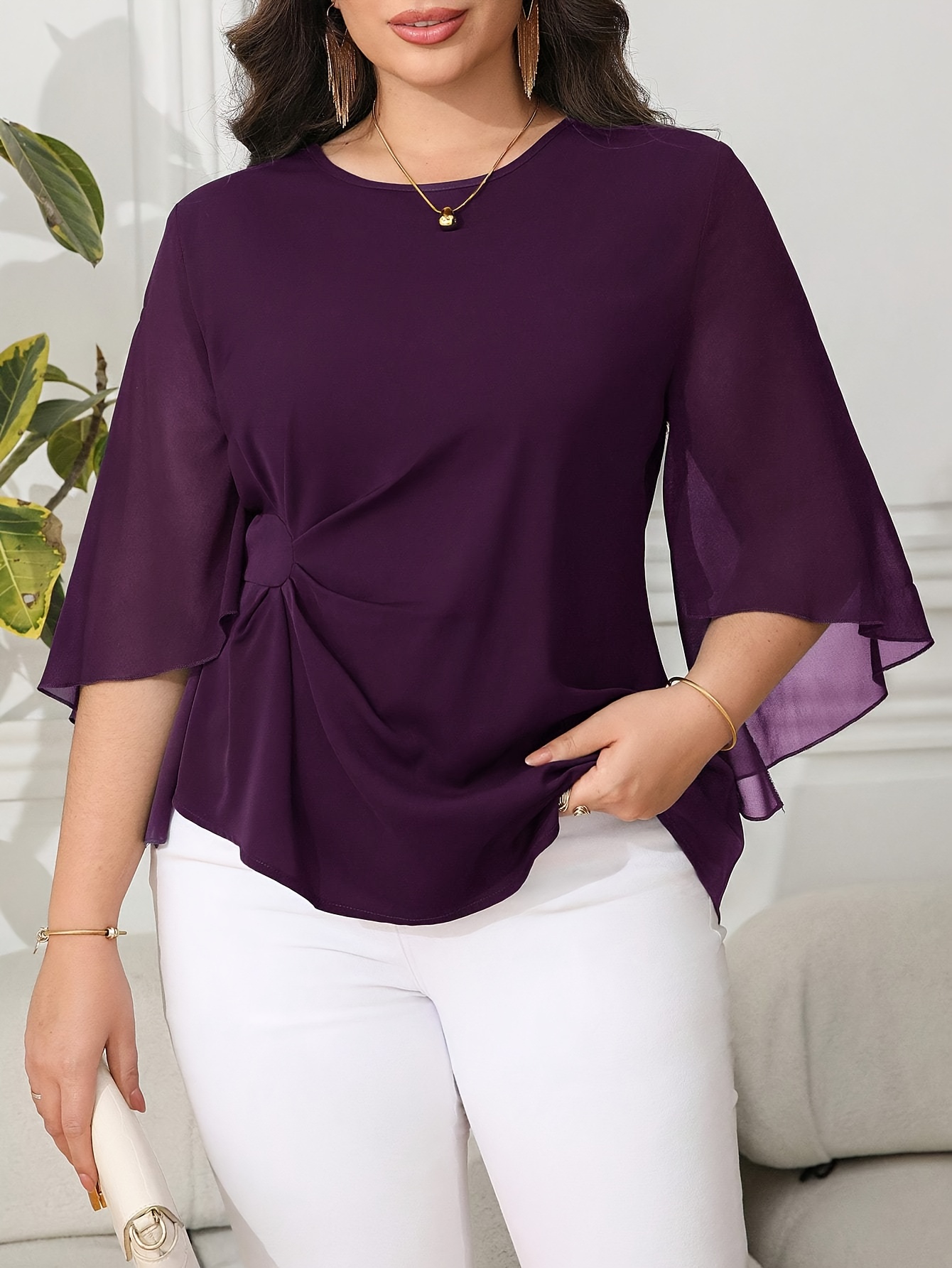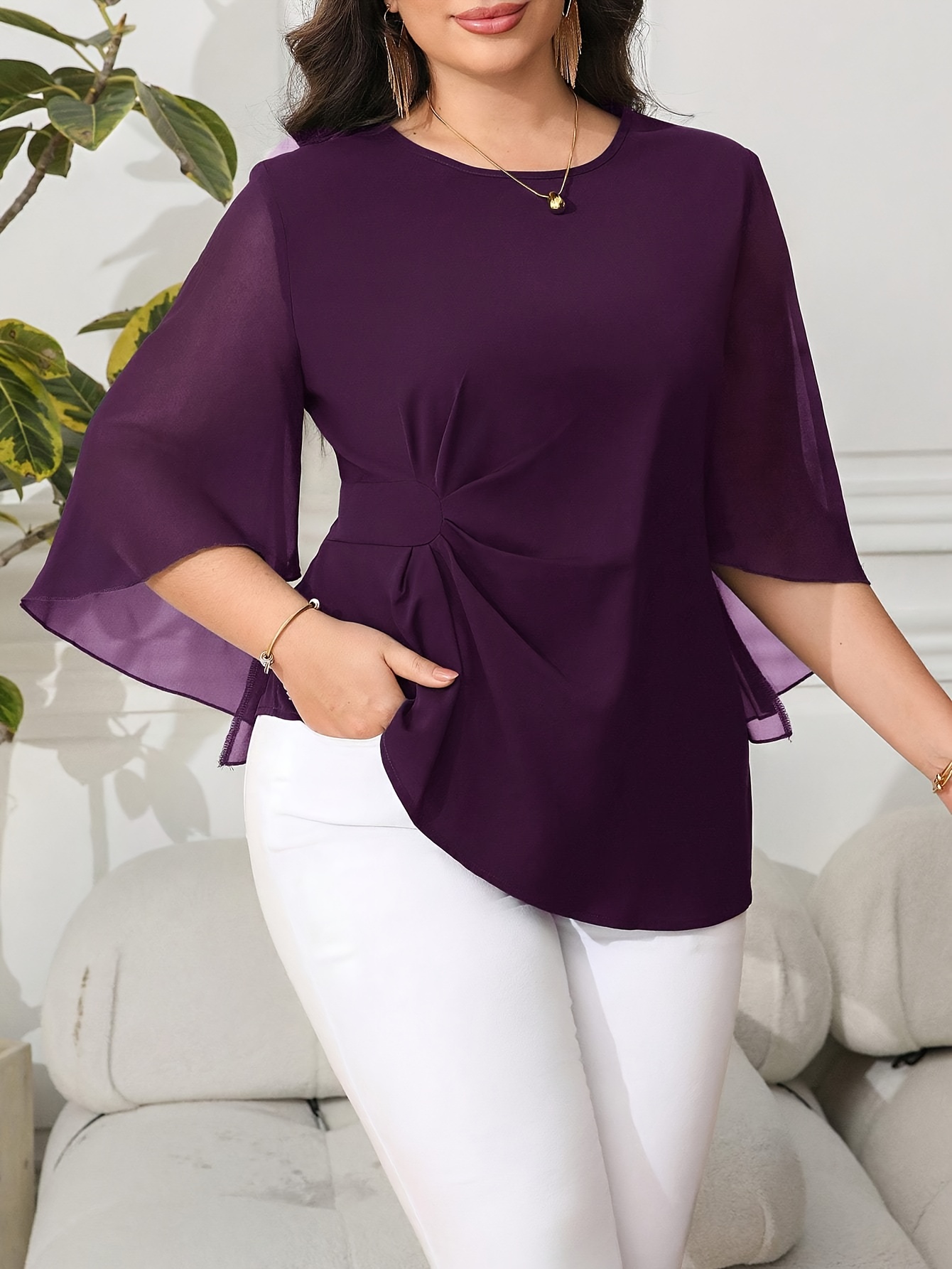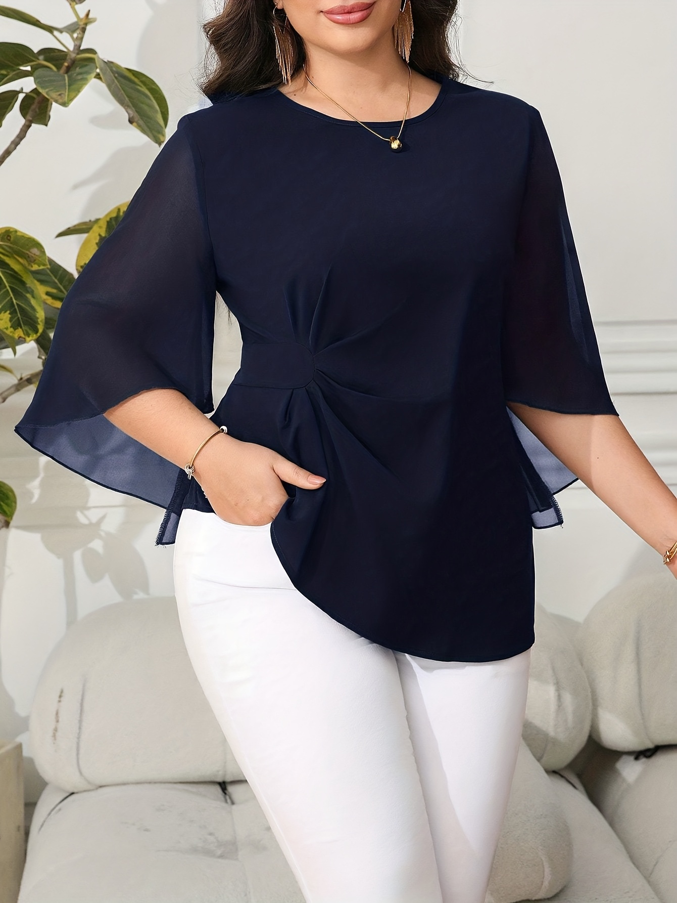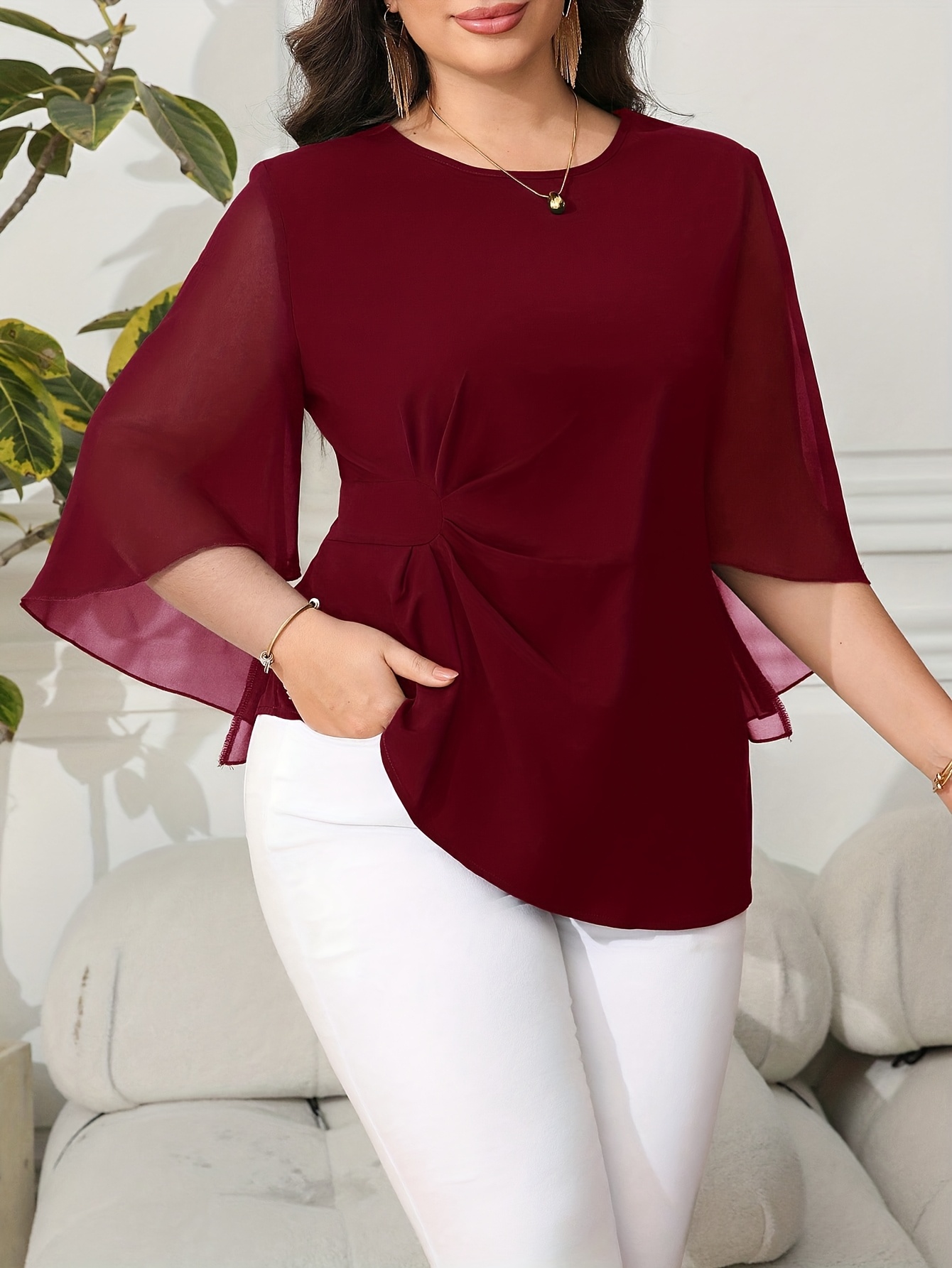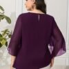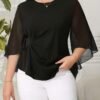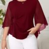 Blouse grande taille pour femme, classique, unie, simple, élégante, décontractée, quotidienne, à col rond, manches mi-longues à volants irréguliers, tenue de bureau professionnelle digne pour femme ronde
