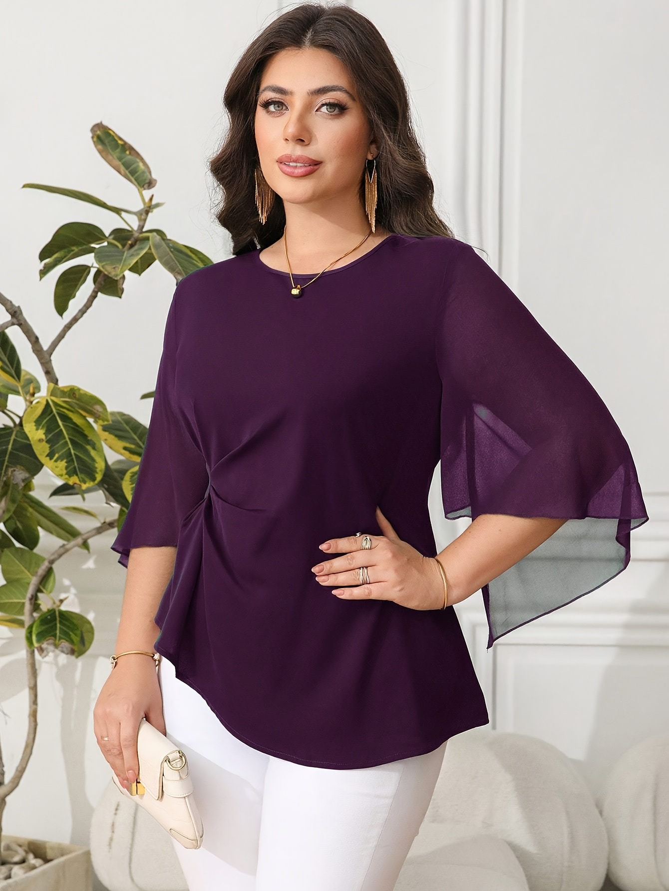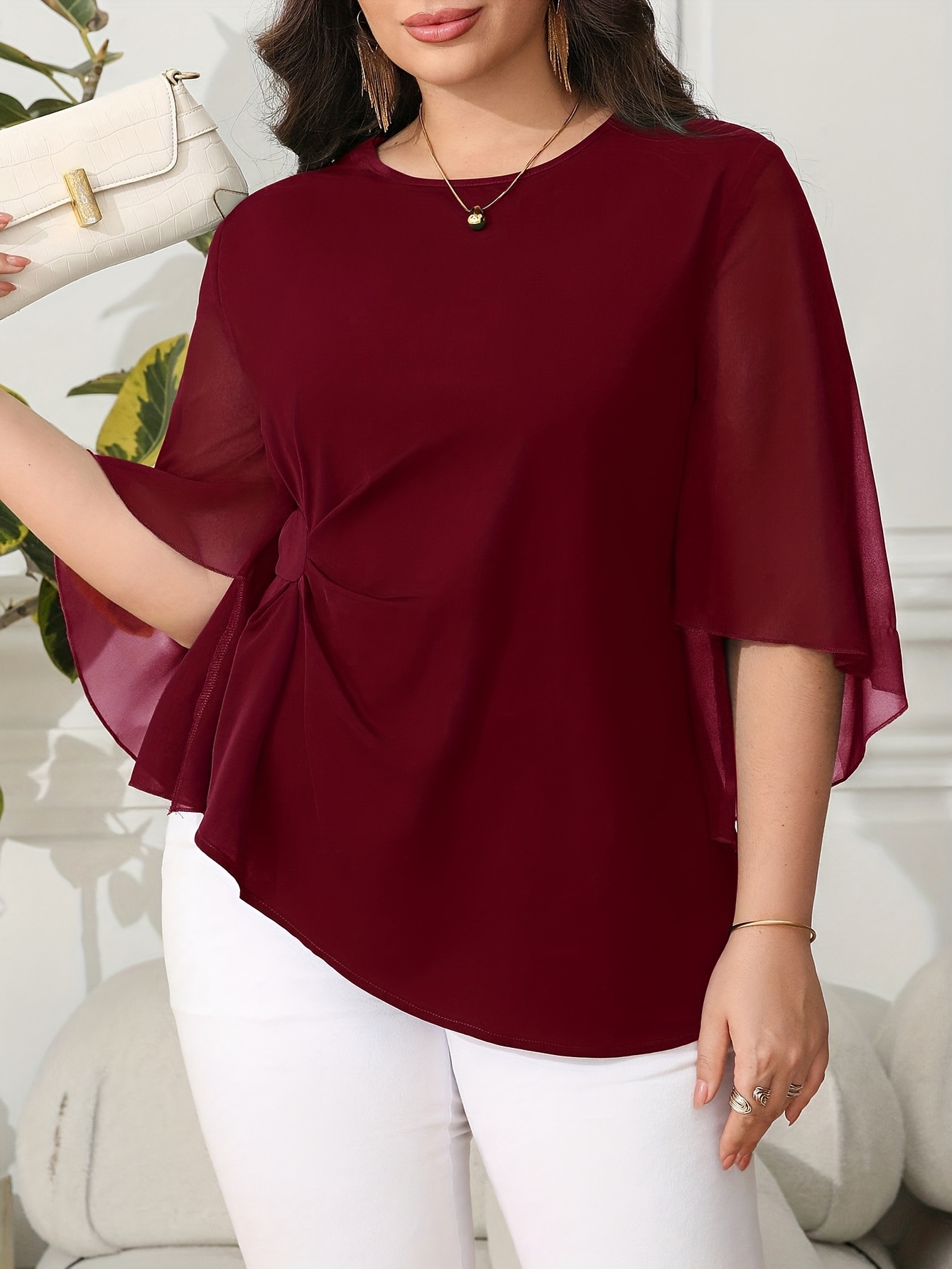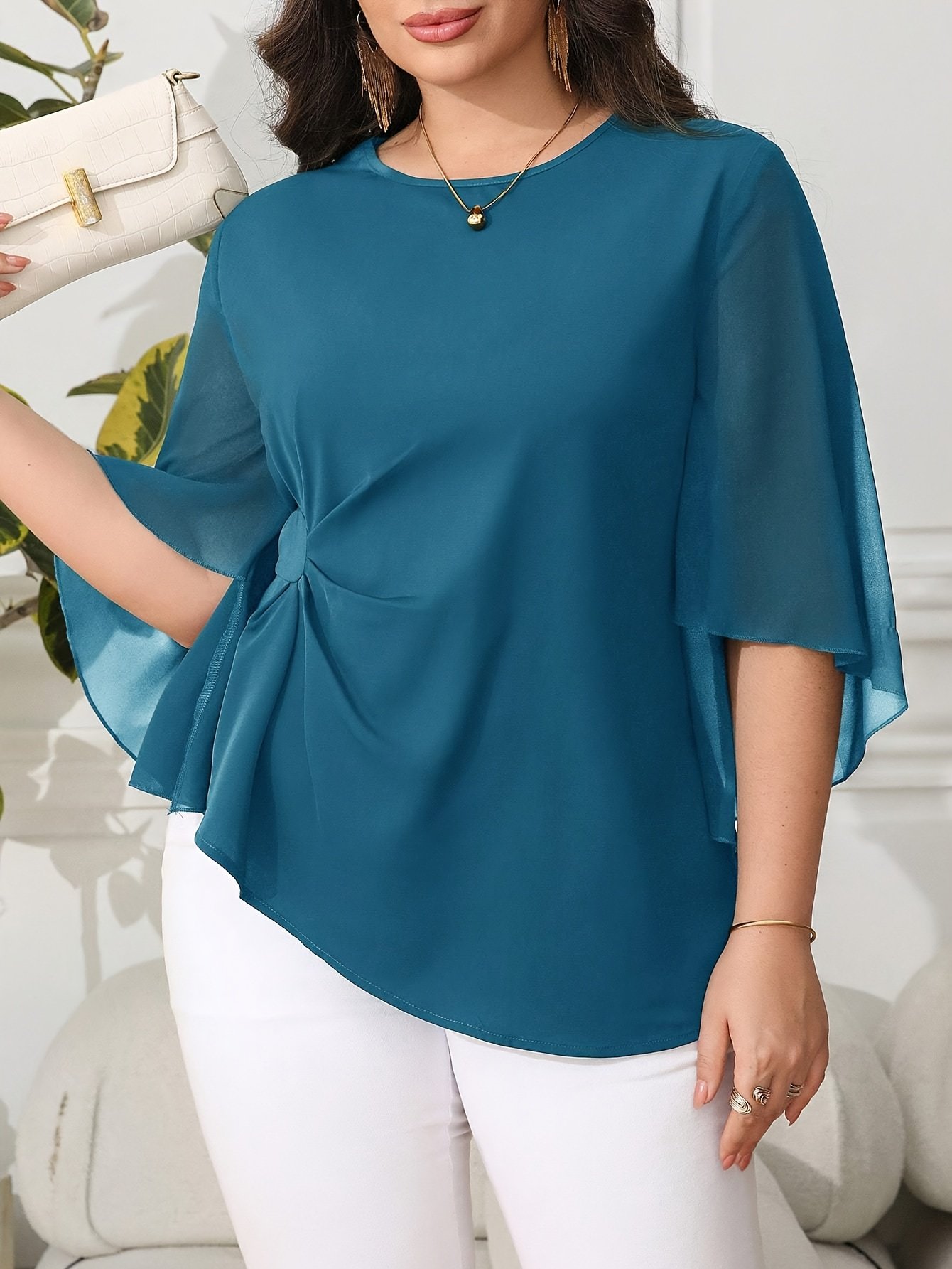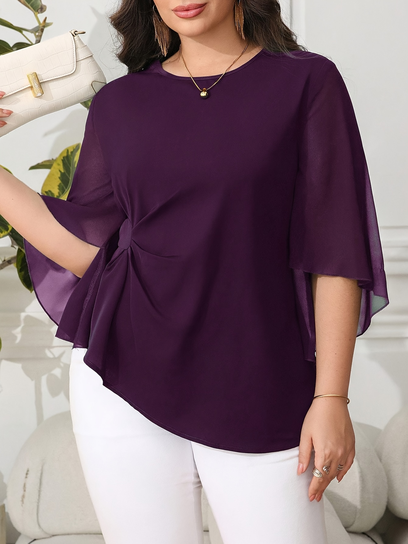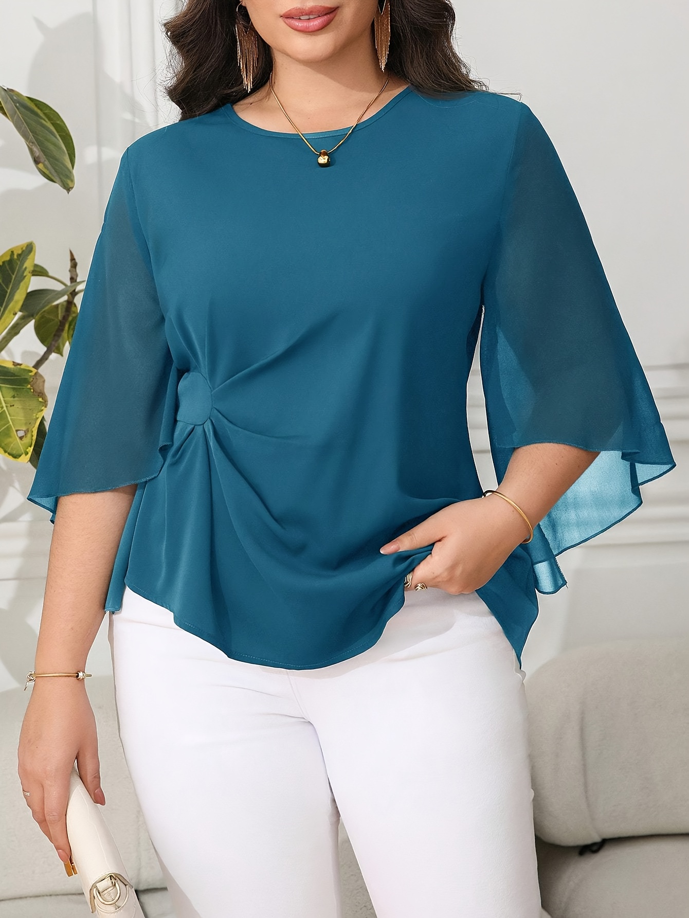 Blouse grande taille pour femme, classique, unie, simple, élégante, décontractée, quotidienne, à col rond, manches mi-longues à volants irréguliers, tenue de bureau professionnelle digne pour femme ronde