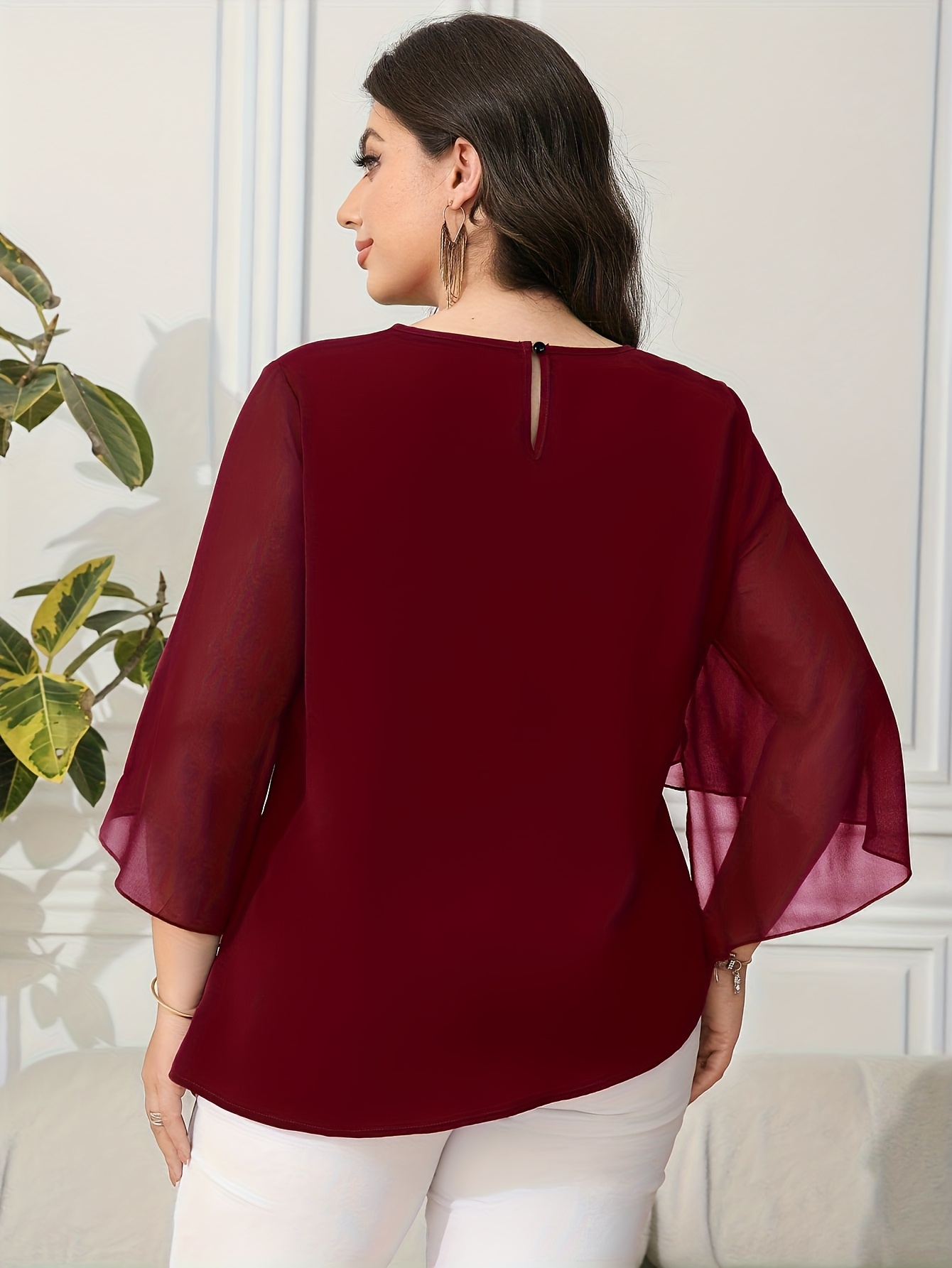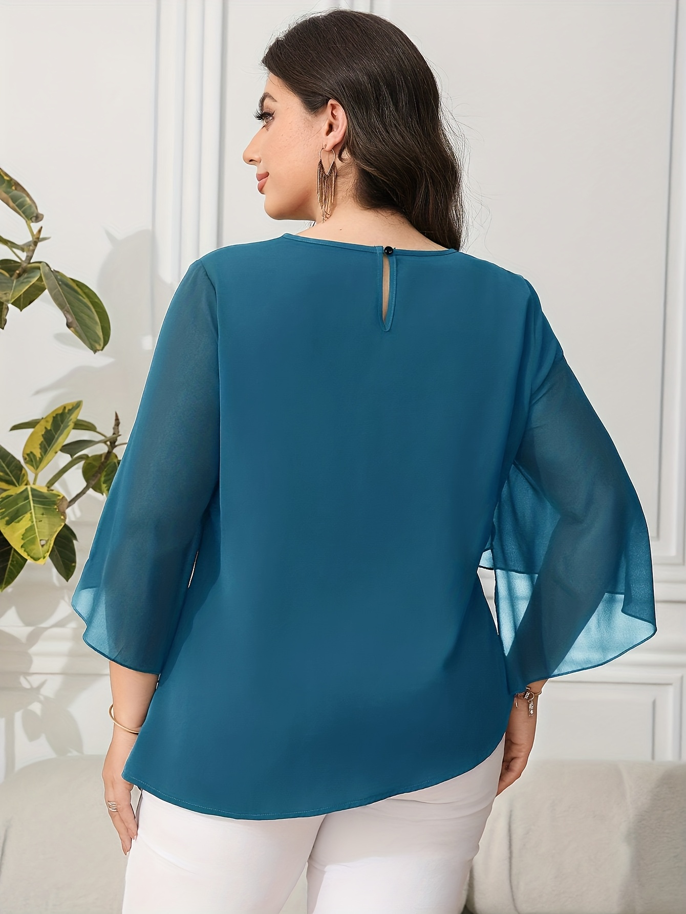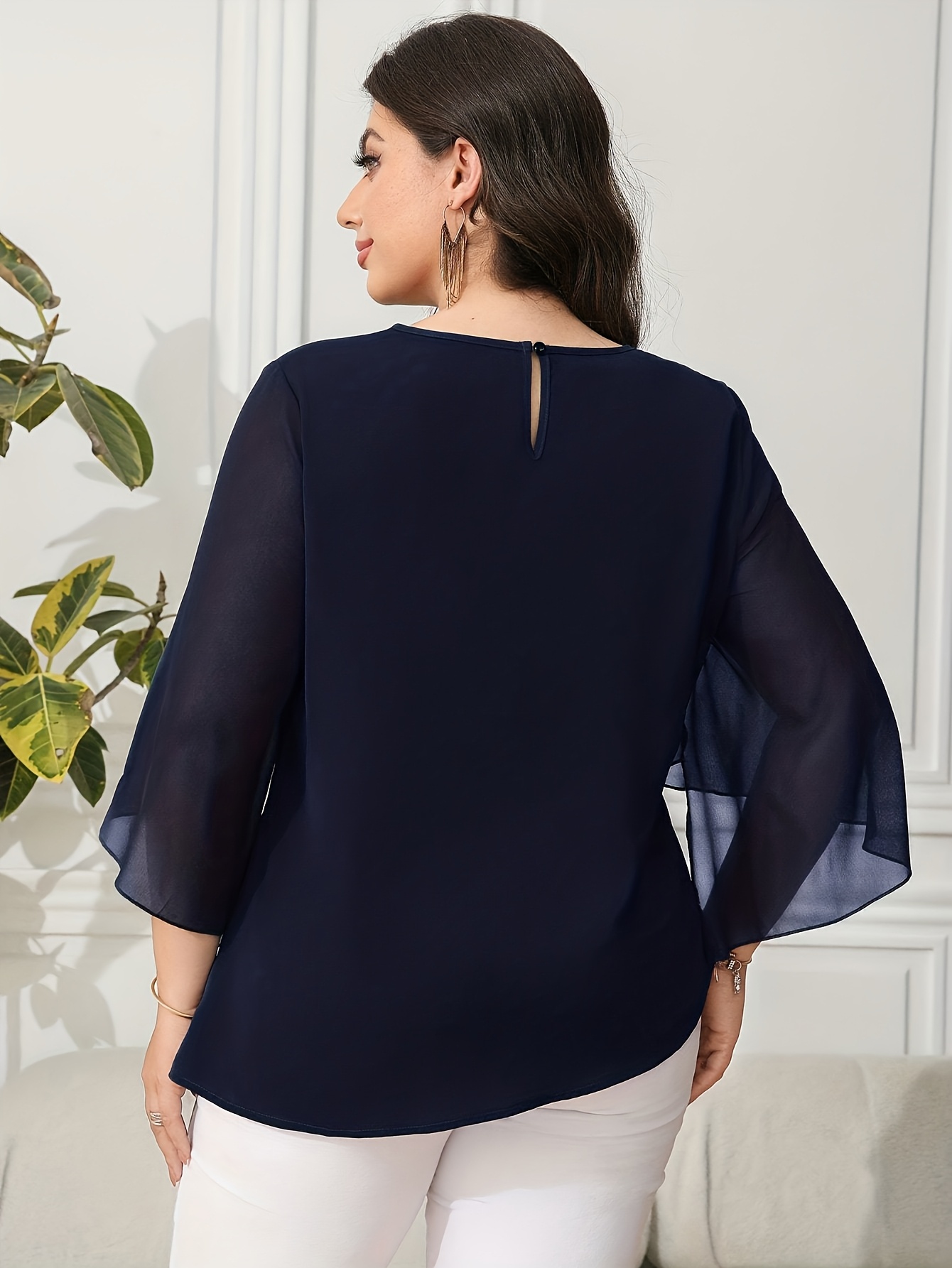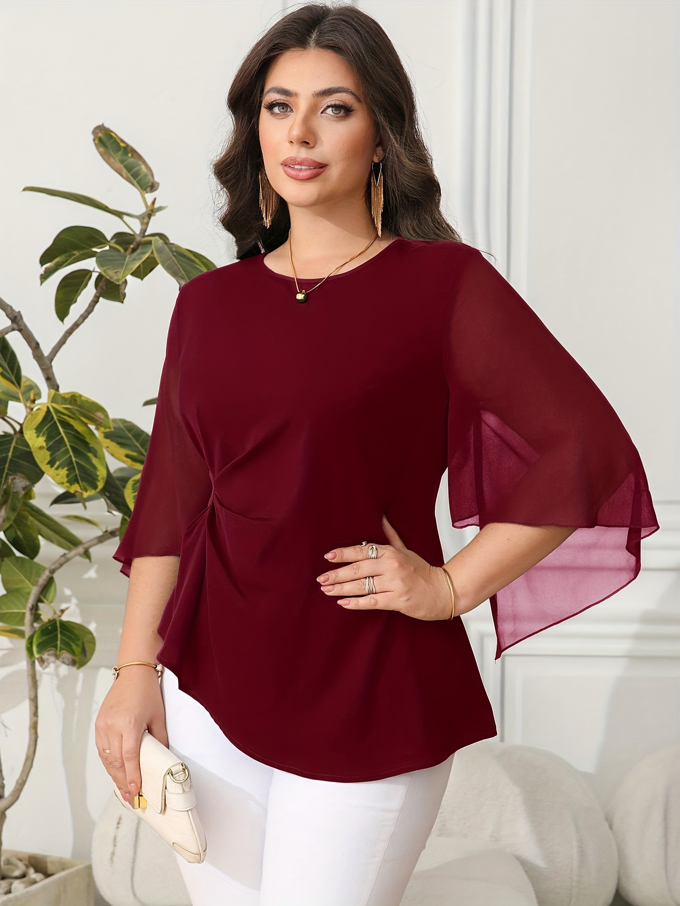 Blouse grande taille pour femme, classique, unie, simple, élégante, décontractée, quotidienne, à col rond, manches mi-longues à volants irréguliers, tenue de bureau professionnelle digne pour femme ronde