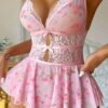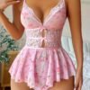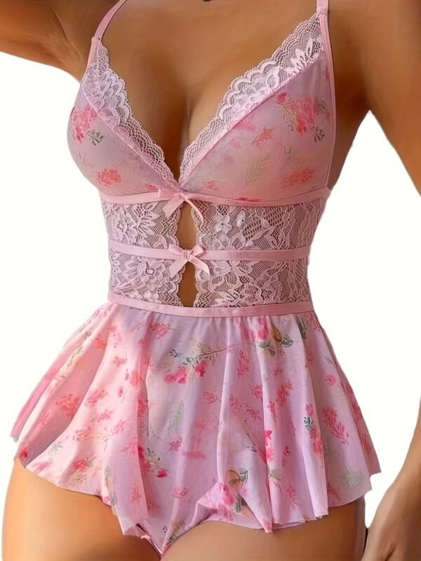 Body en dentelle sexy pour femme – Imprimé floral rose dos nu avec bretelles ajustables, col en V profond et ourlet froncé, sans rembourrage, soutien léger pour vêtements de nouveauté pour adultes, tenue romantique, lingerie élégante, élégance féminine, style féminin, texture lisse