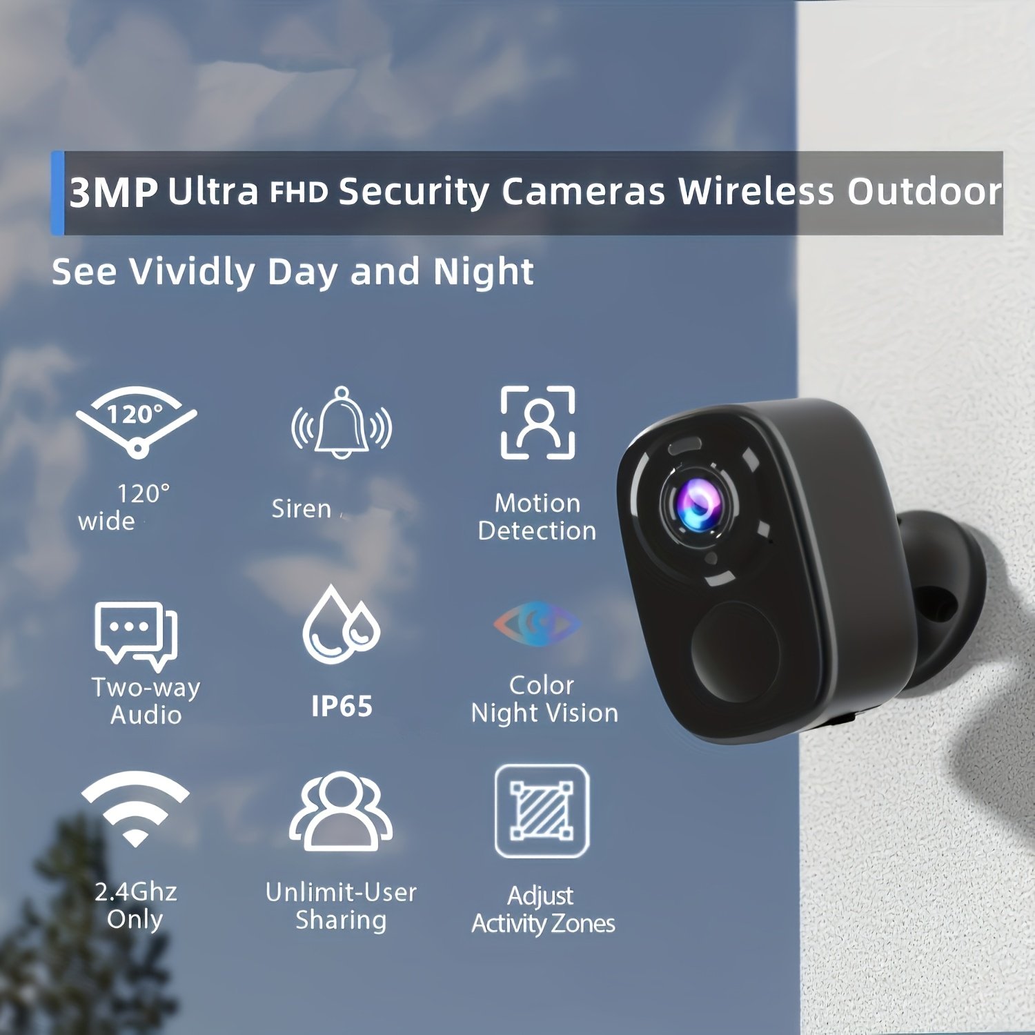Caméra de Sécurité Intérieur/Extérieur 3MP 2.4G Wifi pour Maison, Caméra de Sécurité Sans Fil Extérieur IP65, Caméra 3MP FHD Alimentée par Batterie pour Sécurité Domestique avec Stockage SD/Cloud Gratuit, Détection de Mouvement AI, Vision Nocturne en Coul