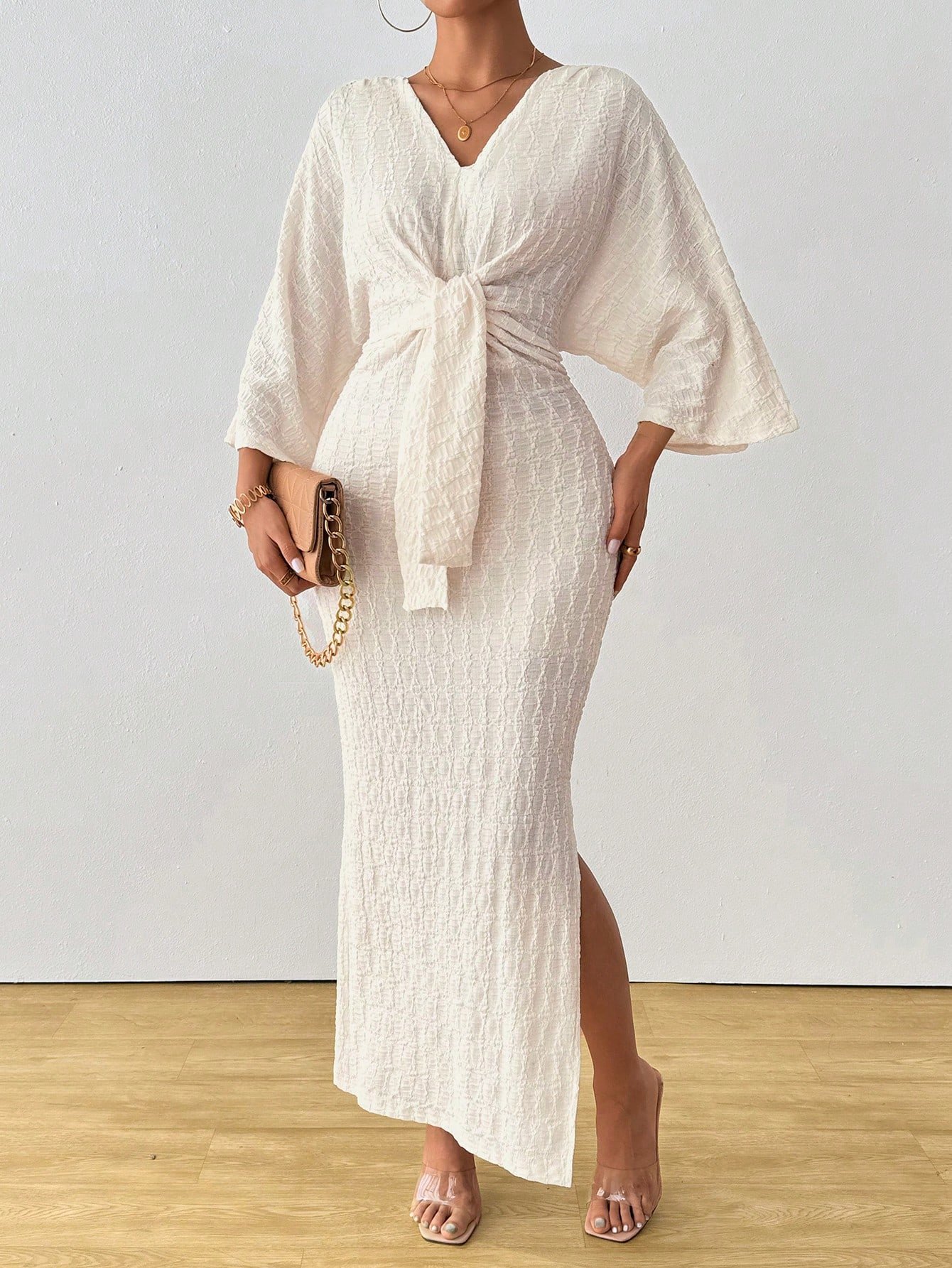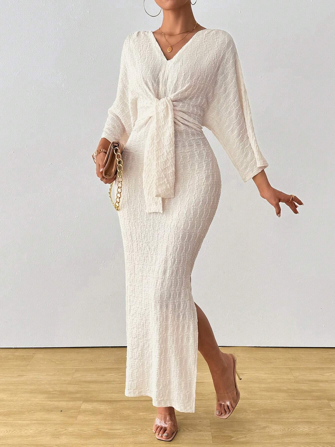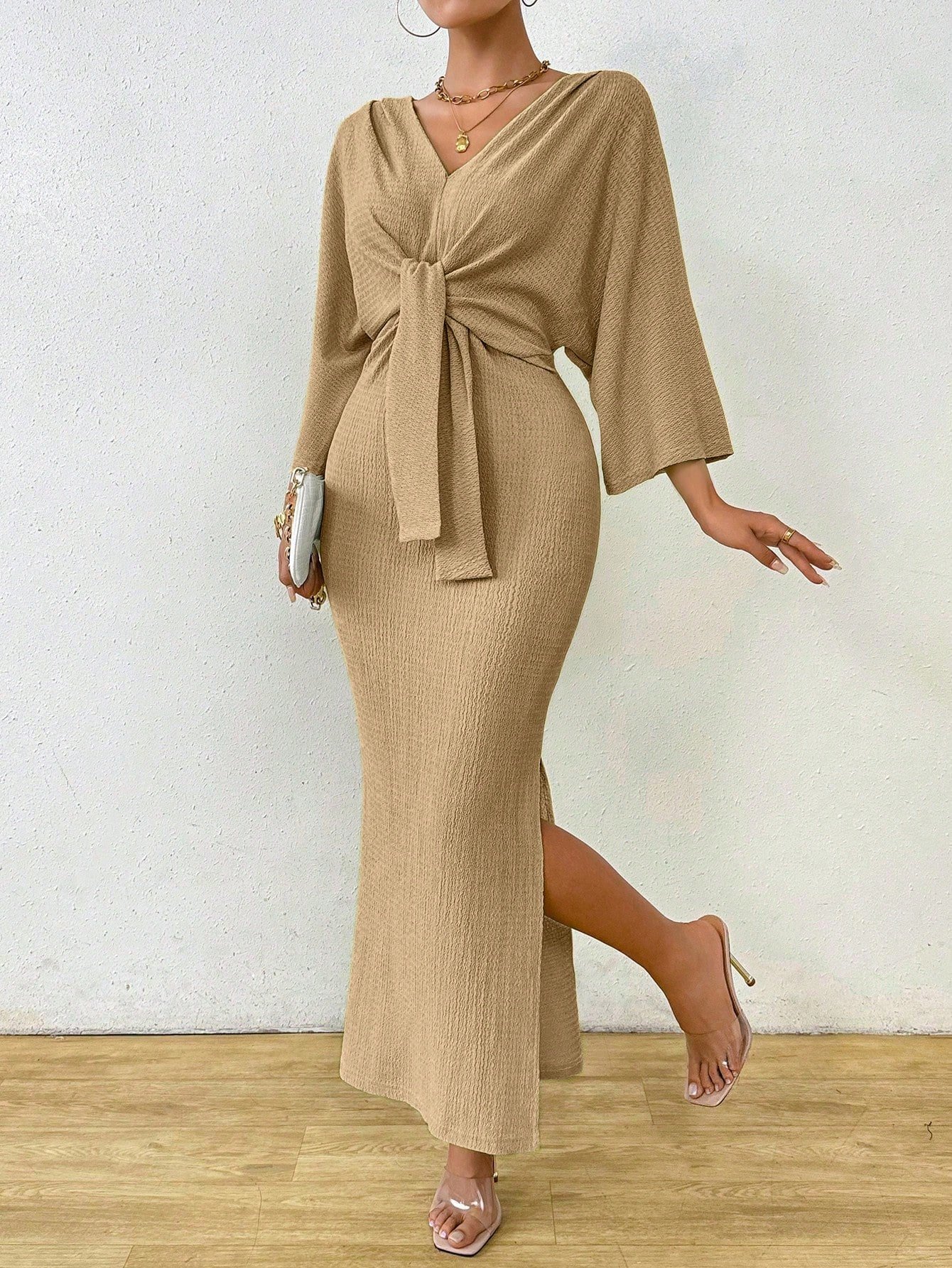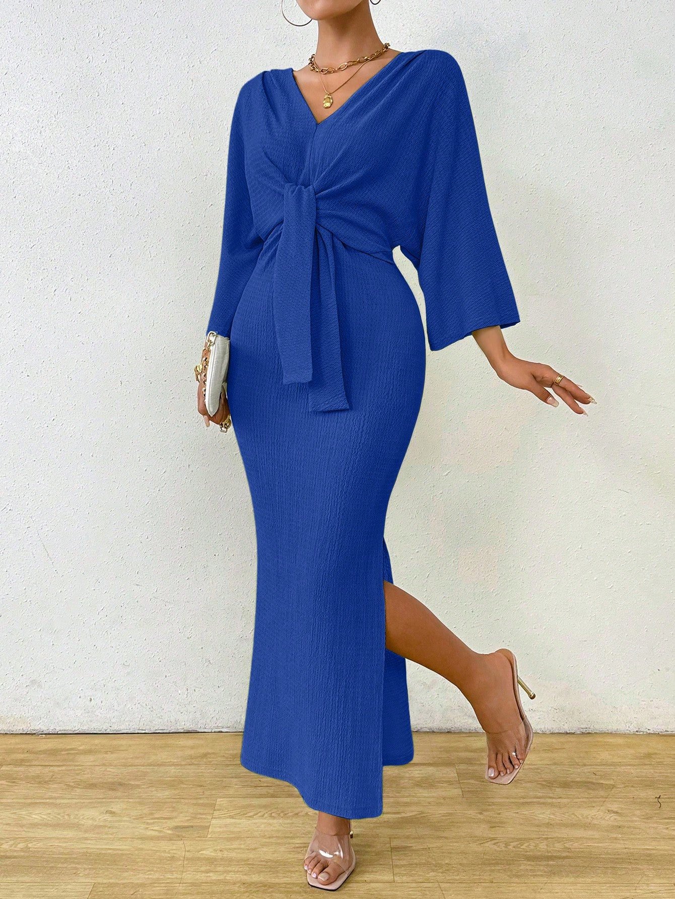 Celisse Robe longue décontractée pour femmes à col en V à manches longues avec nœud et fente, en couleur unie
