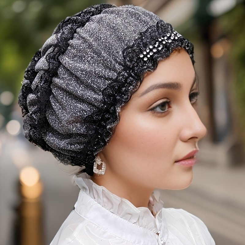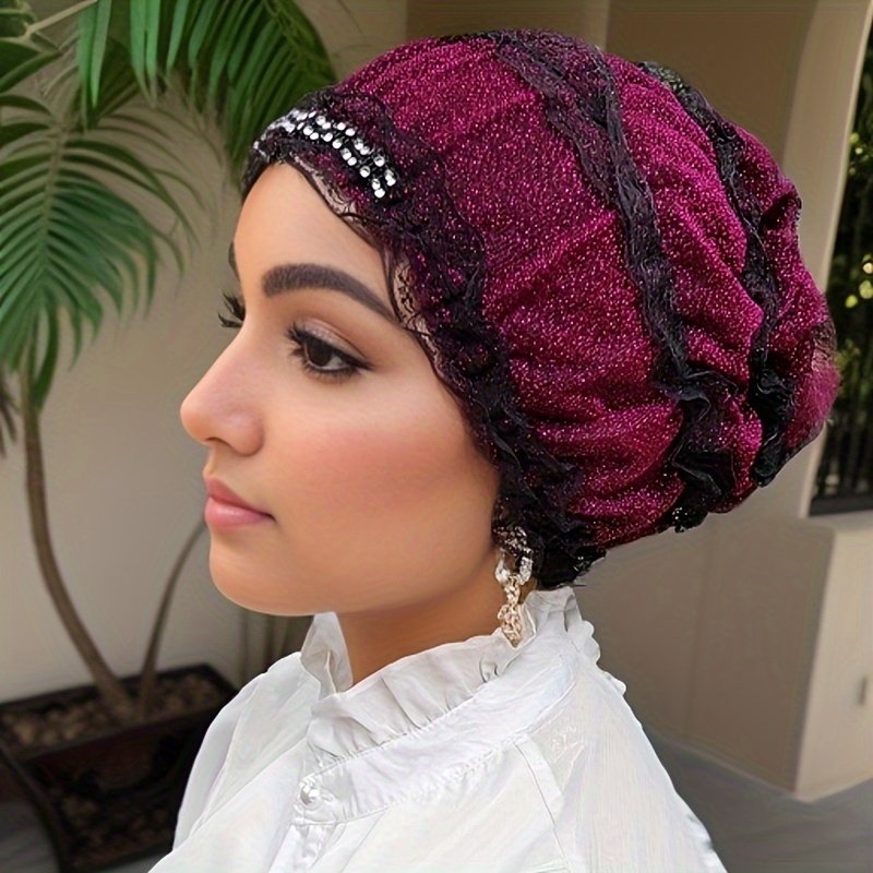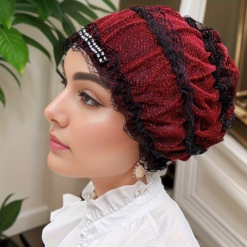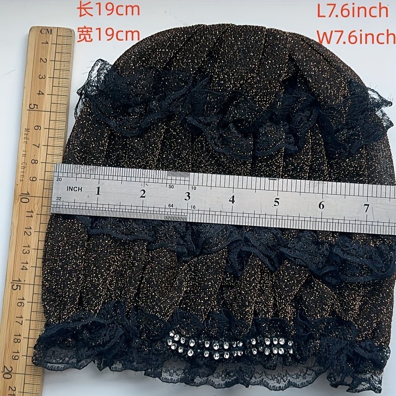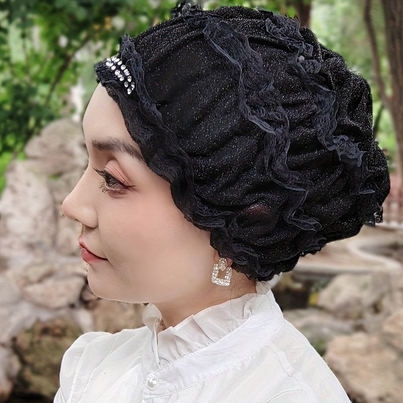 Chapeau Foulard Musulman à Une Couche avec Broderie de Fleurs en Dentelle, Capuche Élastique avec Diamant Décoratif, Chapeau Respirant pour la Maison, Chapeau de Mère, Chapeau de Beauté Superposé, Chapeau Hui