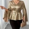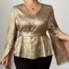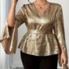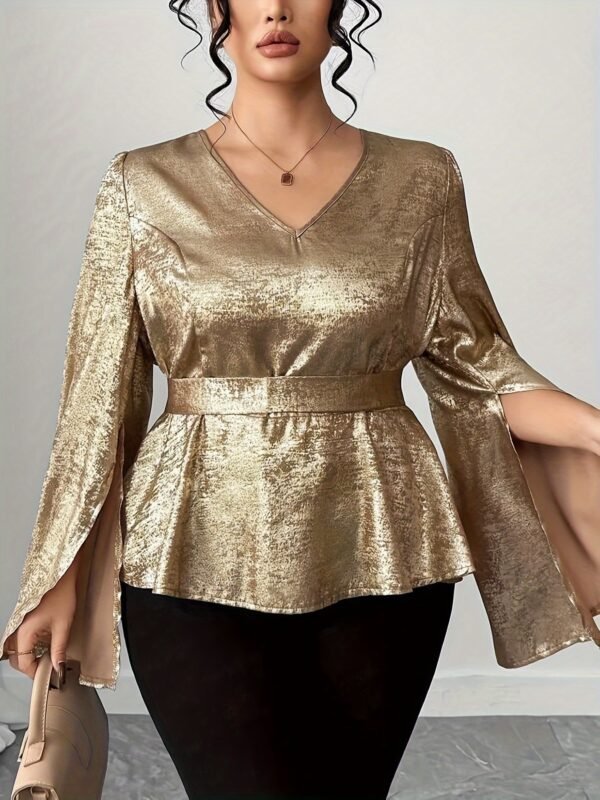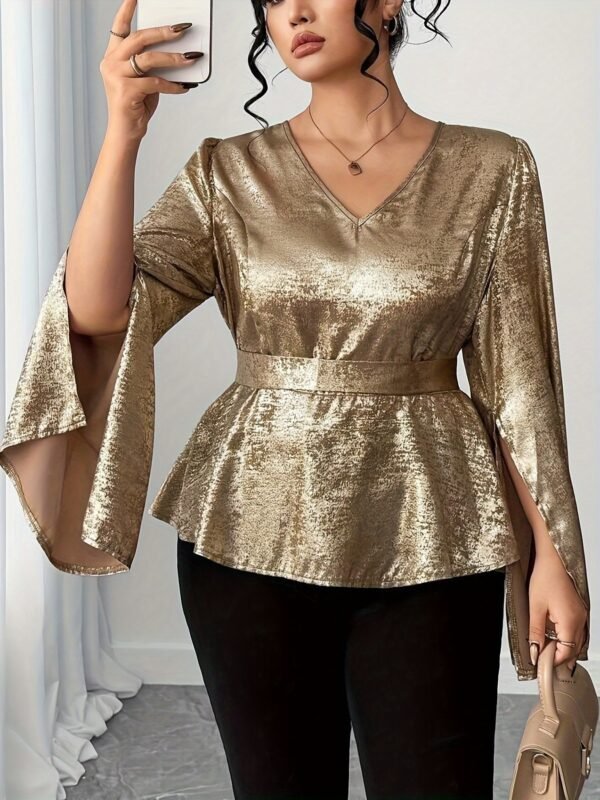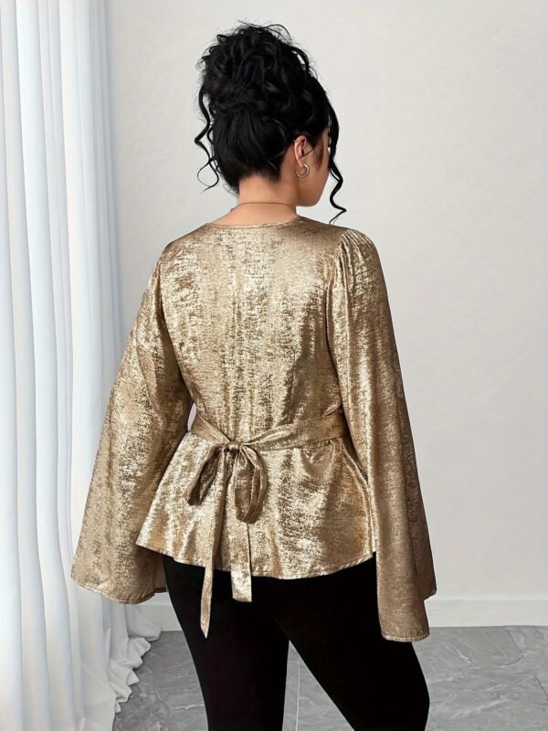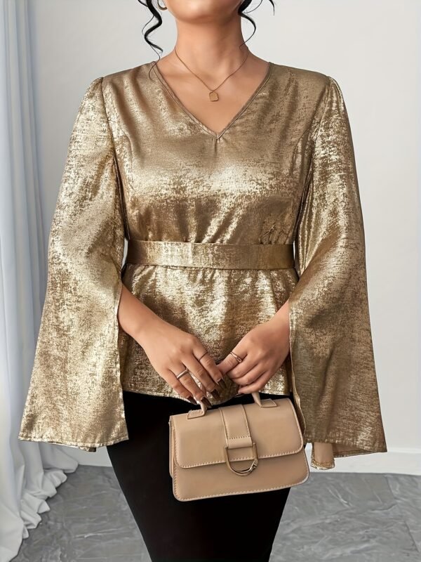 Chemise élégante à manches cloche pour femme grande taille, col en V avec nœud, boutonnage devant, couleur unie, pour le quotidien, soirées et rendez-vous, lavable en machine