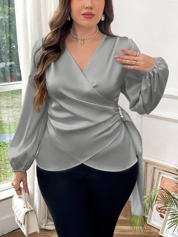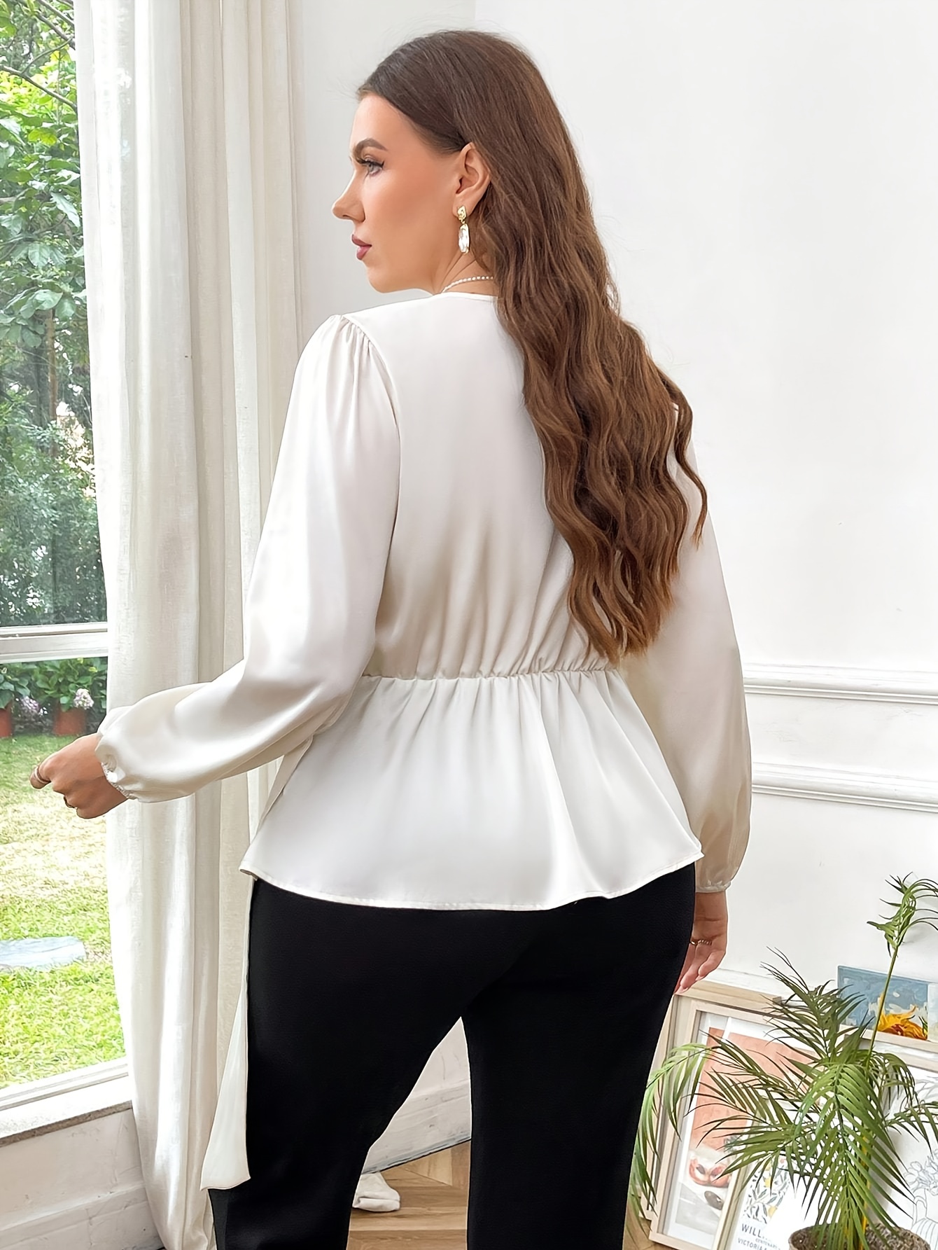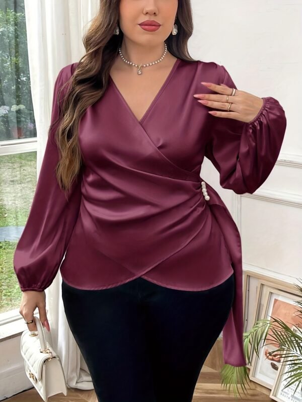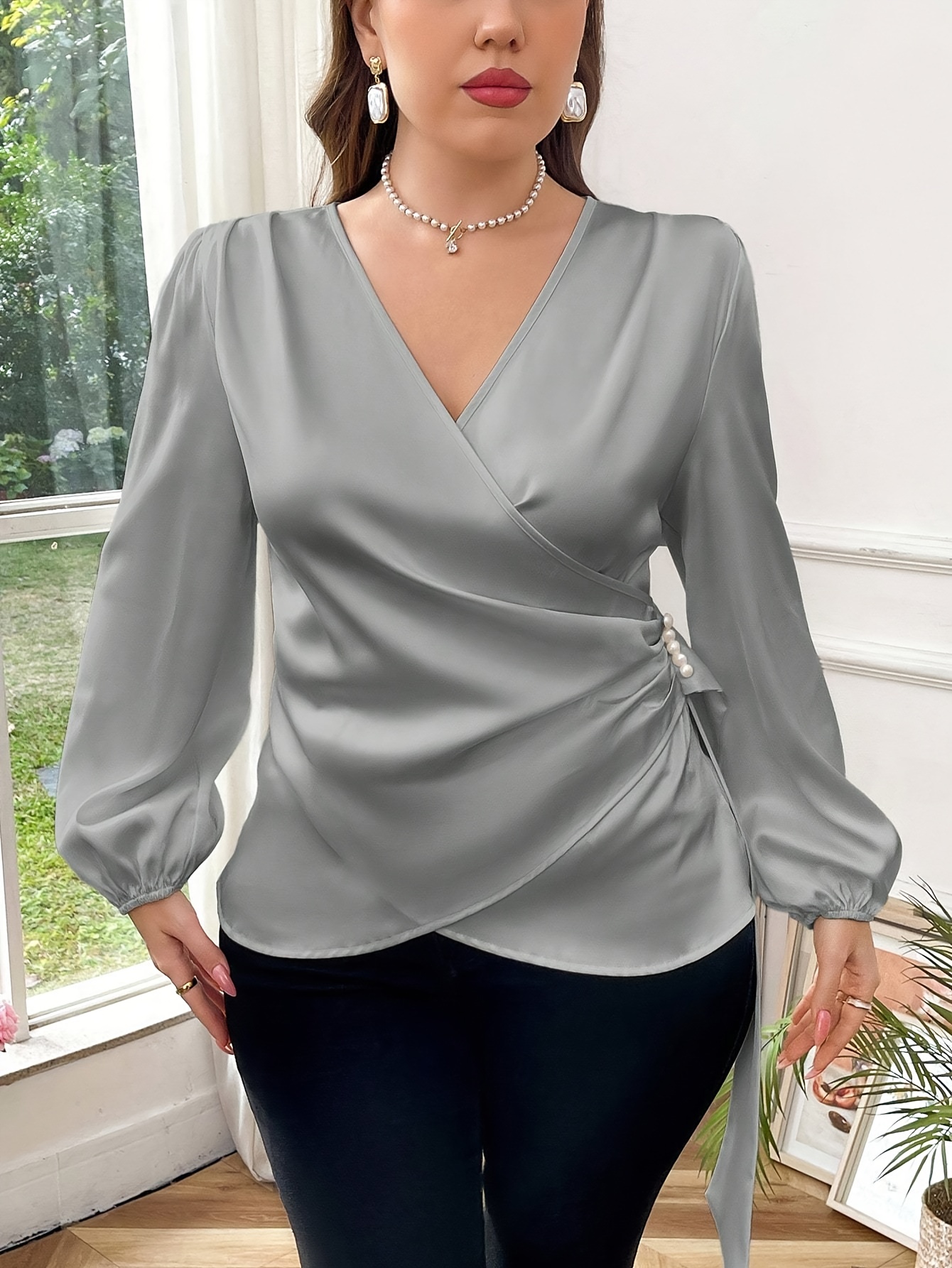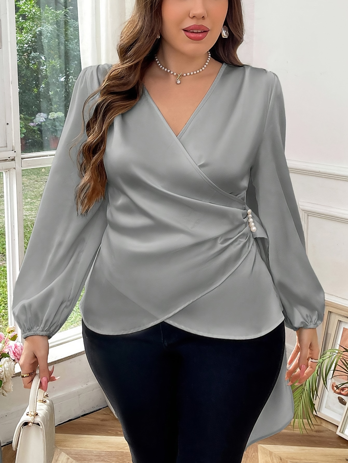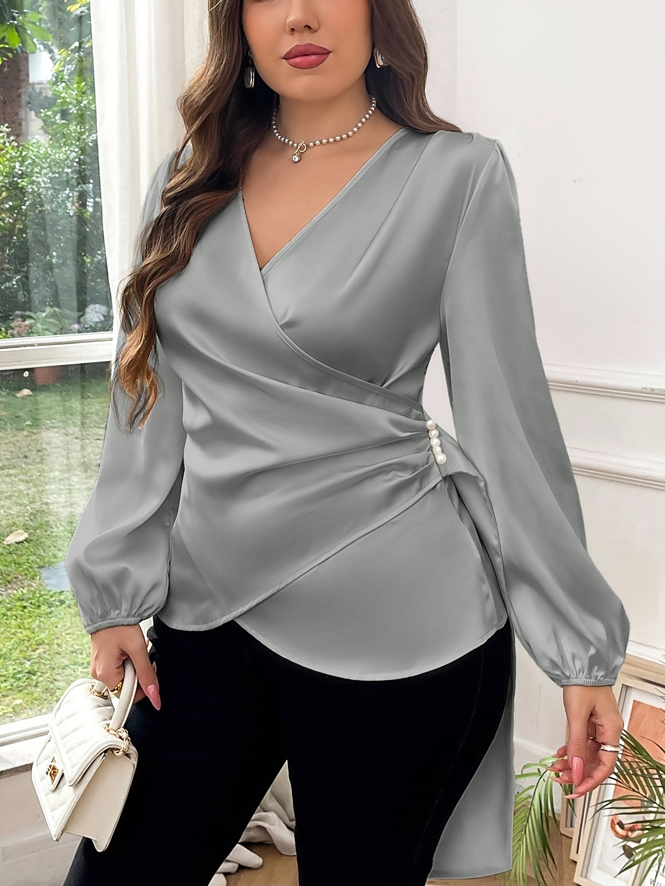 Chemise Élégante à Manches Longues, Col en V, Volant Asymétrique et Perles, Taille Grande, Couleur Unie