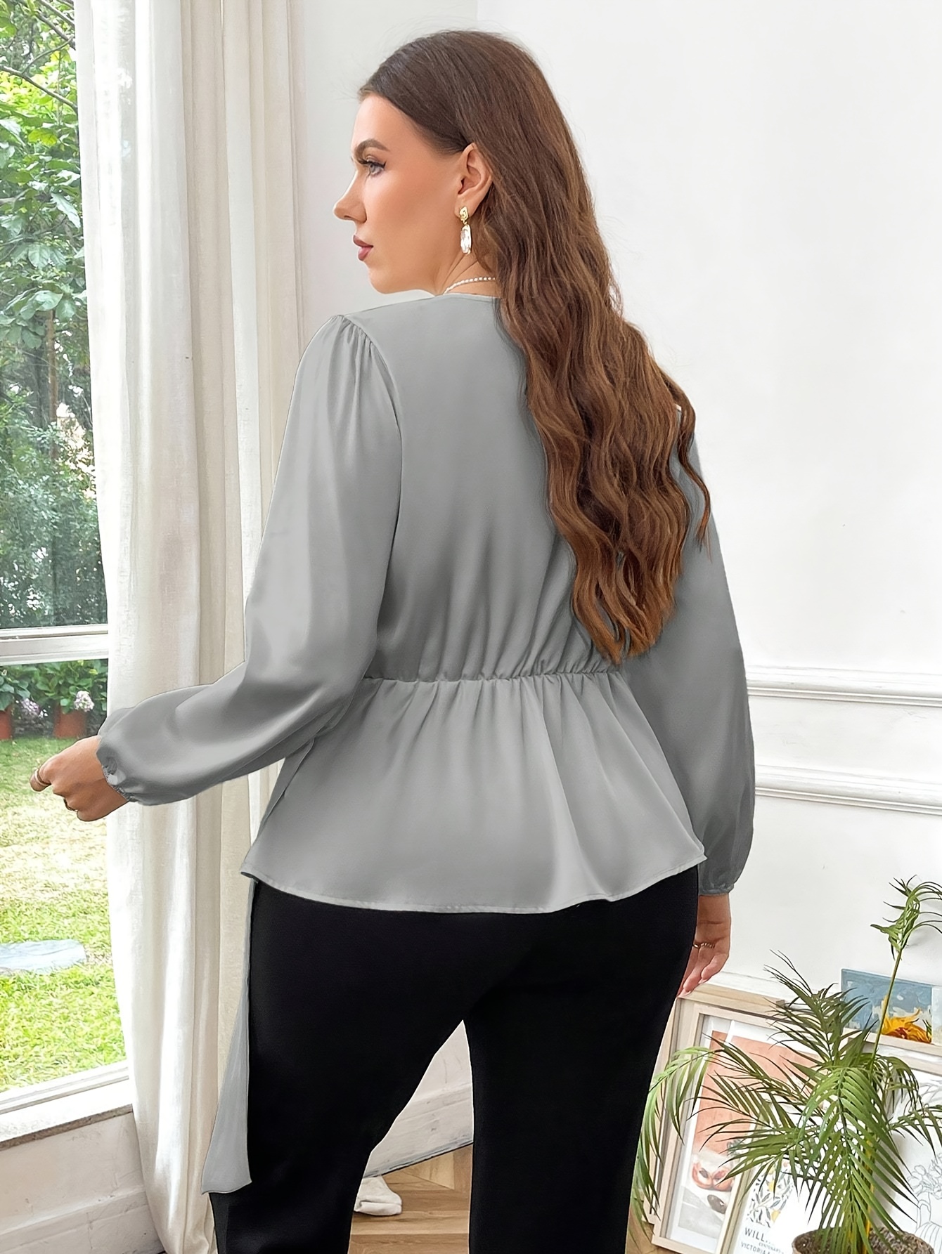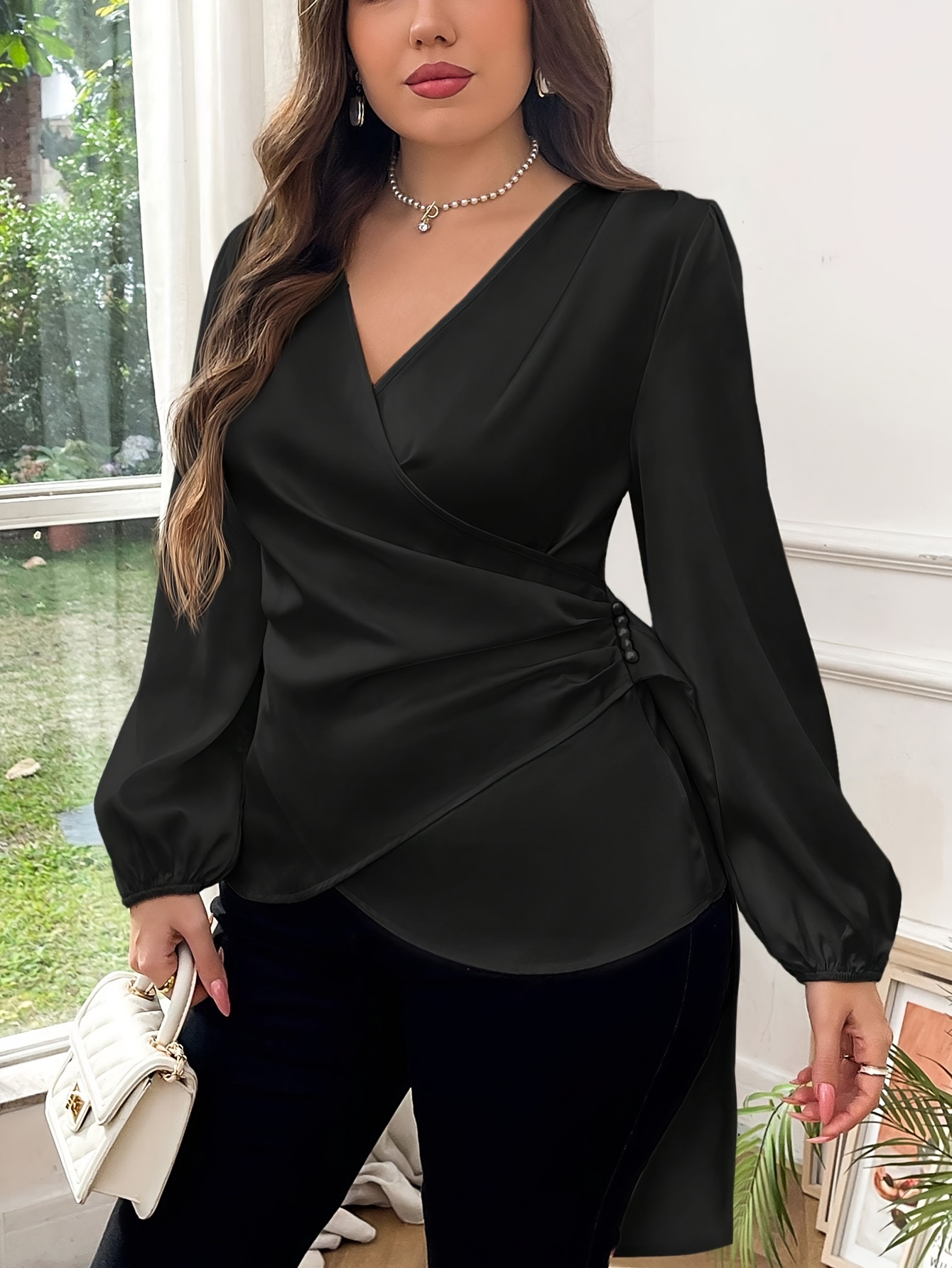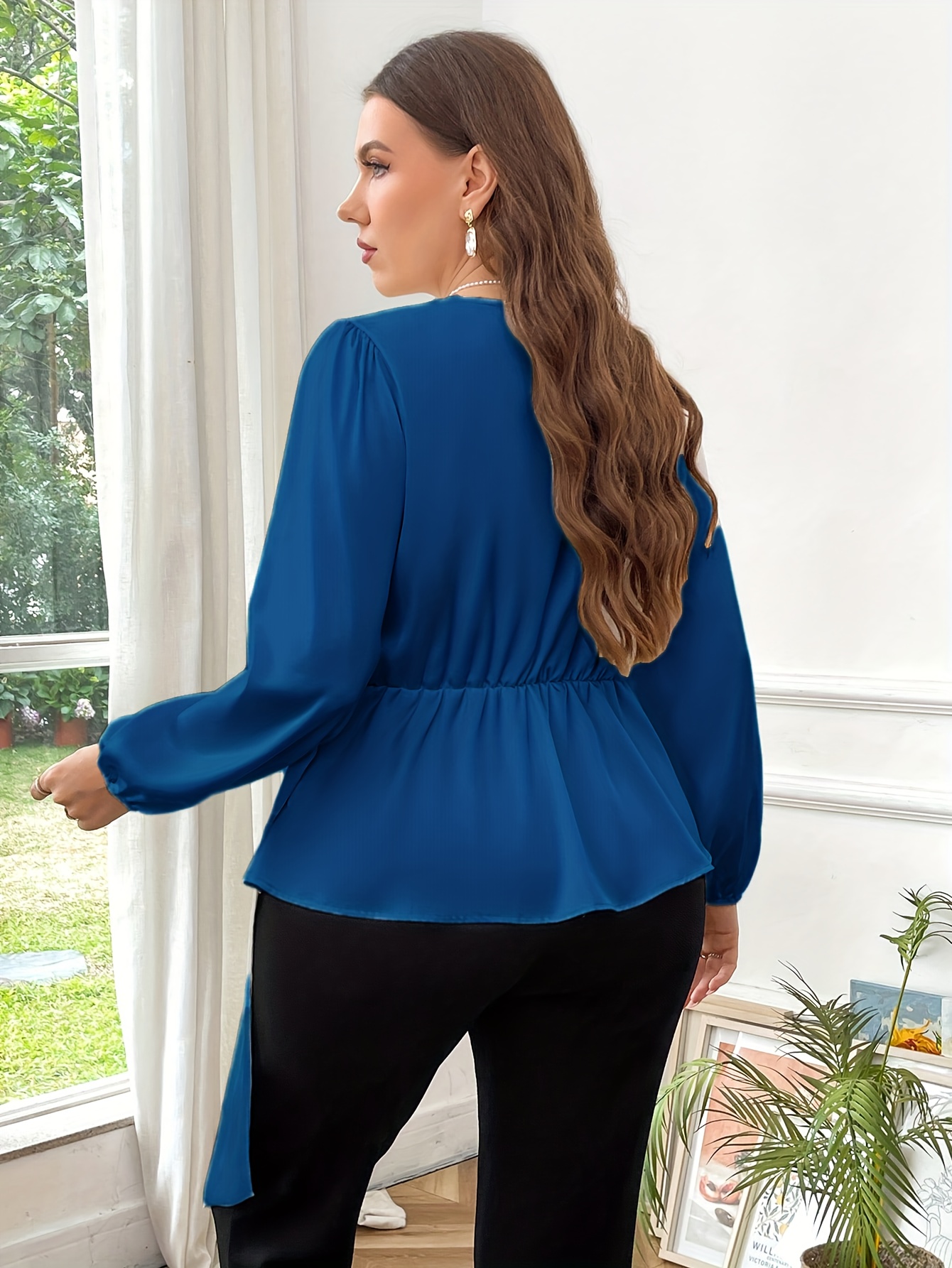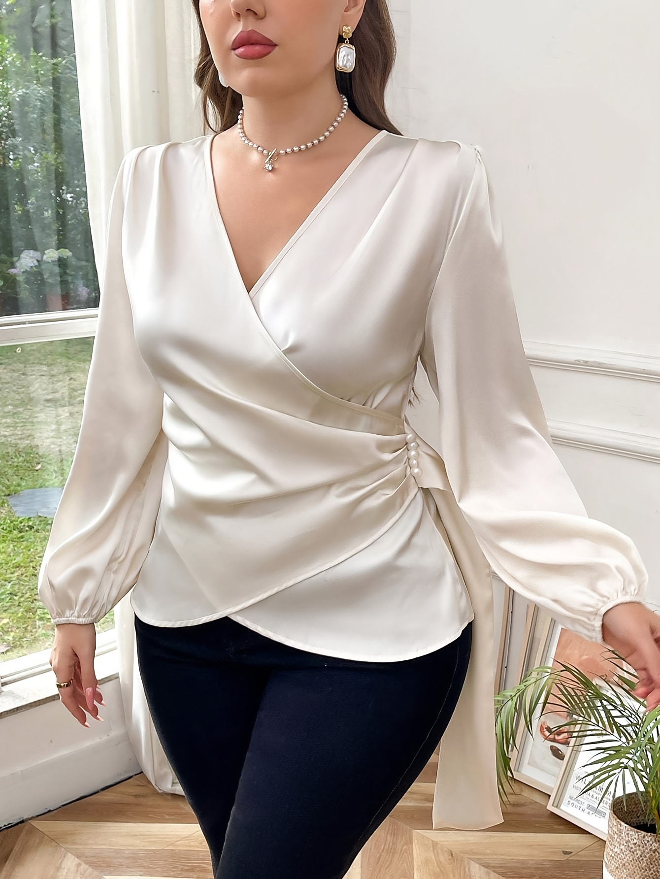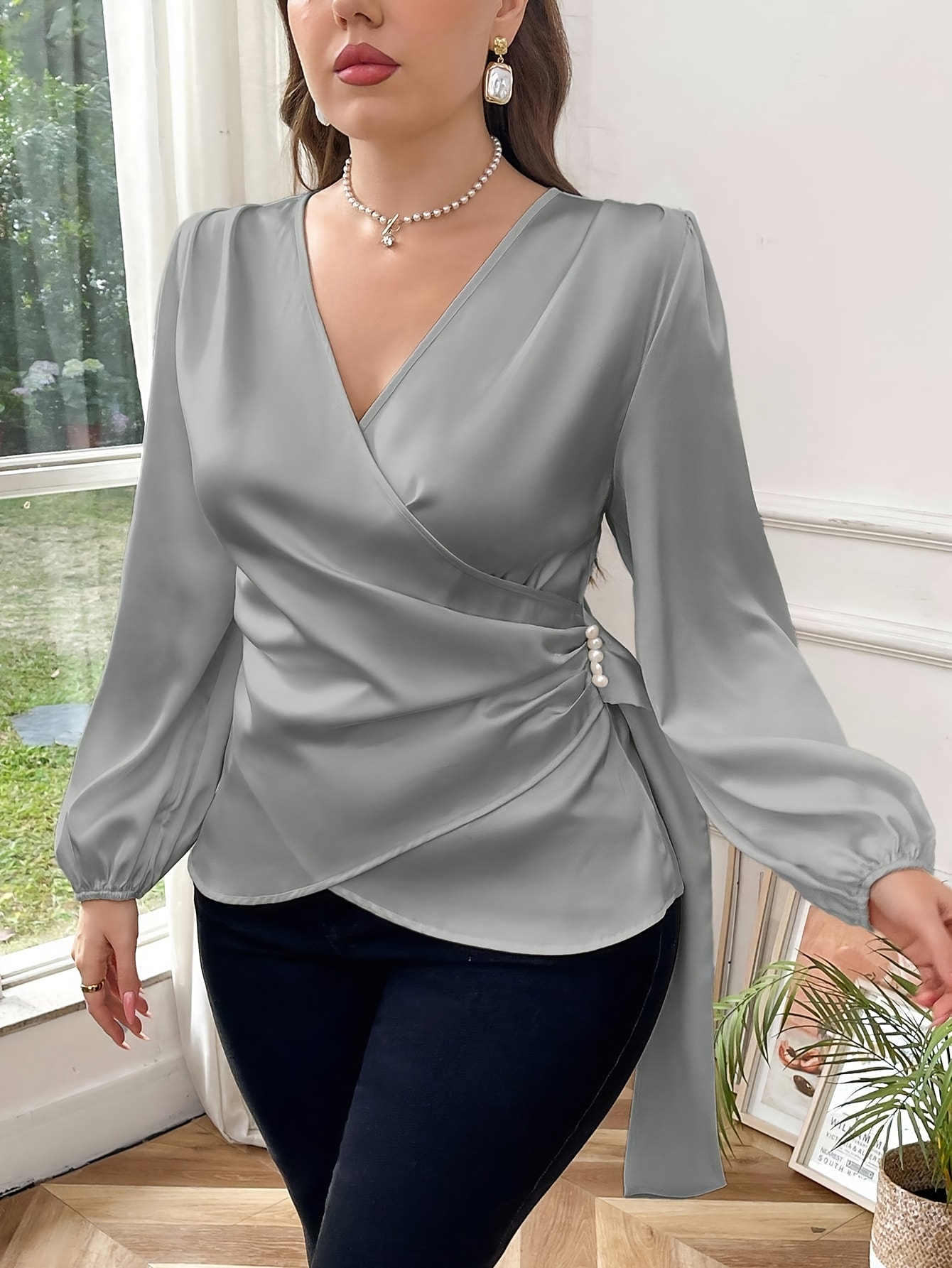 Chemise Élégante à Manches Longues, Col en V, Volant Asymétrique et Perles, Taille Grande, Couleur Unie