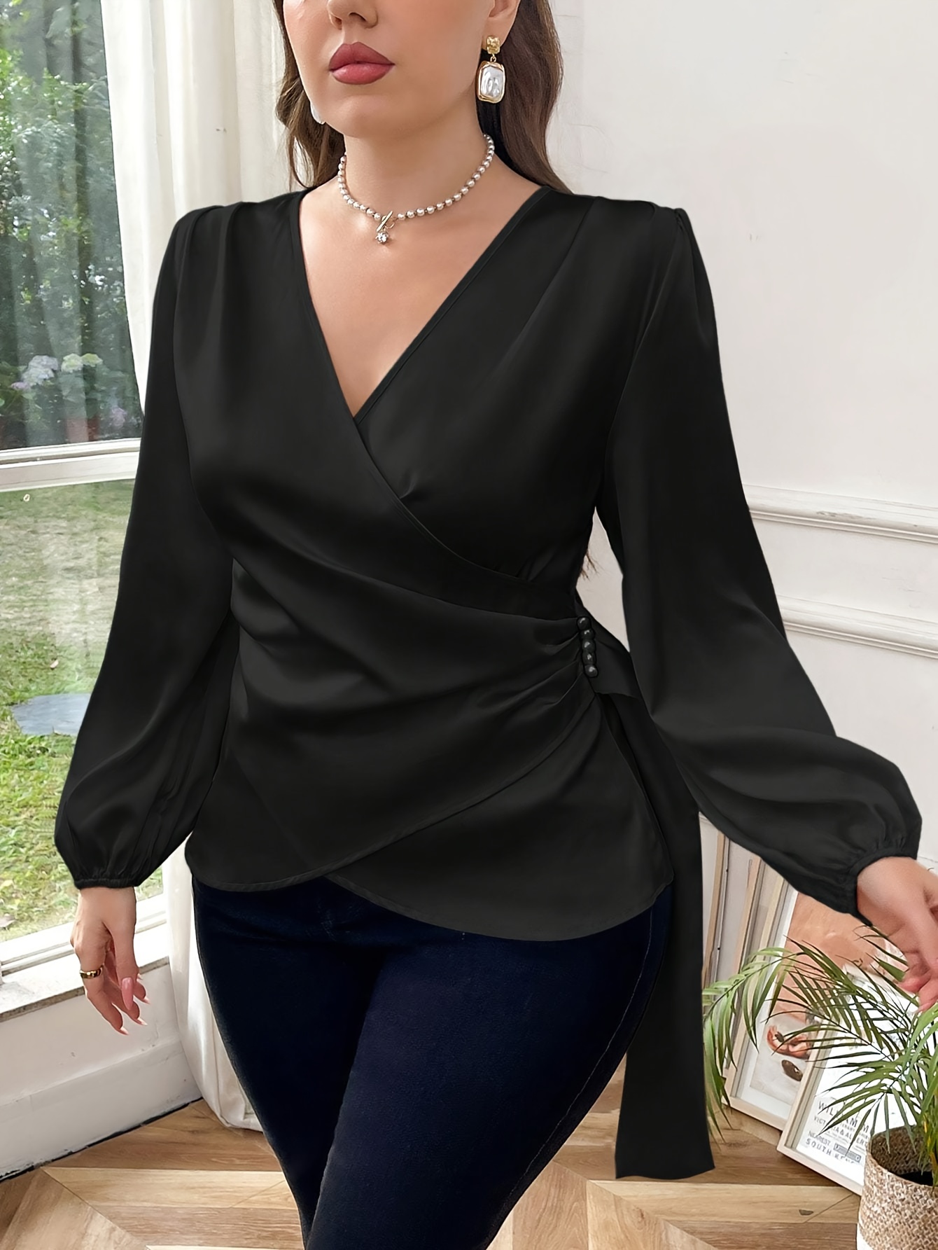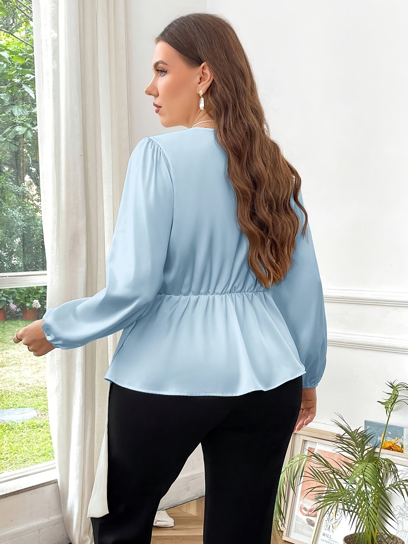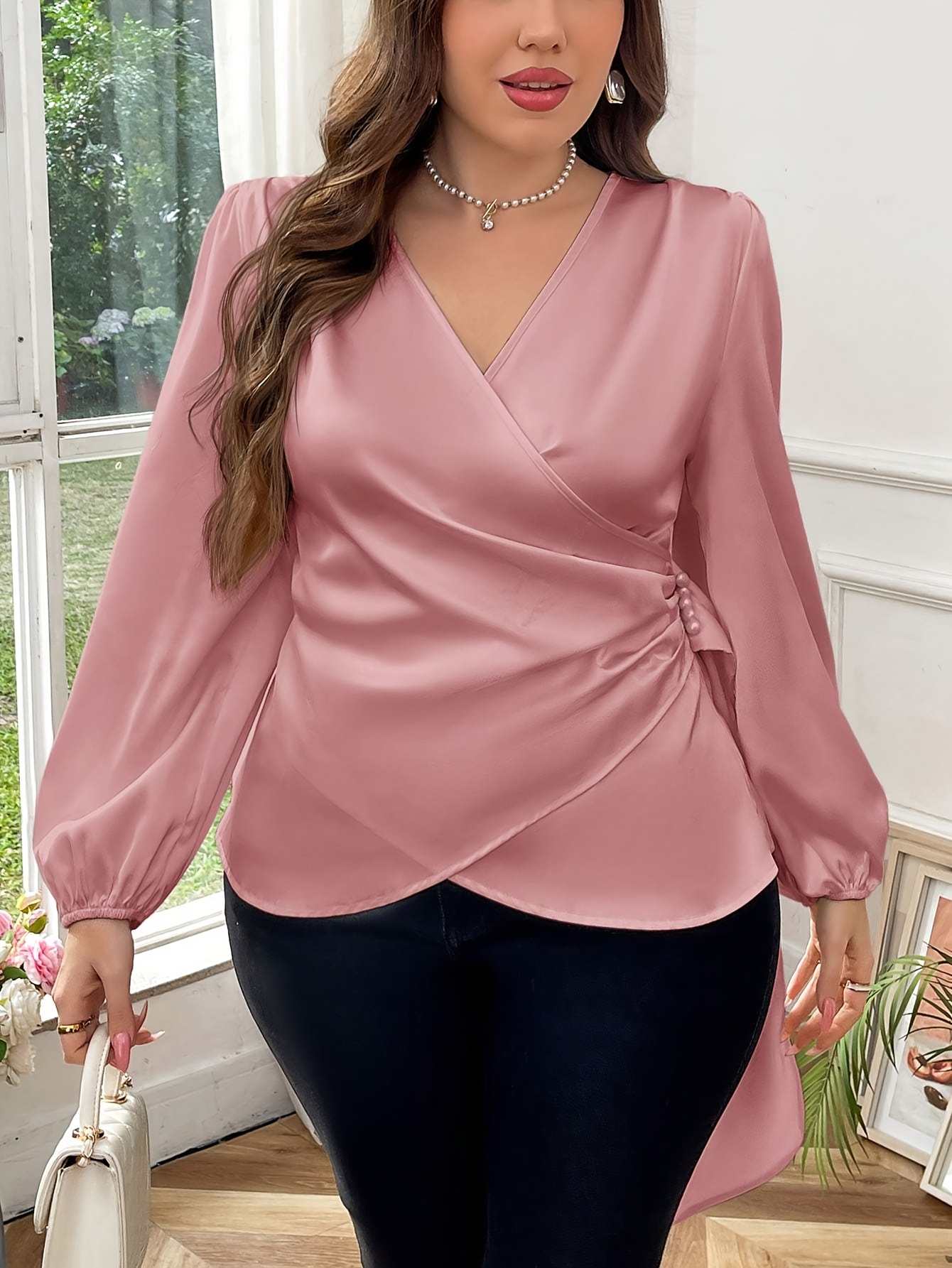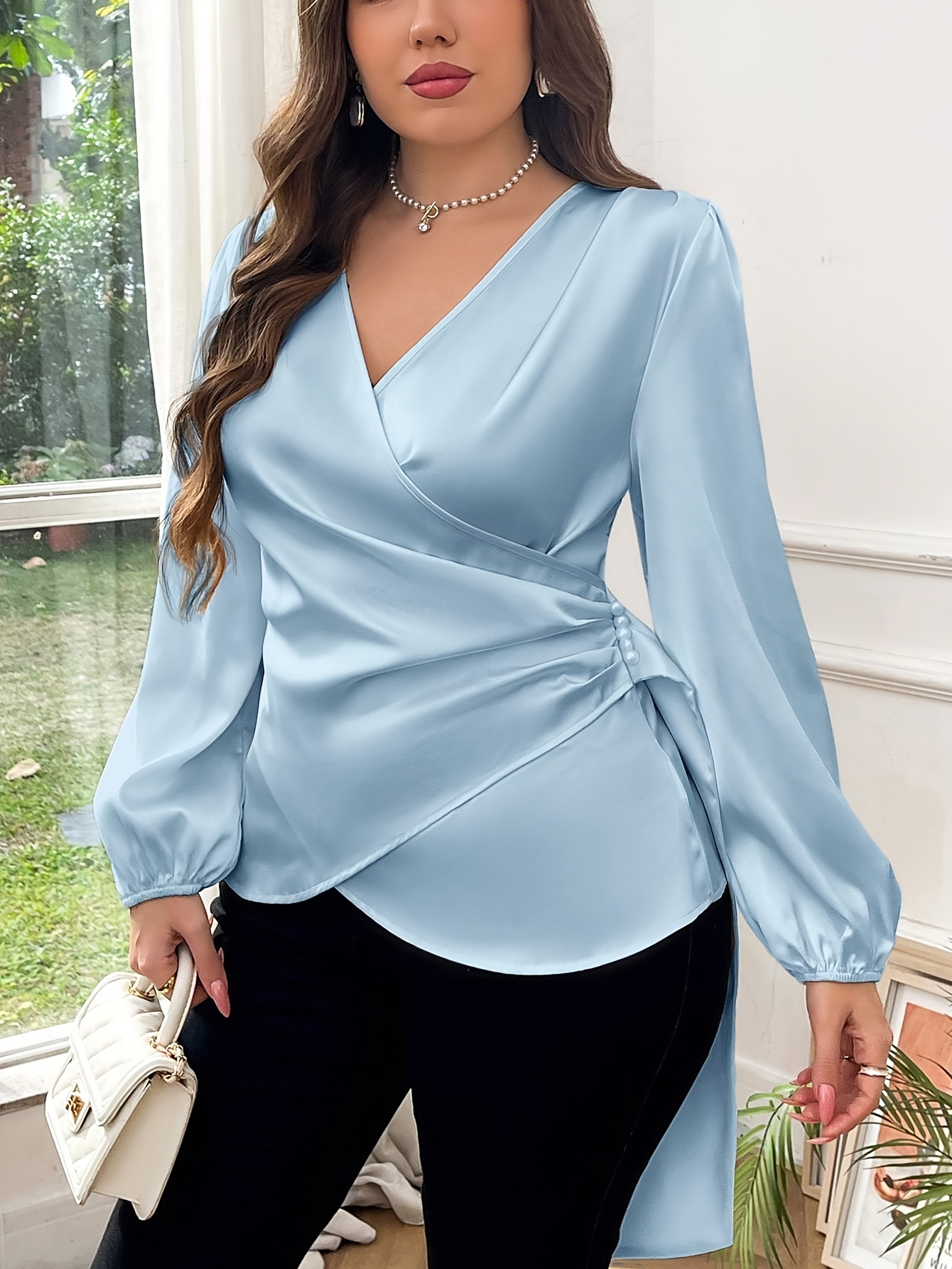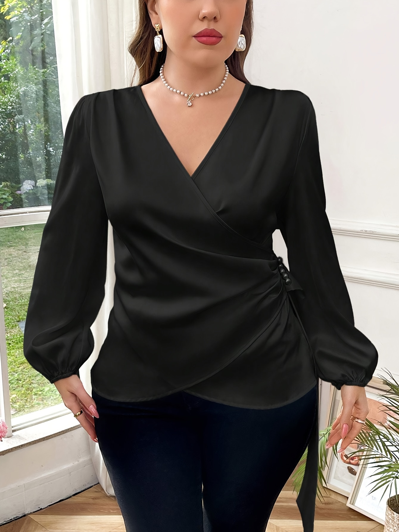 Chemise Élégante à Manches Longues, Col en V, Volant Asymétrique et Perles, Taille Grande, Couleur Unie