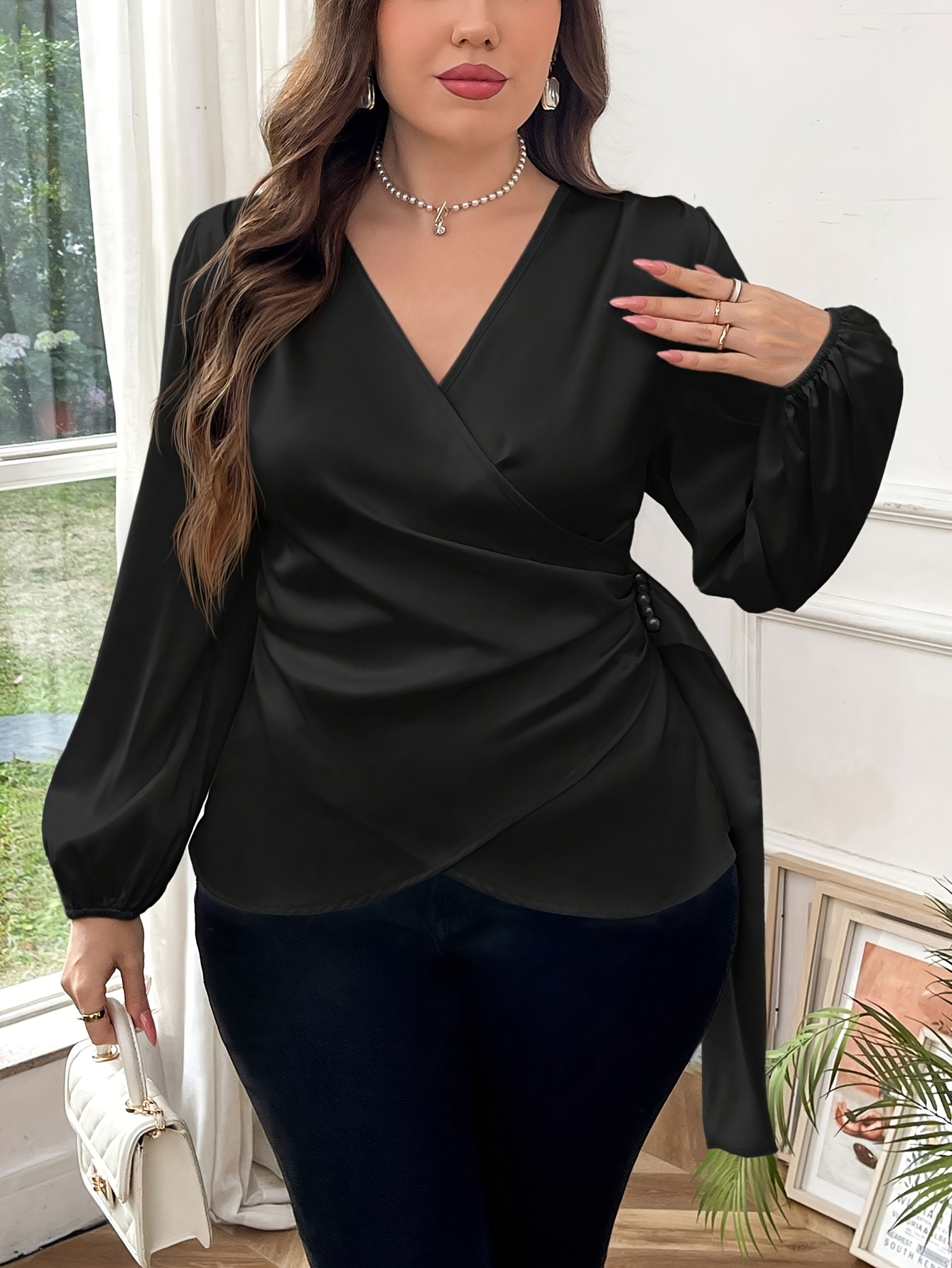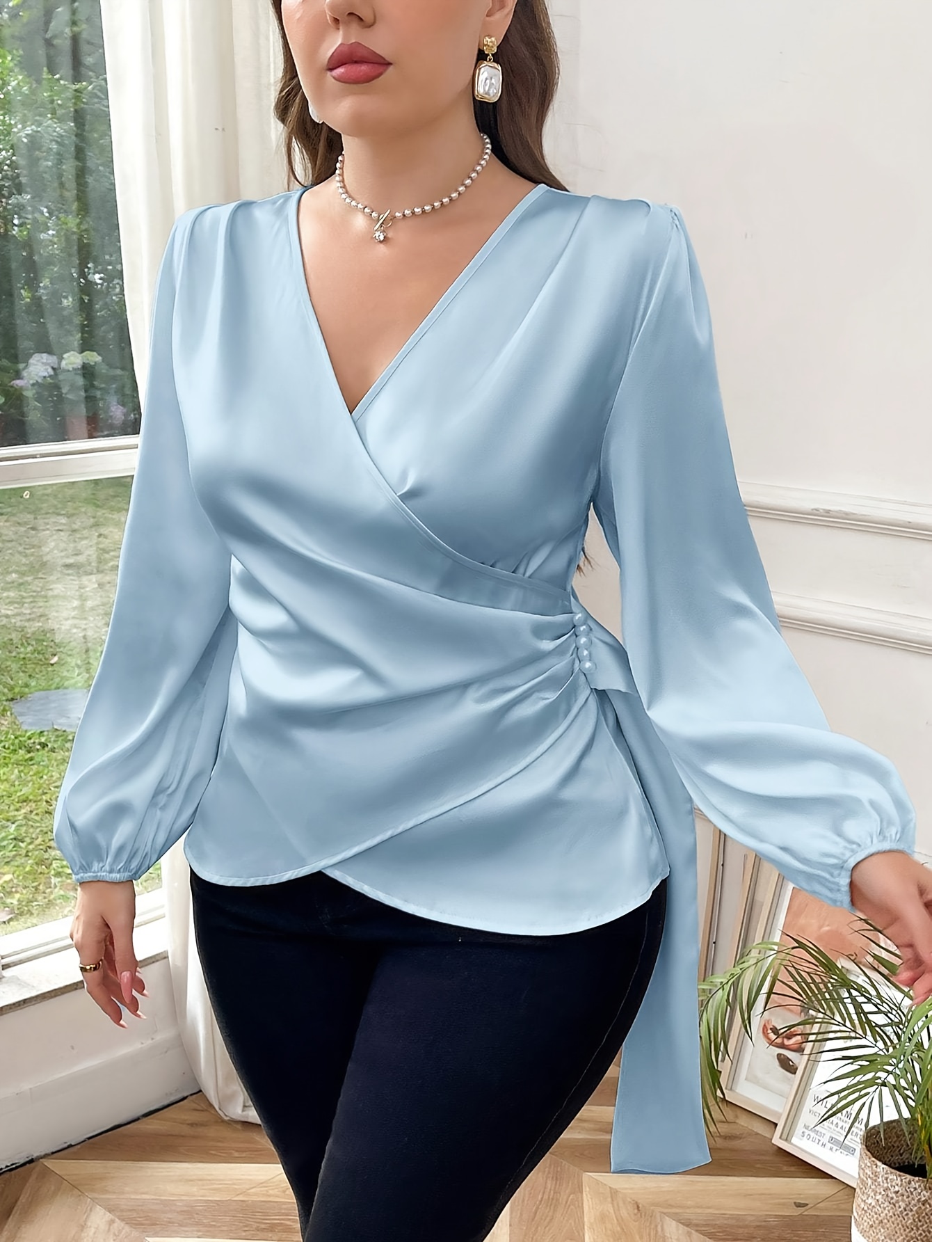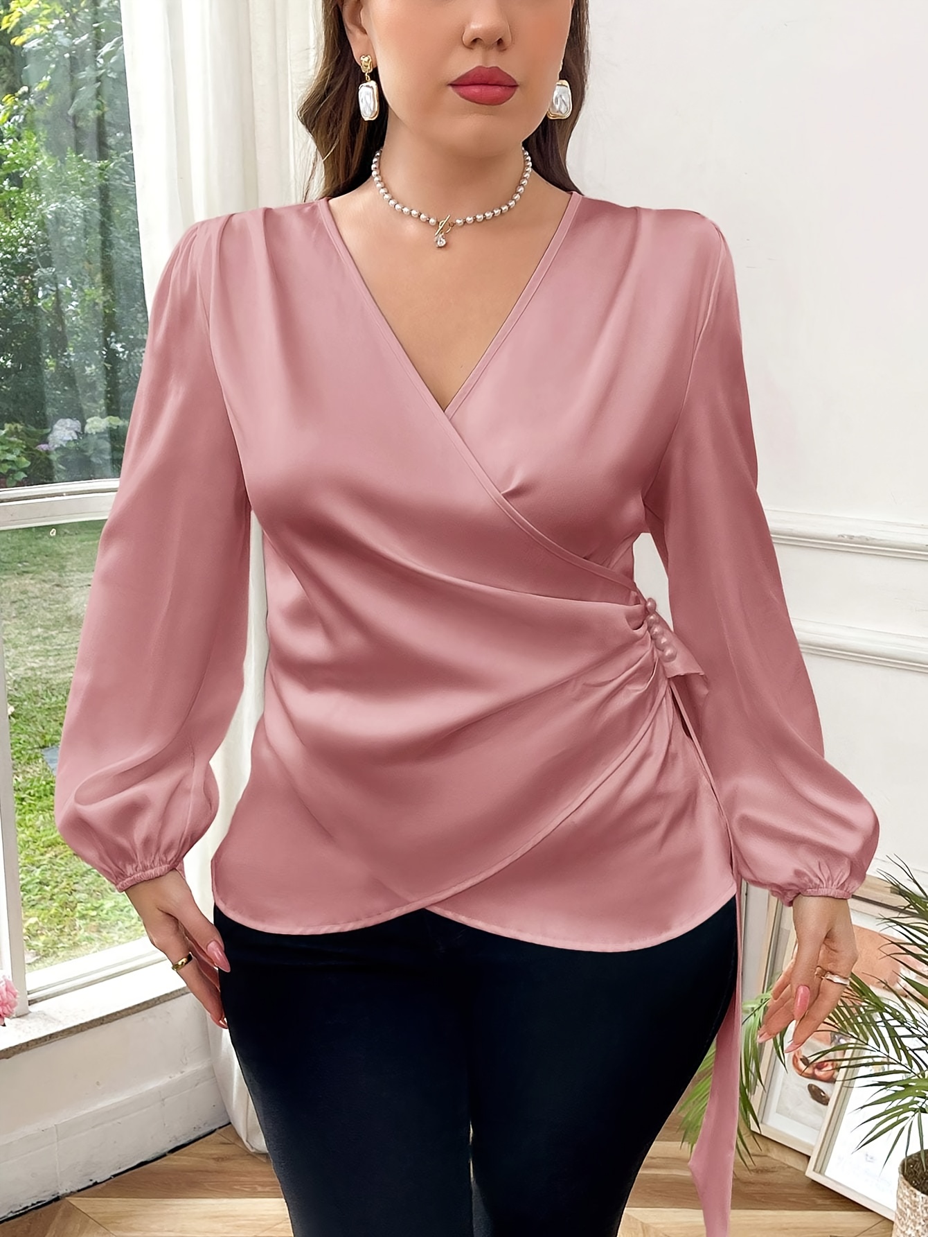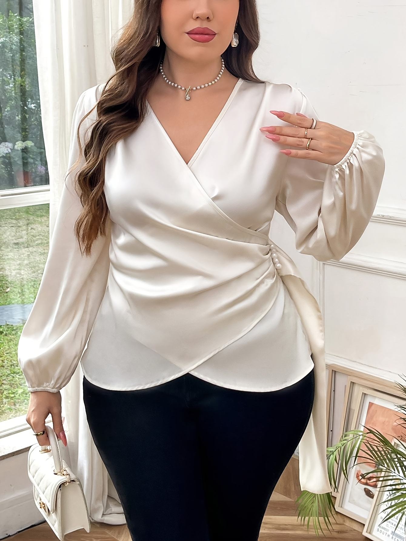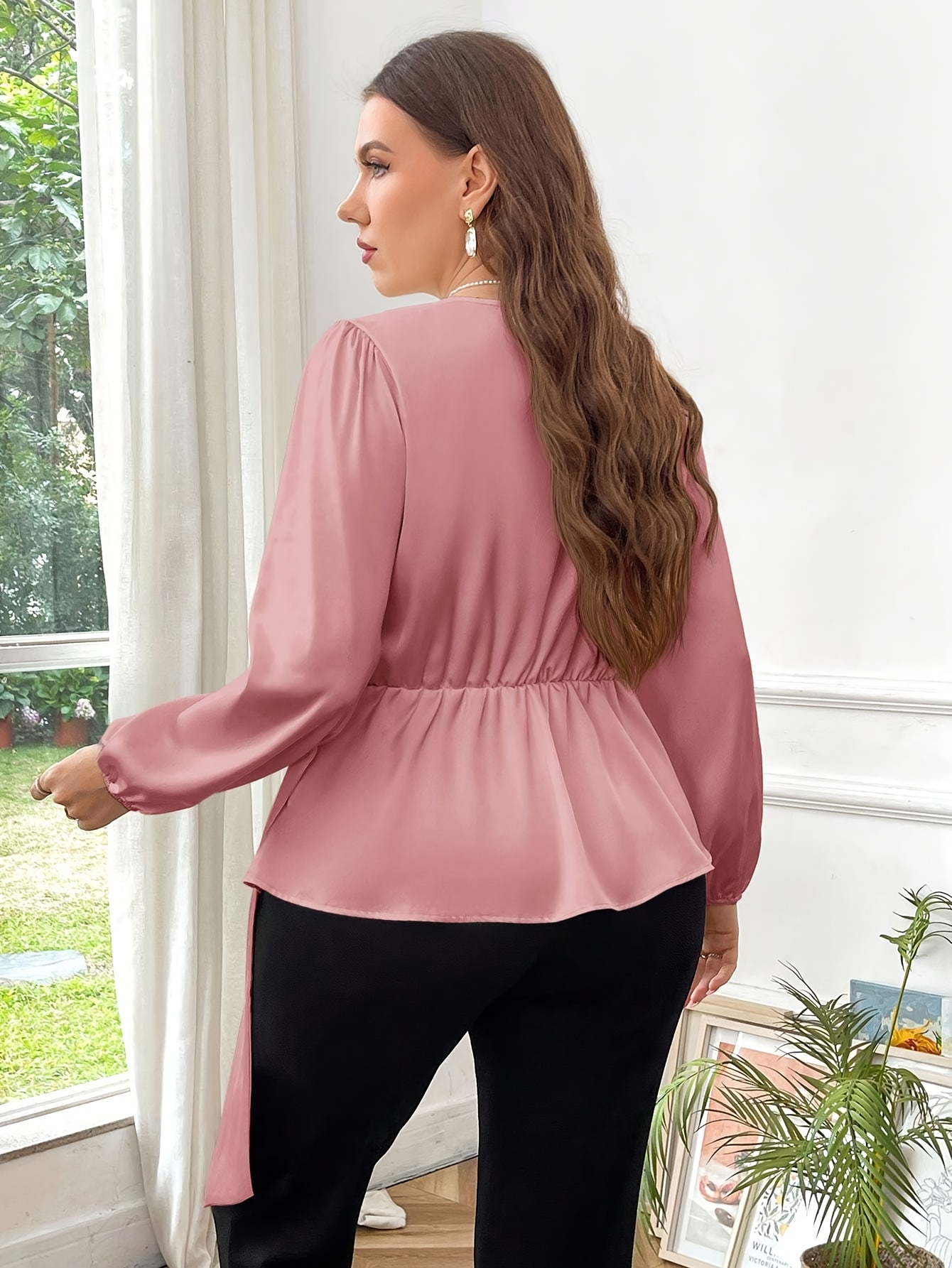 Chemise Élégante à Manches Longues, Col en V, Volant Asymétrique et Perles, Taille Grande, Couleur Unie