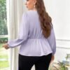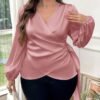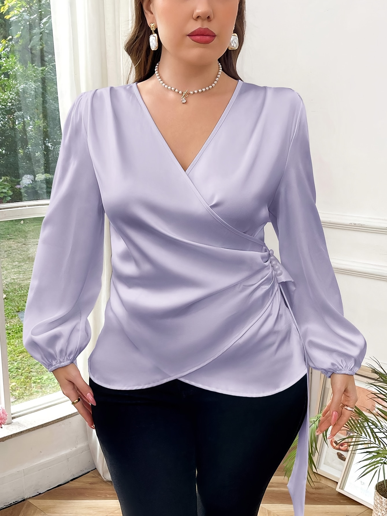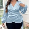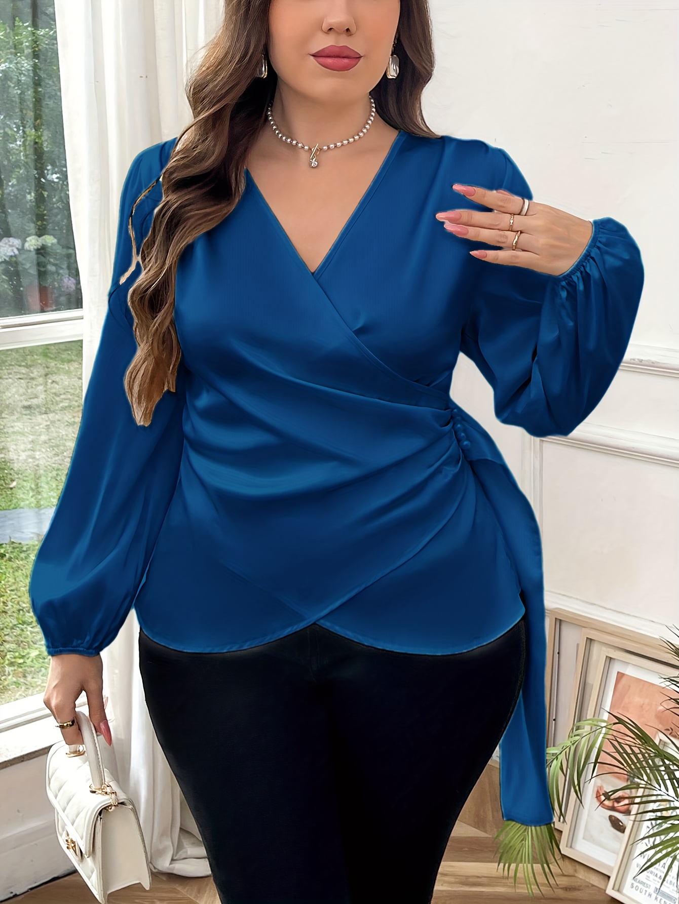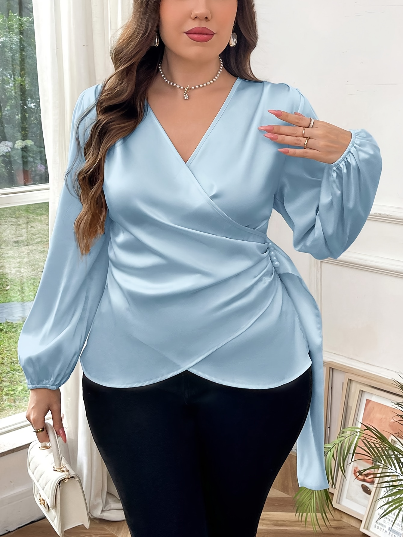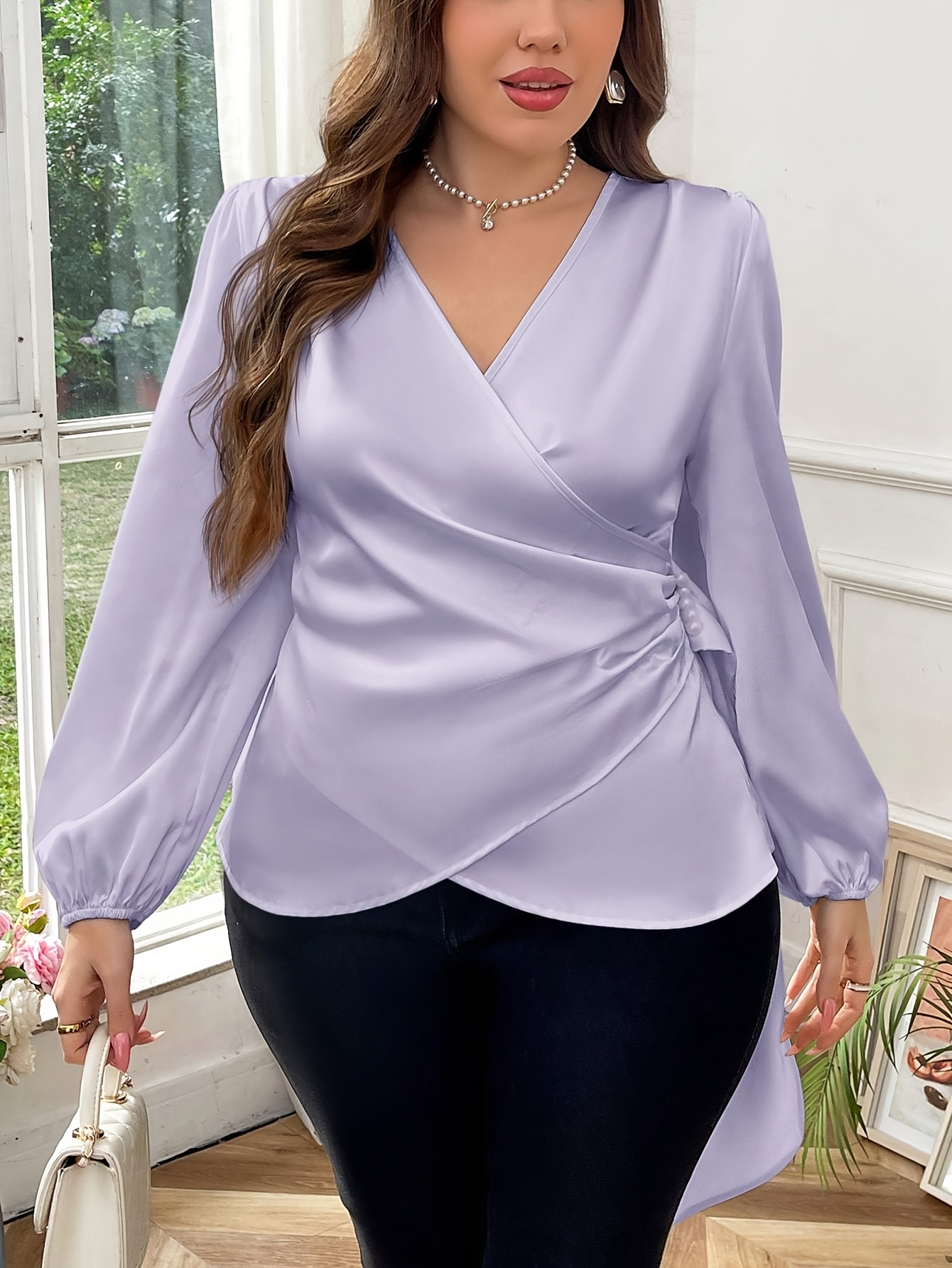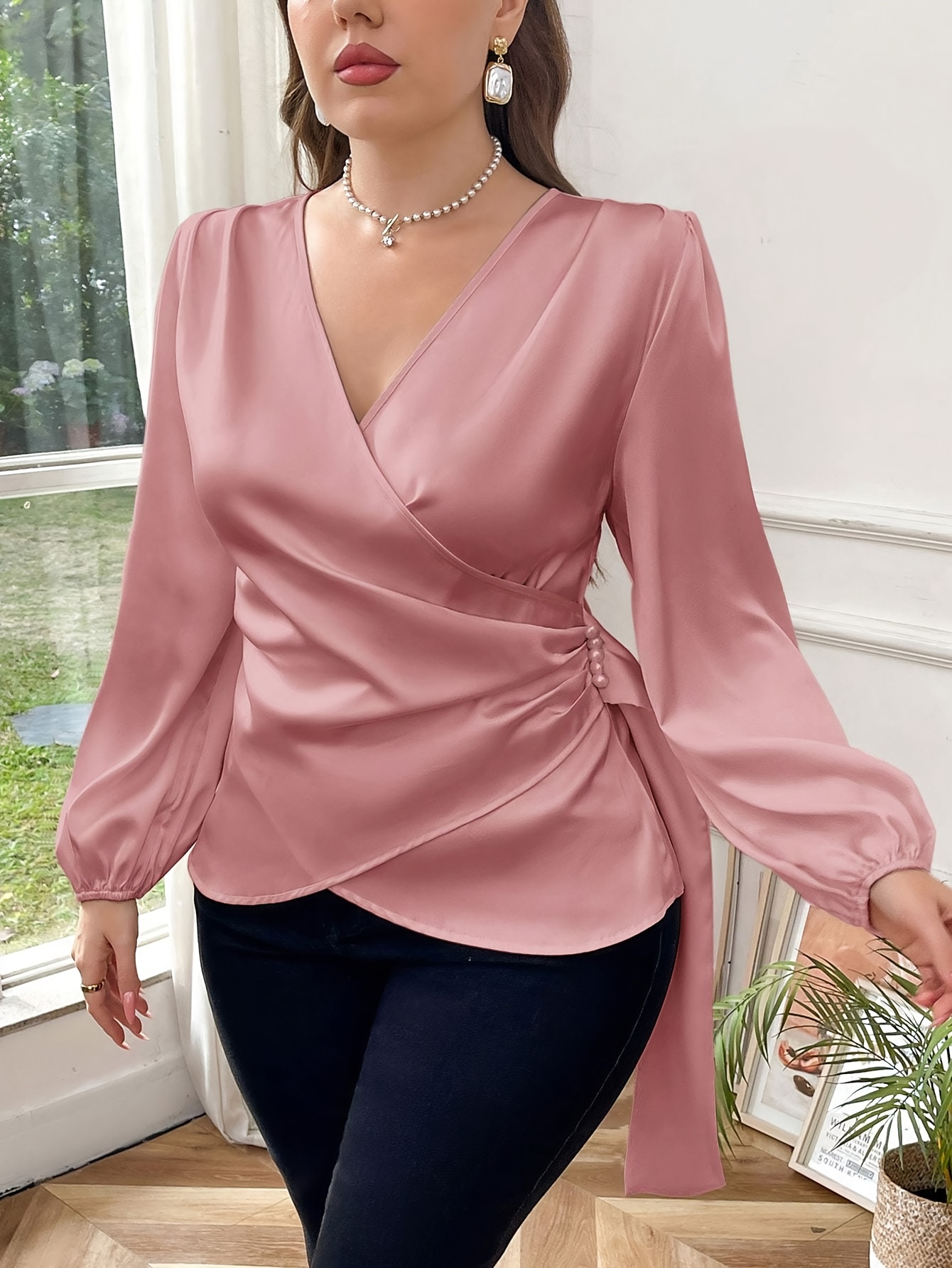 Chemise Élégante à Manches Longues, Col en V, Volant Asymétrique et Perles, Taille Grande, Couleur Unie