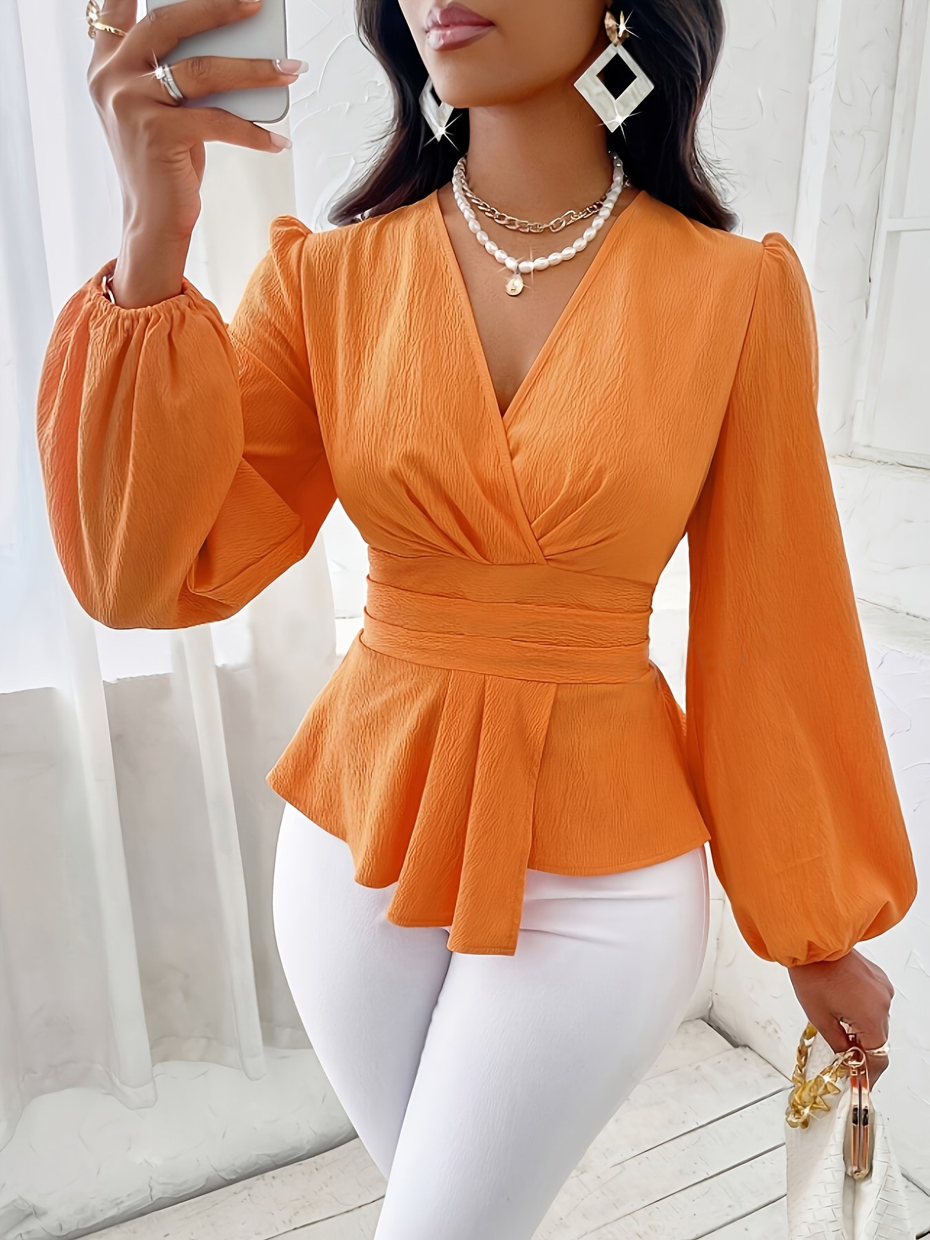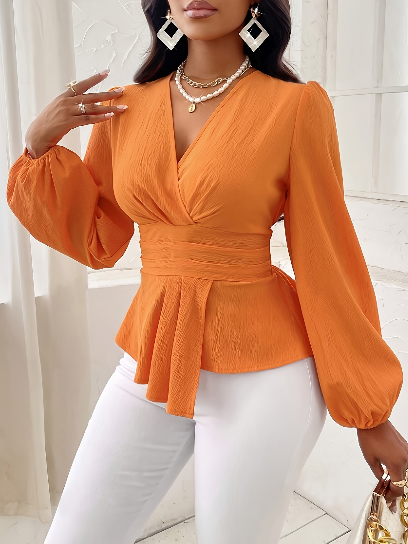 Chemise élégante de voyage, couleur unie, plissée, ourlet asymétrique, manches longues, col en V, blouse à manches lanternes tendance et polyvalente pour femmes, idéale pour le printemps et l'automne