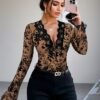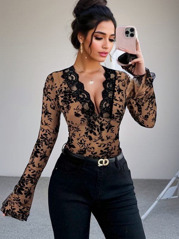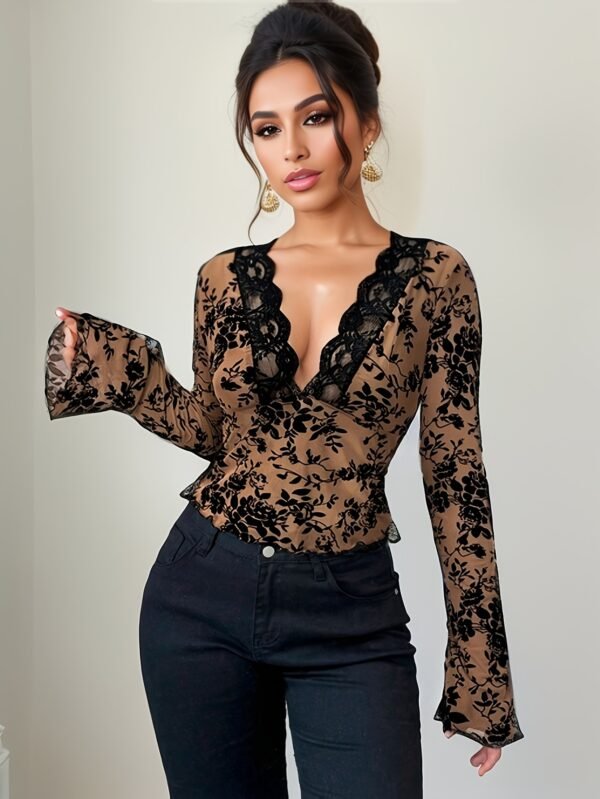 Chemise Femme Tendance Bestseller Sexy Rétro à Encolure Profonde en Dentelle – Imprimé Floral, Manches Longues Semi-Transparente pour Printemps/Automne, Lavage à la Main, Style Décontracté, Tissu Delicat, Coupe Ajustée, Détails en Dentelle, Haut Élégant, Mode Printanière, Blouse de Bureau