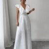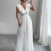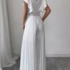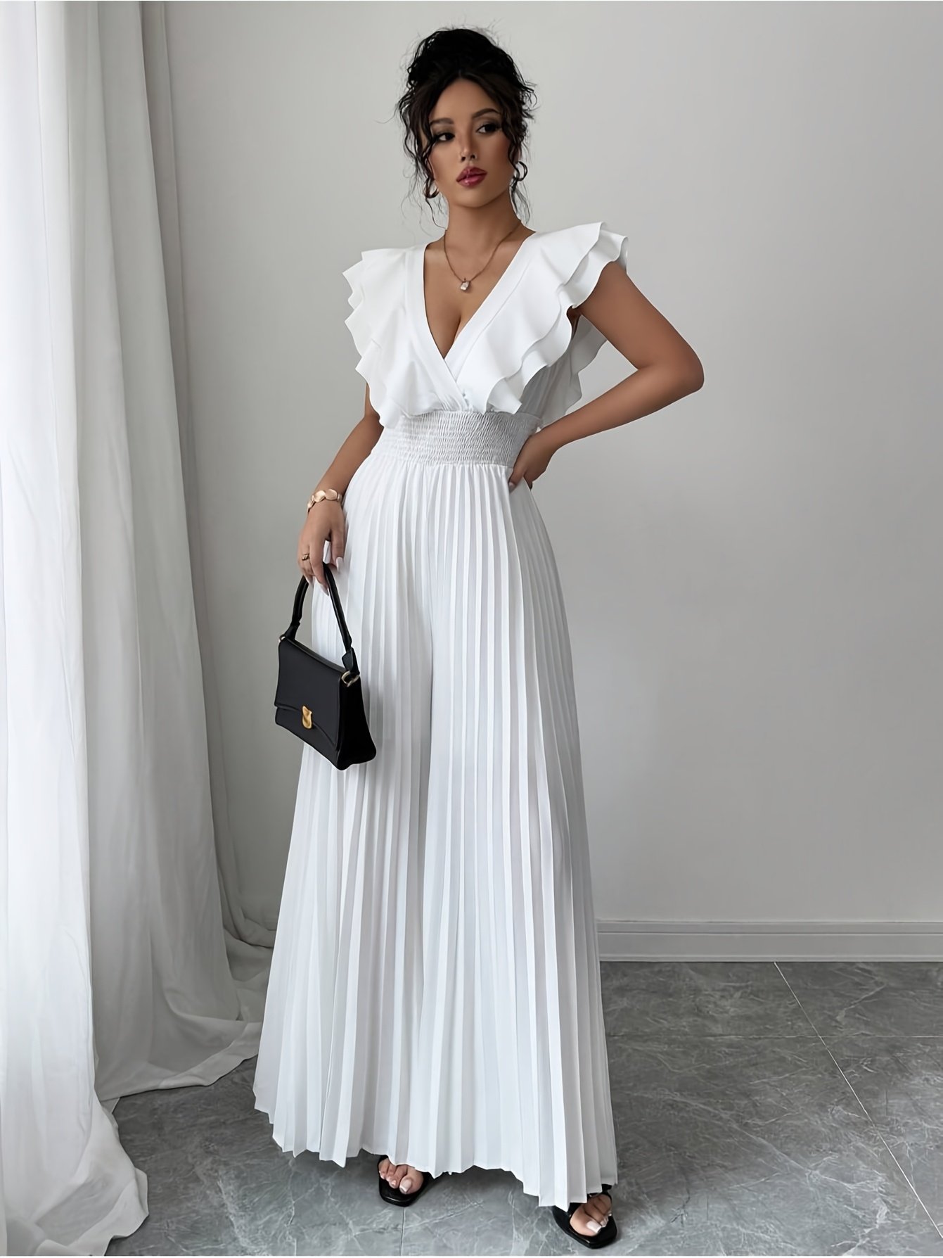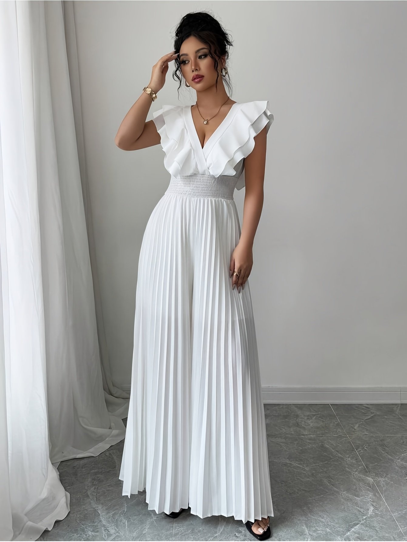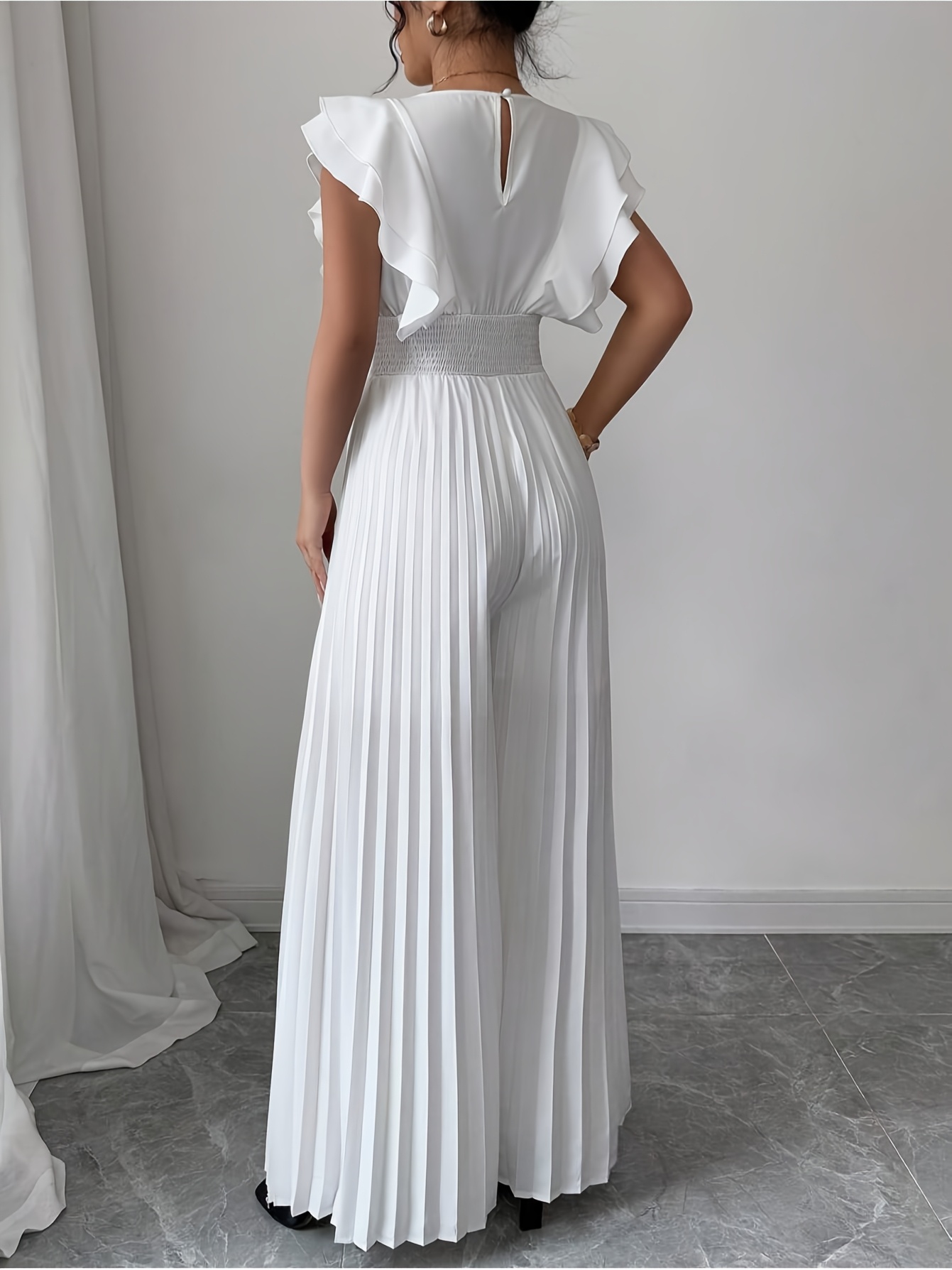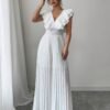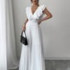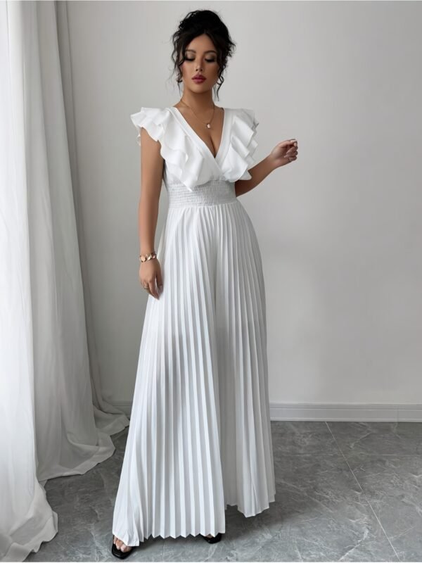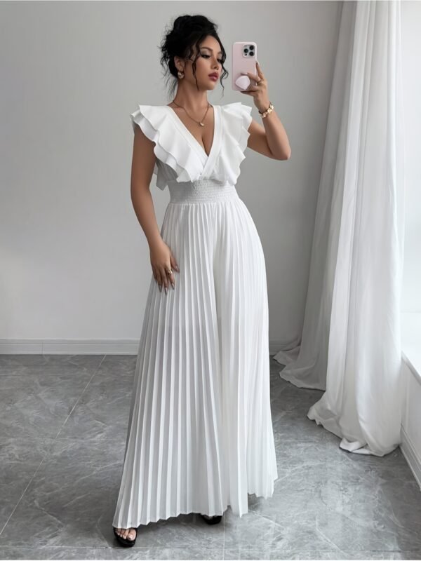 Combinaison élégante blanche décontractée avec col en V, jambes évasées