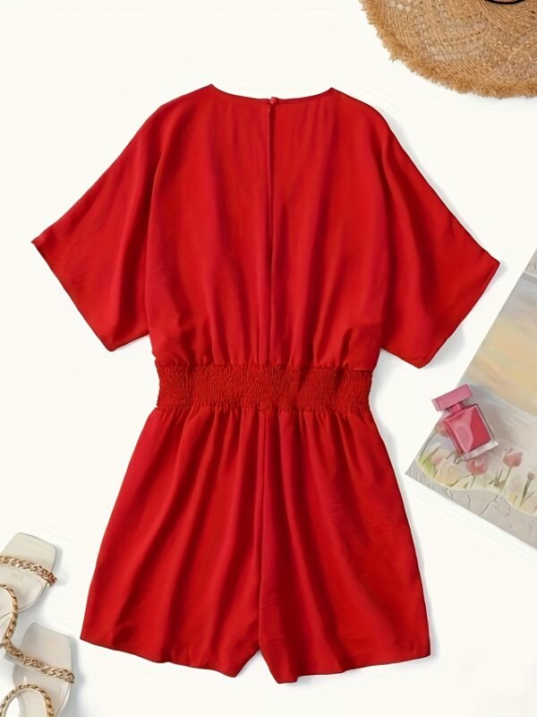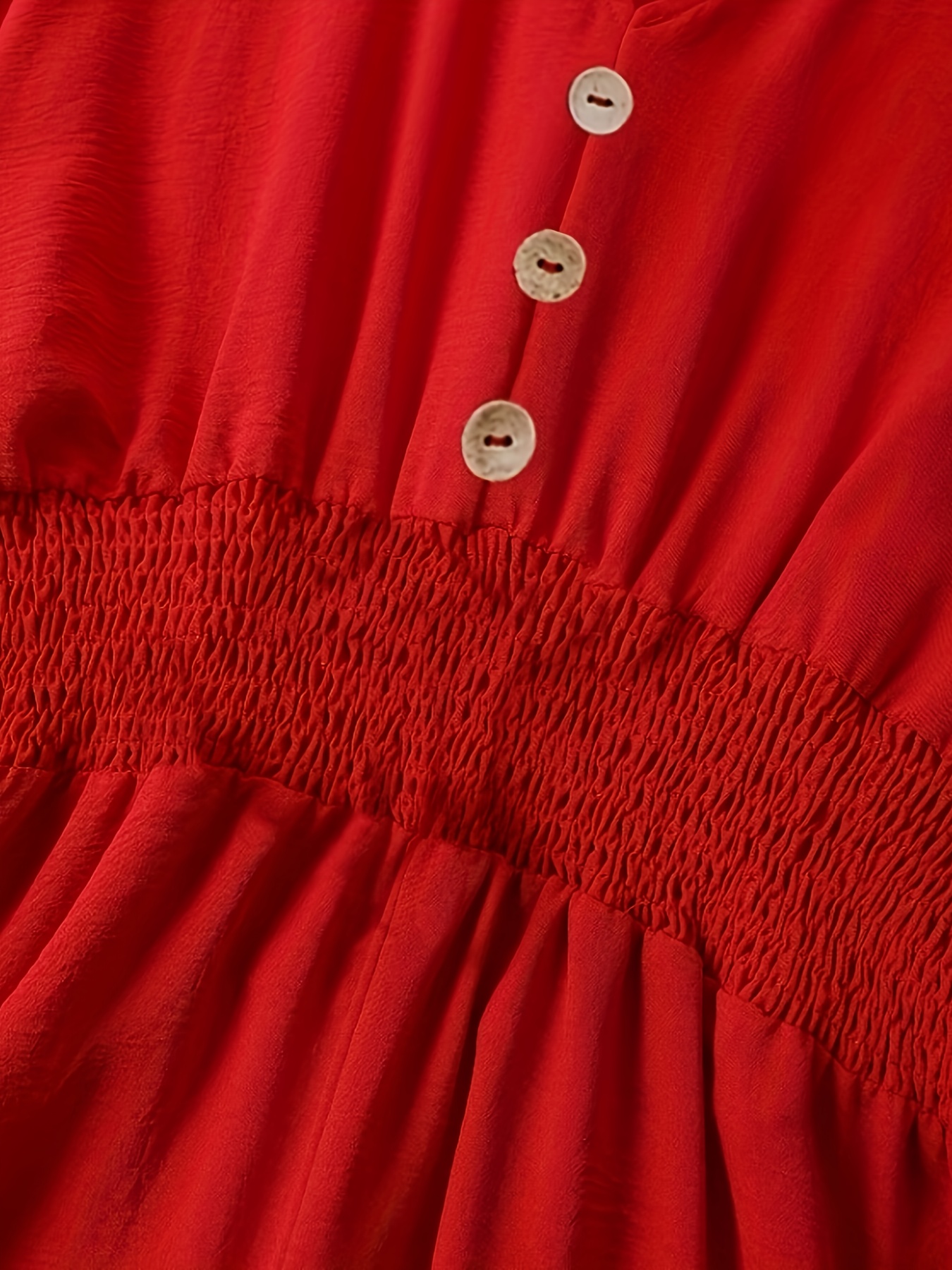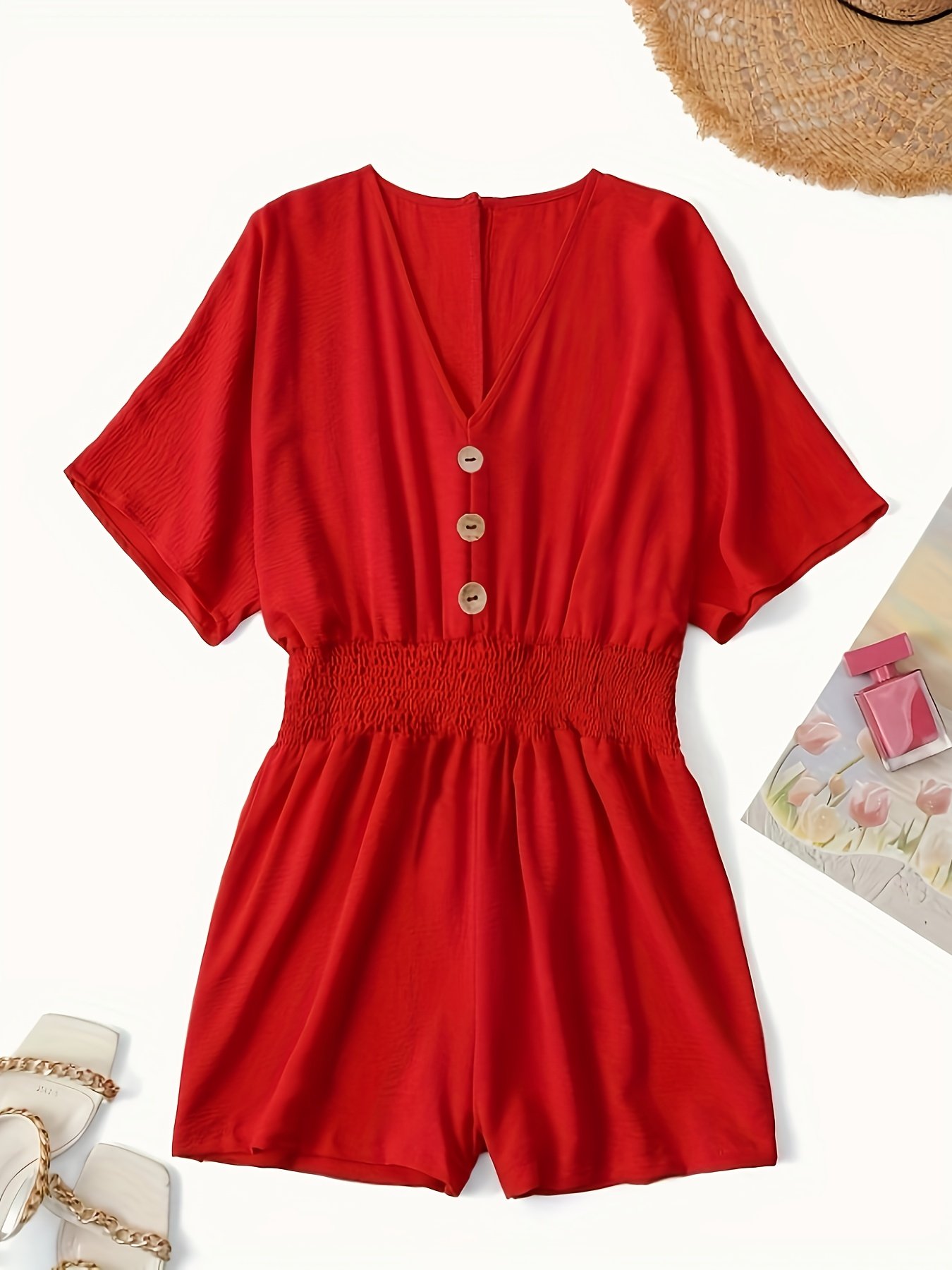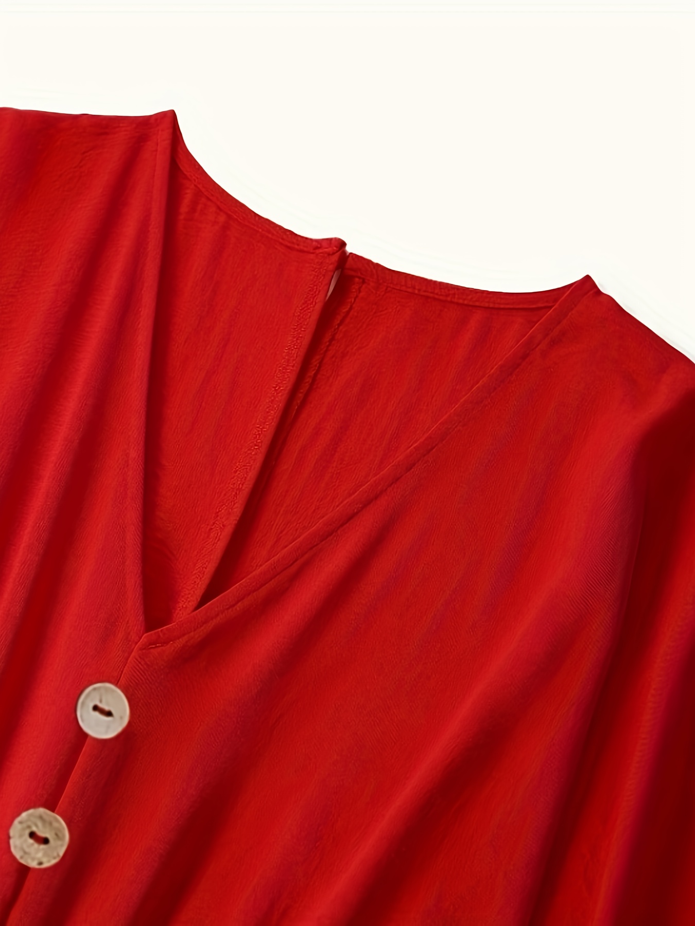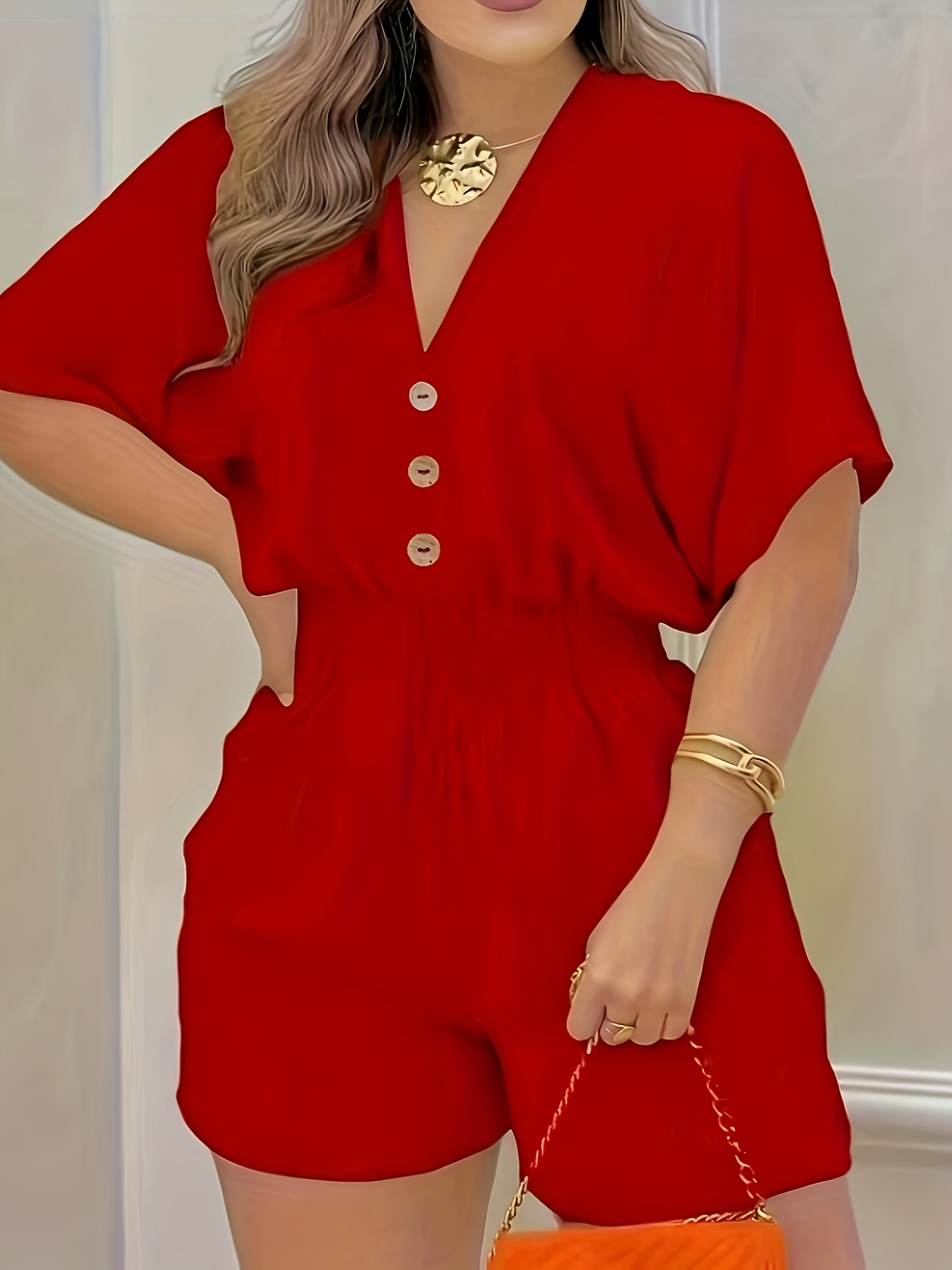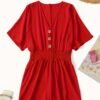 Combinaison Rouge Unie à Col en V avec Boutons et Manches Reversibles