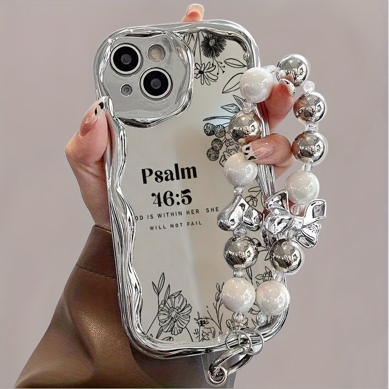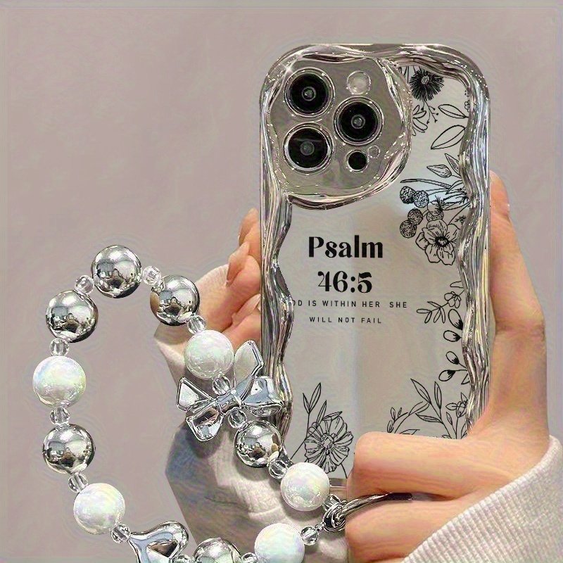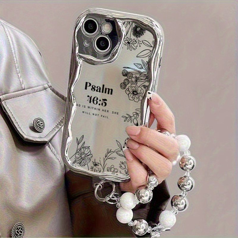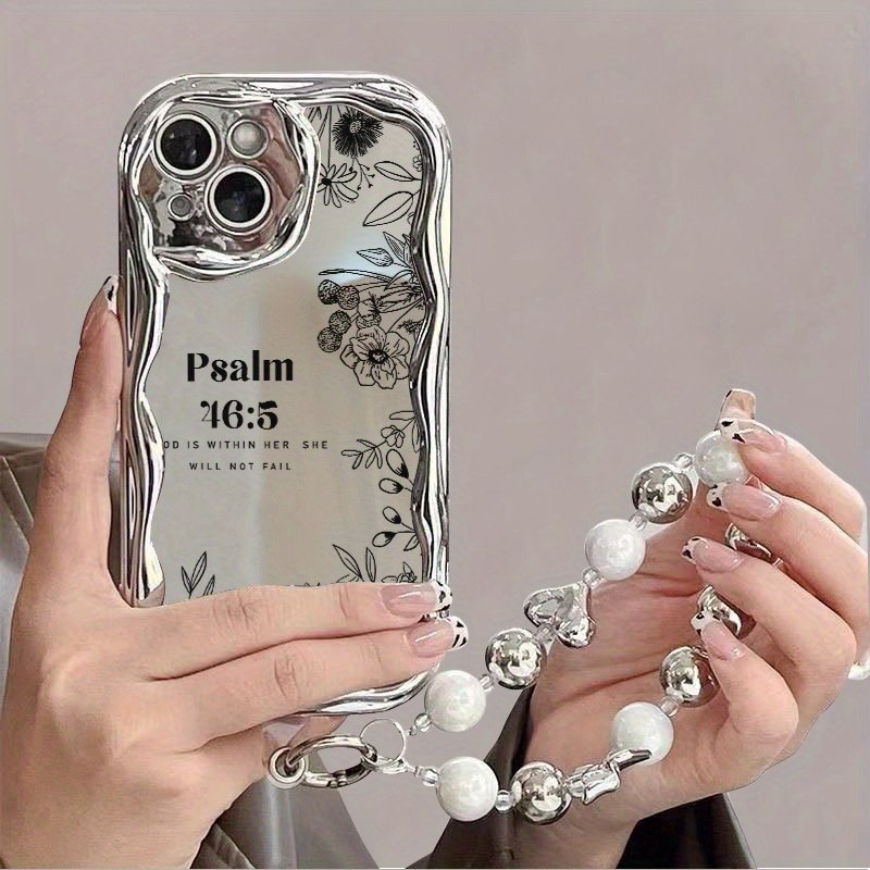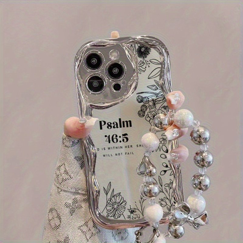 Coque de téléphone – Une coque de téléphone élégante et créative avec un motif floral conçu pour la résistance aux chocs, dotée d’un design unique avec des bords incurvés argentés électroplaqués et des bracelets de perles. Elle est compatible avec iPhone