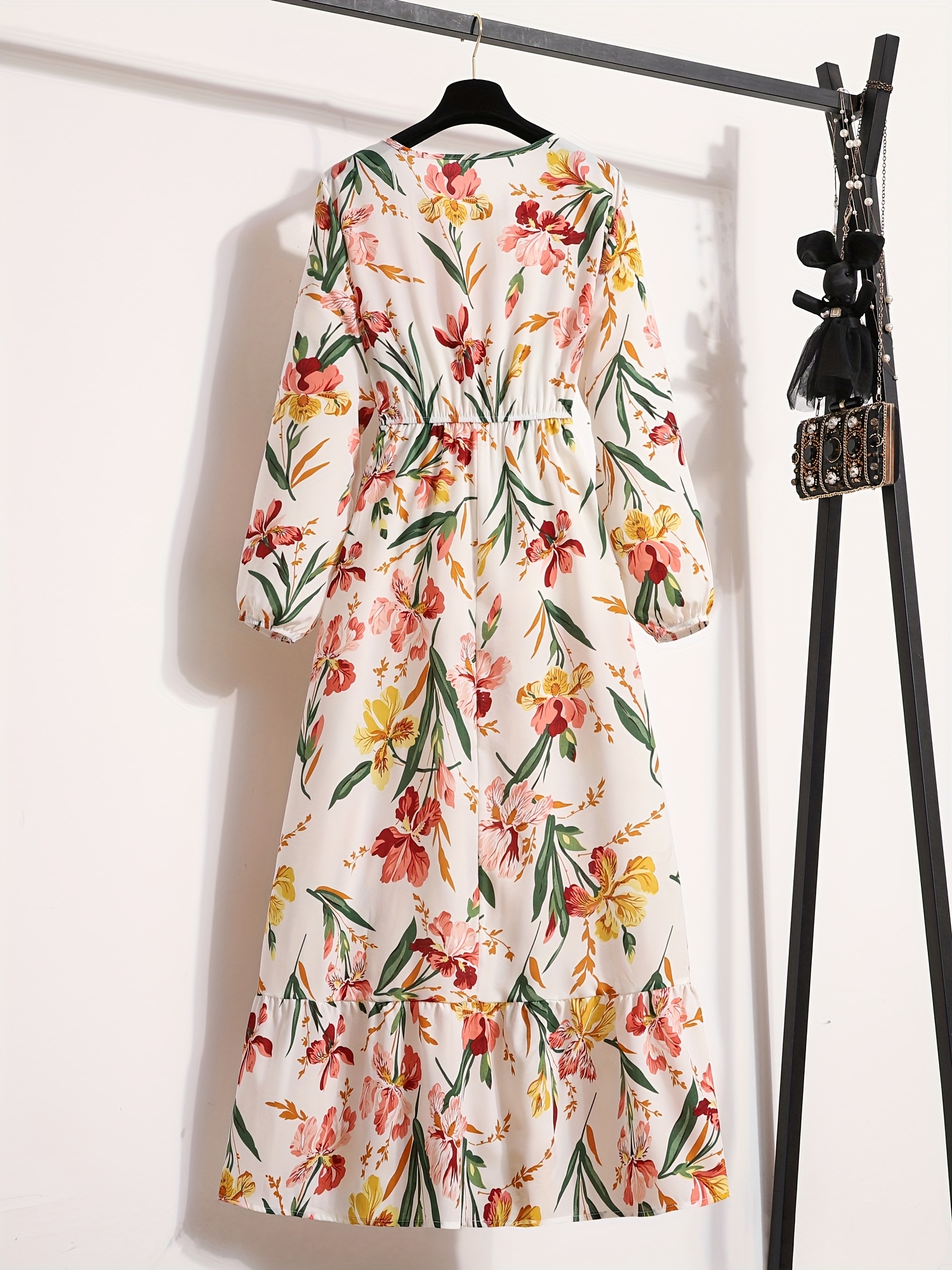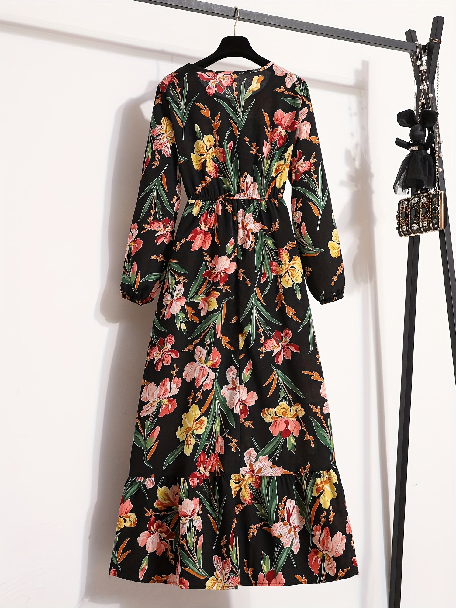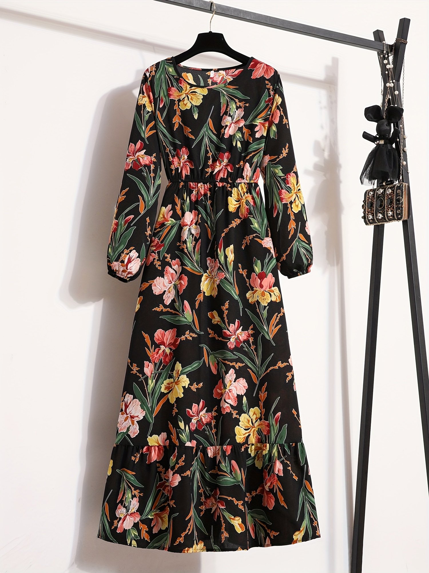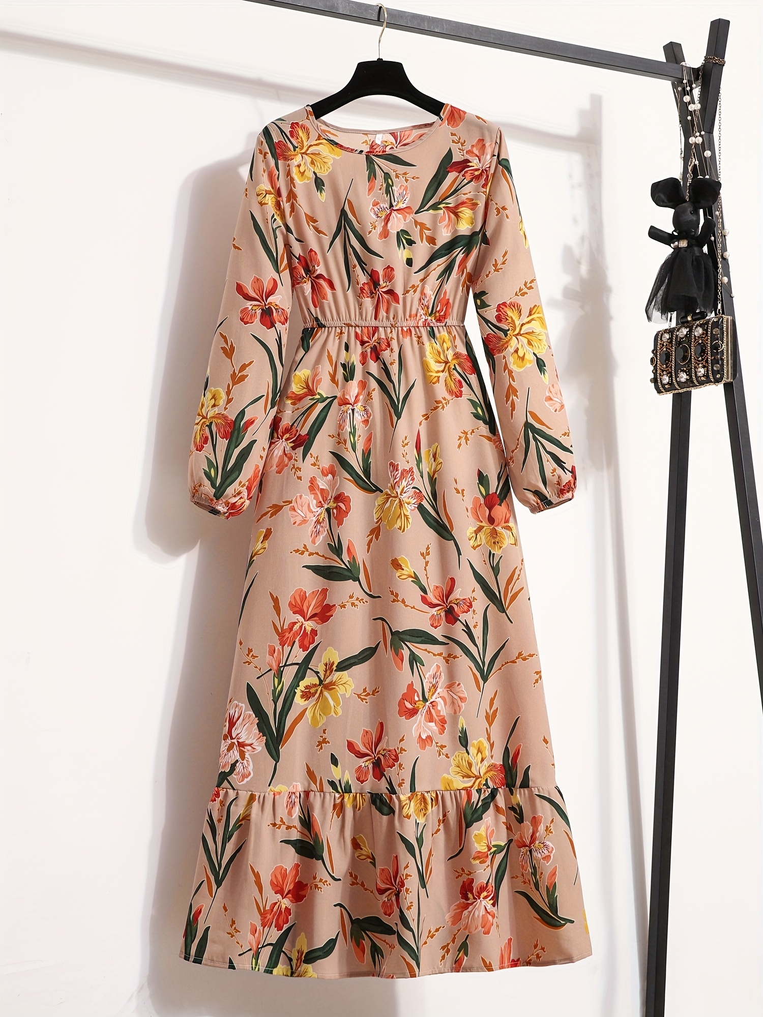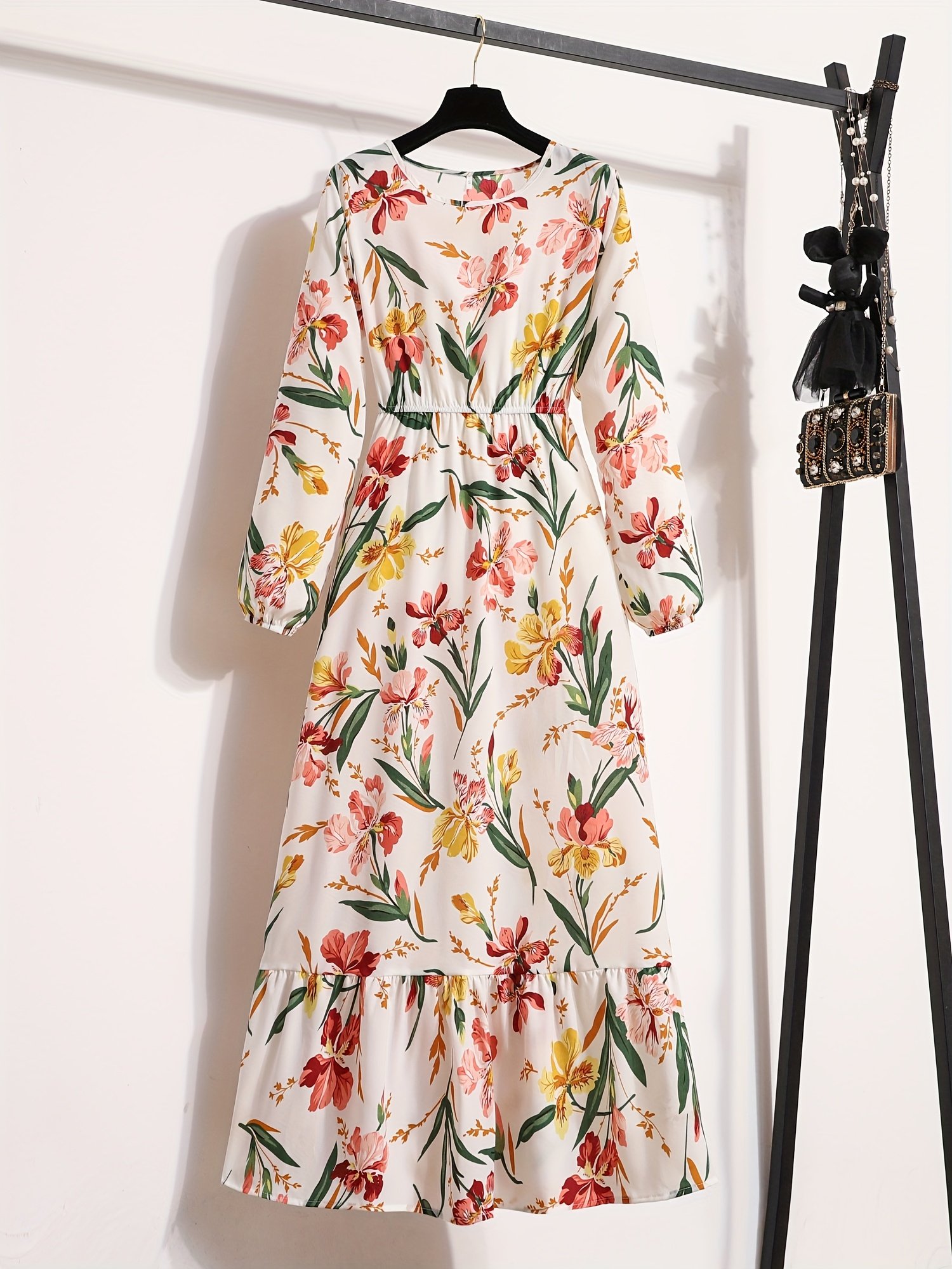 Élégante robe à manches longues et col rond avec imprimé floral de narcisses pour femmes