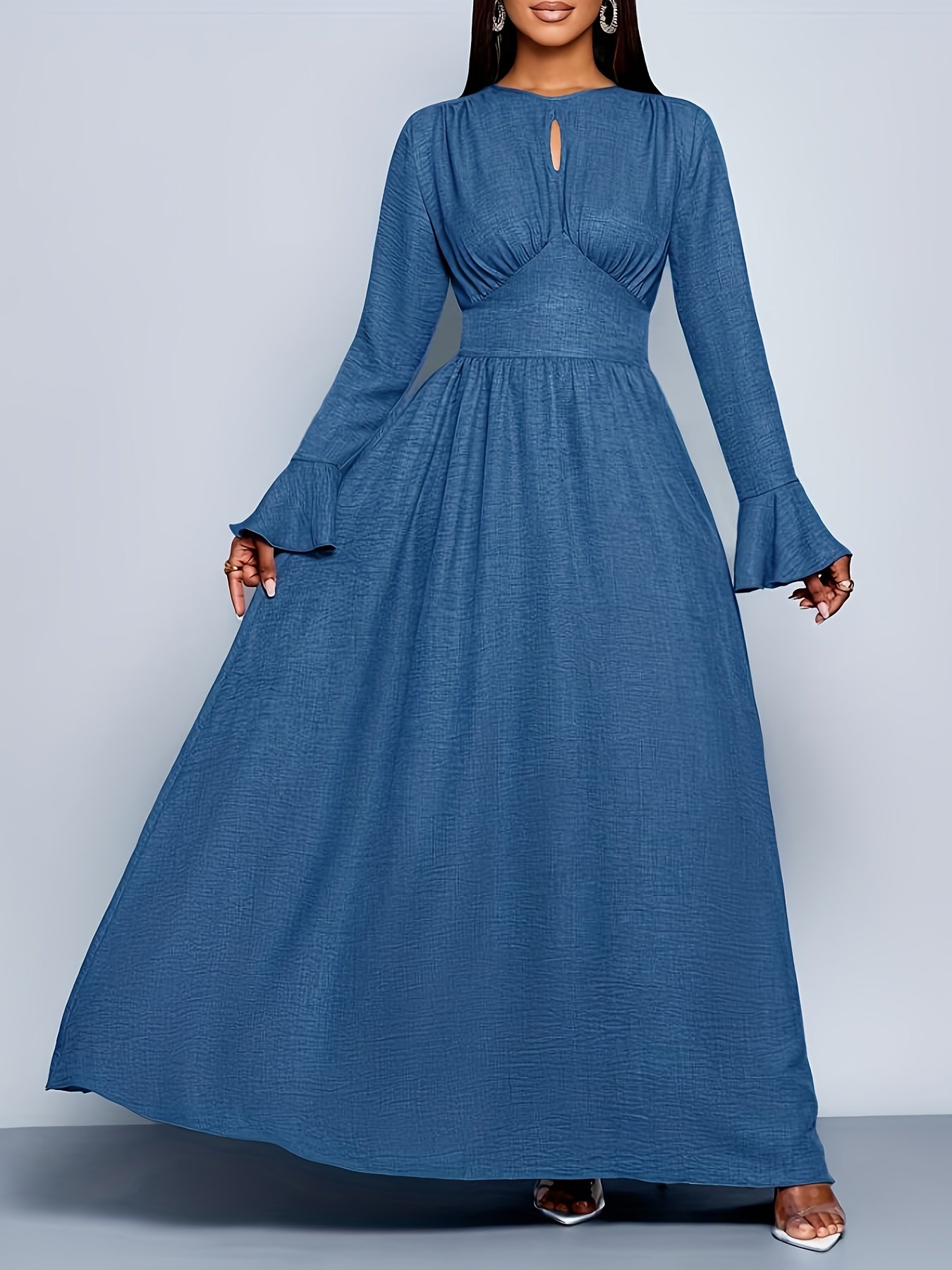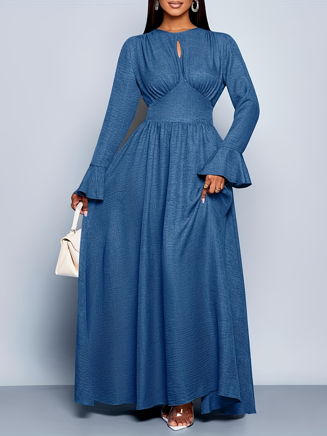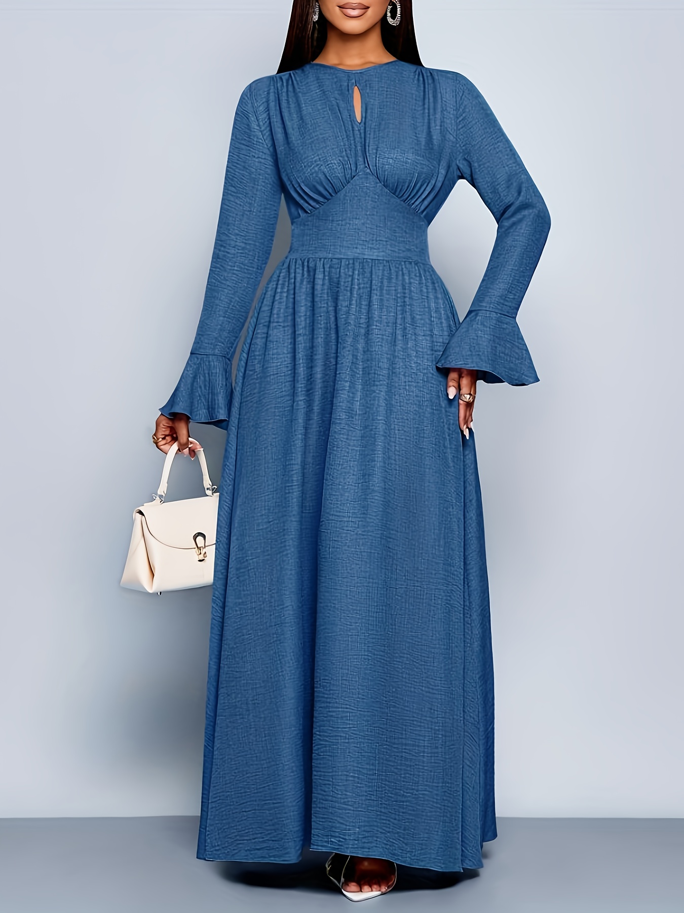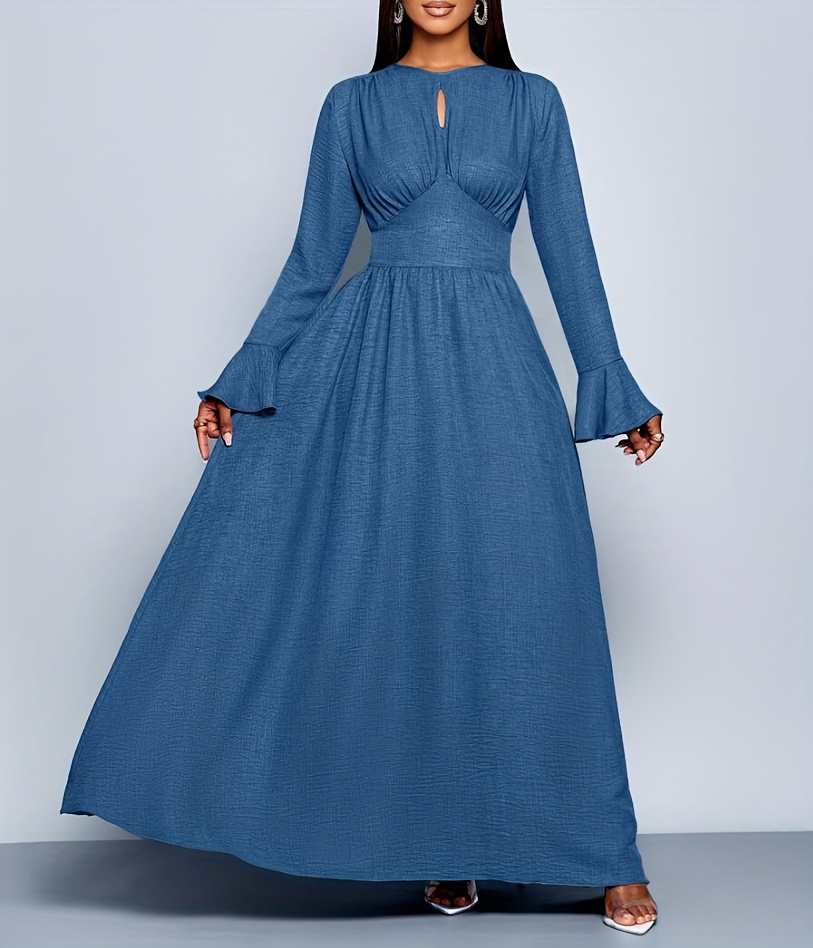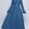 Élégante robe maxi trapèze en tissu bleu | Volants évasés, manches longues, col rond, dos ajouré, taille plissée, taille large, parfaite pour demoiselle d’honneur, décontractée, trajets quotidiens, sorties, soirées