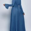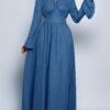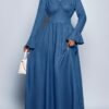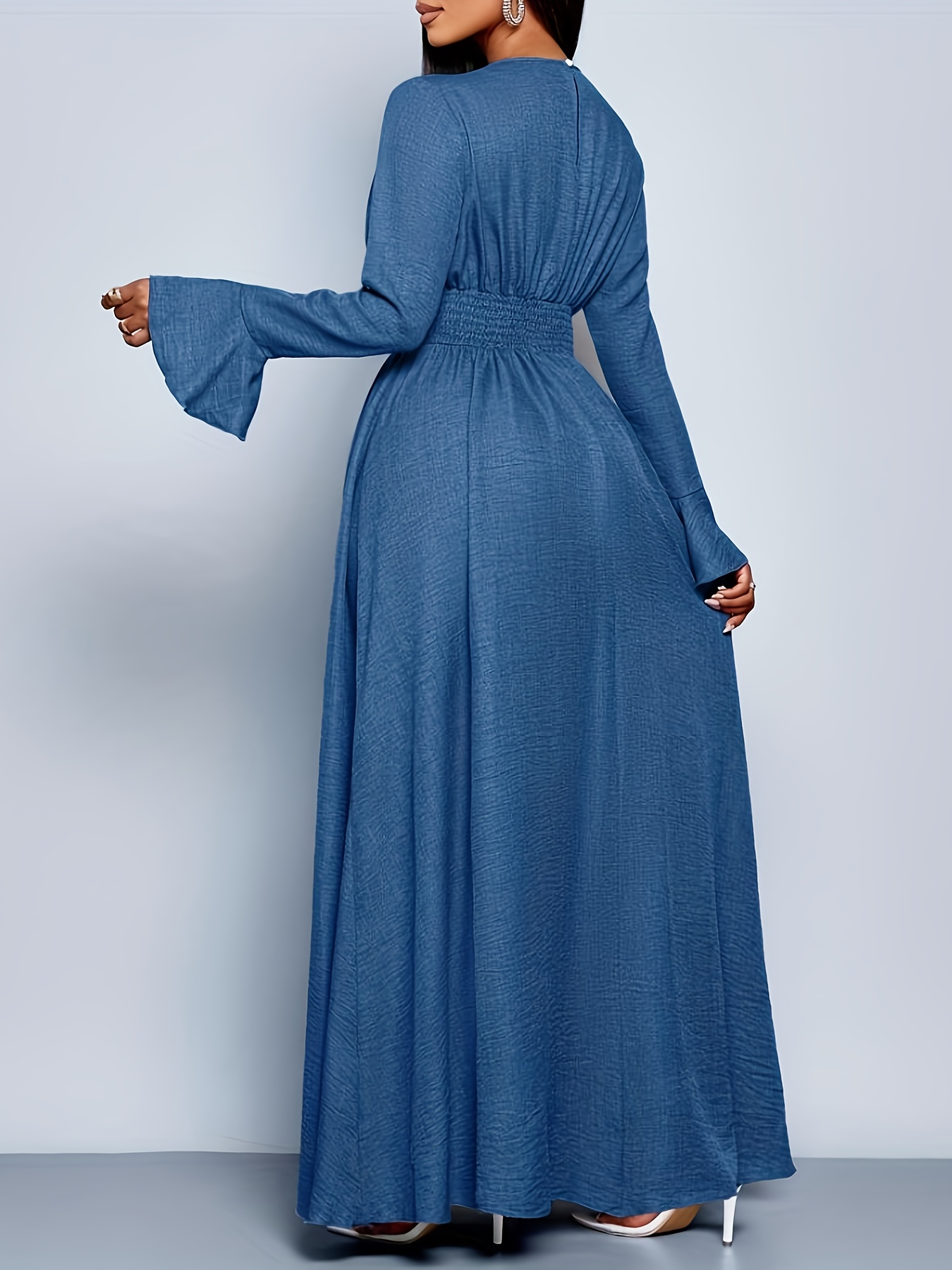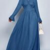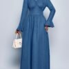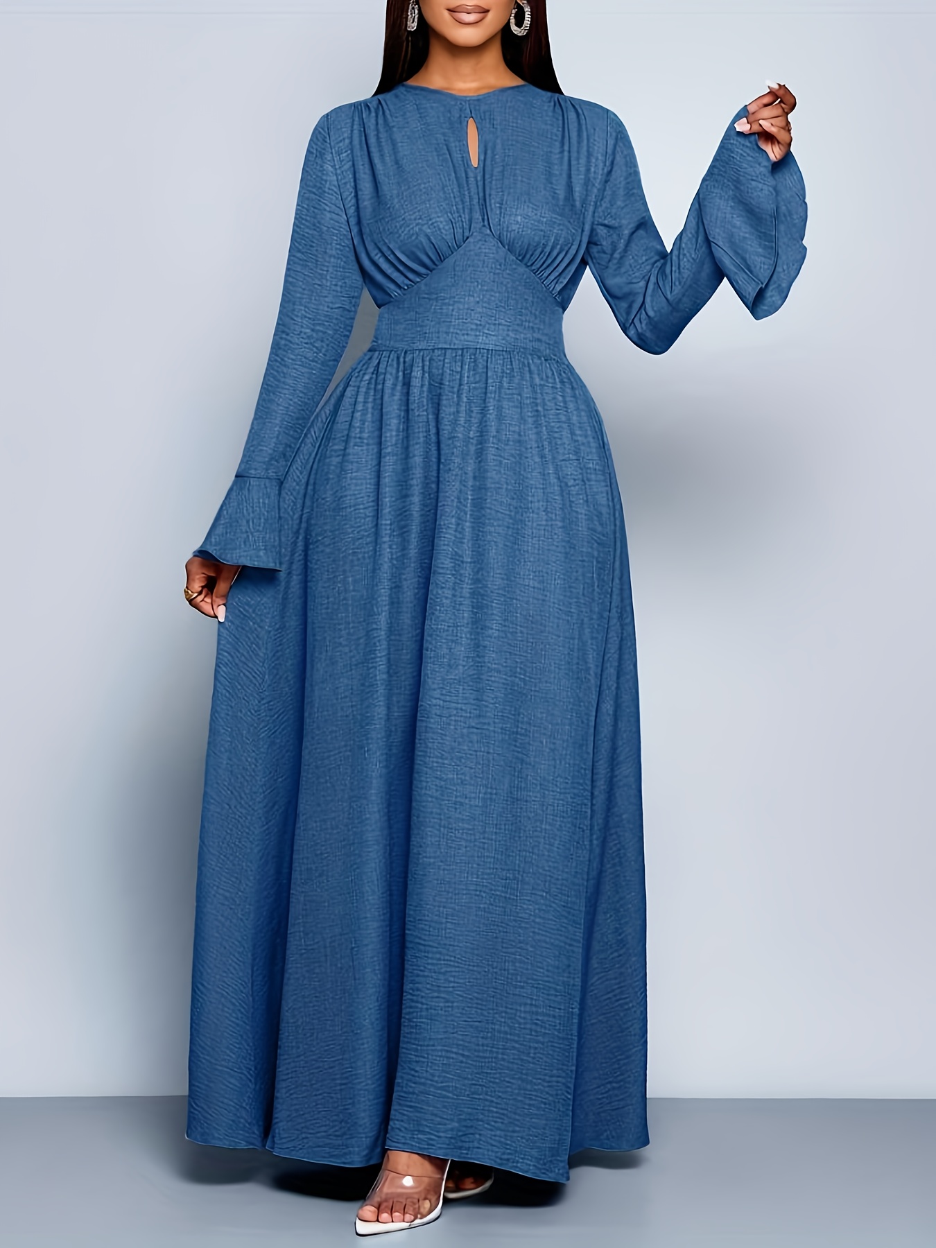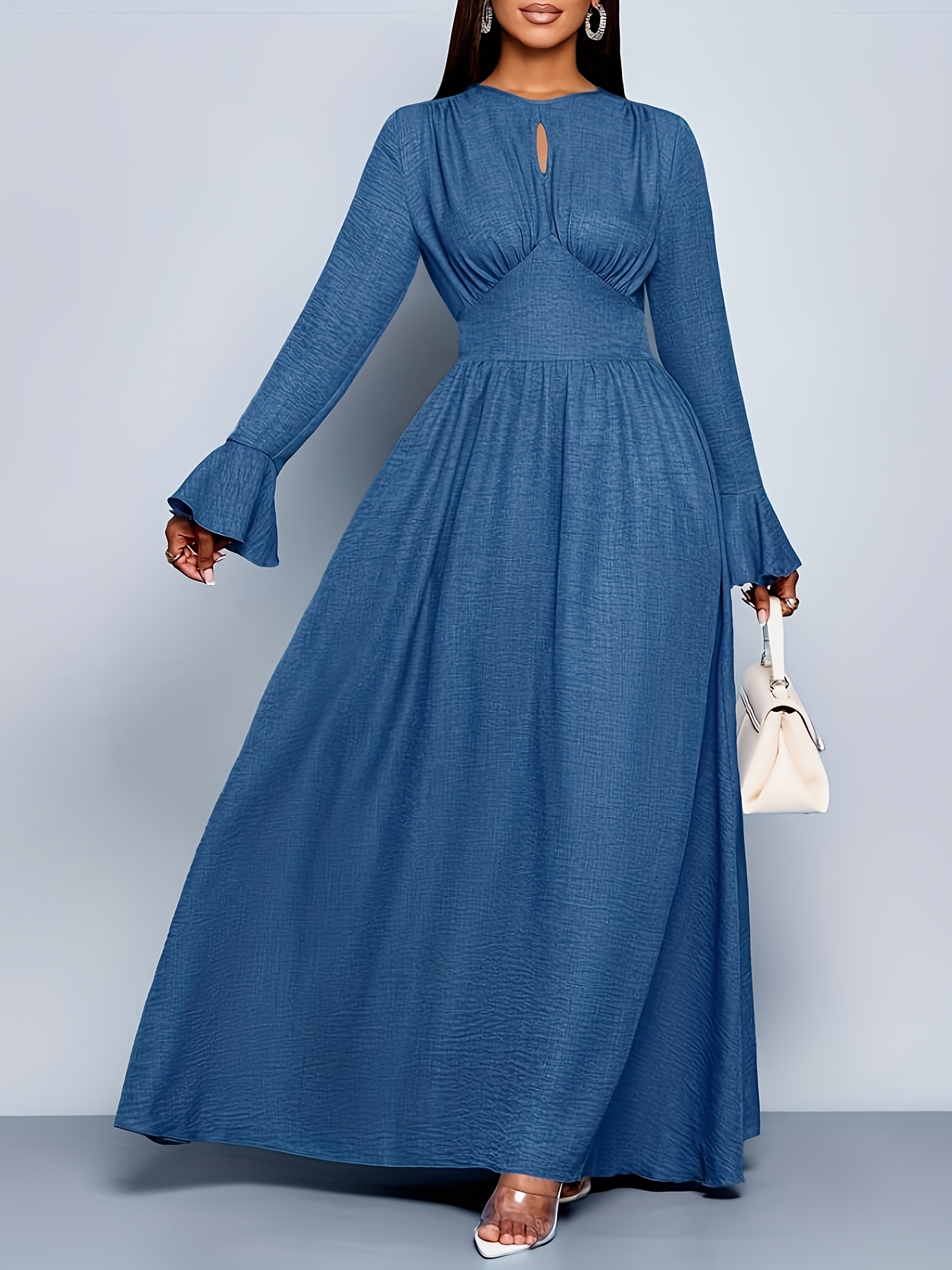 Élégante robe maxi trapèze en tissu bleu | Volants évasés, manches longues, col rond, dos ajouré, taille plissée, taille large, parfaite pour demoiselle d’honneur, décontractée, trajets quotidiens, sorties, soirées
