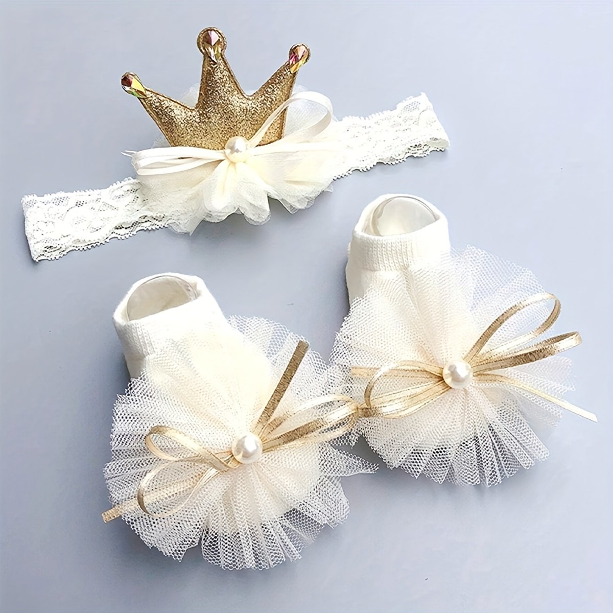 Ensemble couronne et chaussettes pour bébé – 1 set blanc en polyester tricoté – Lavage à la main uniquement – Pour 0-1 an – Avec boîte cadeau