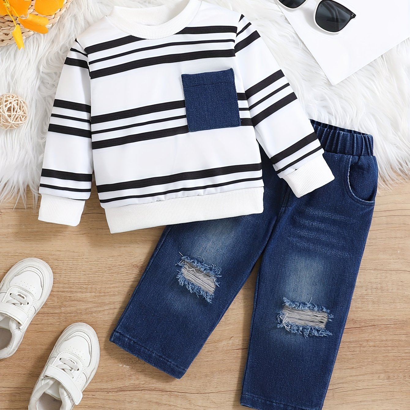 ensemble de pièces pour bébé garçon, haut à manches longues à rayures + pantalon en denim, pour lextérieur Détails du produit 1