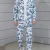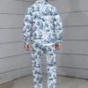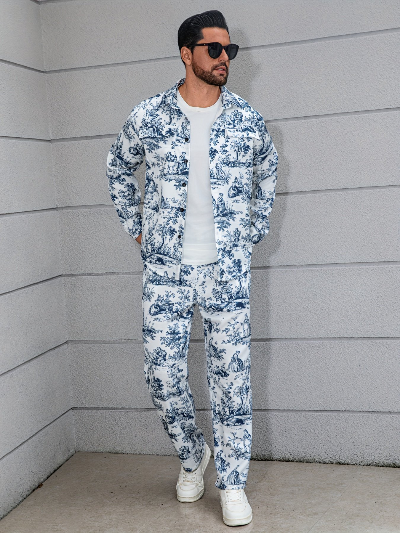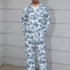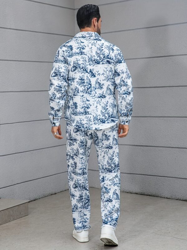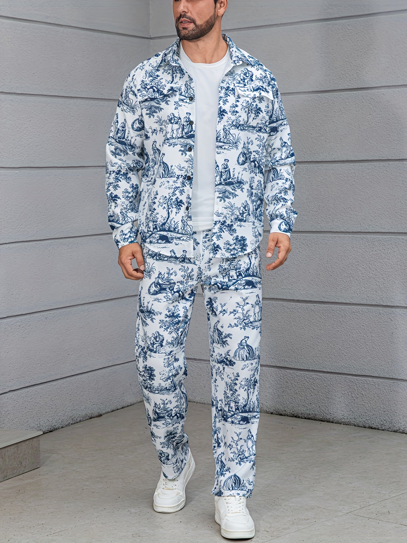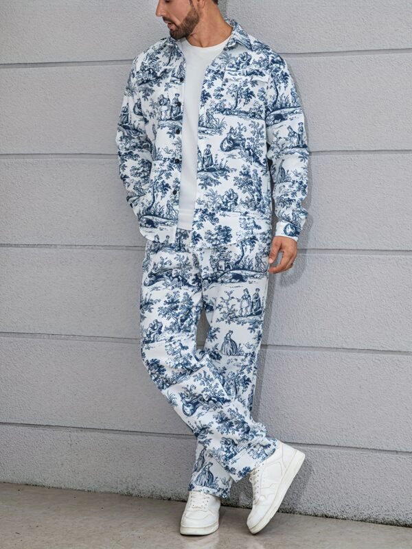 Ensemble décontracté imprimé floral bleu et blanc, pantalon large et ample, tissu non extensible