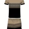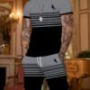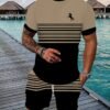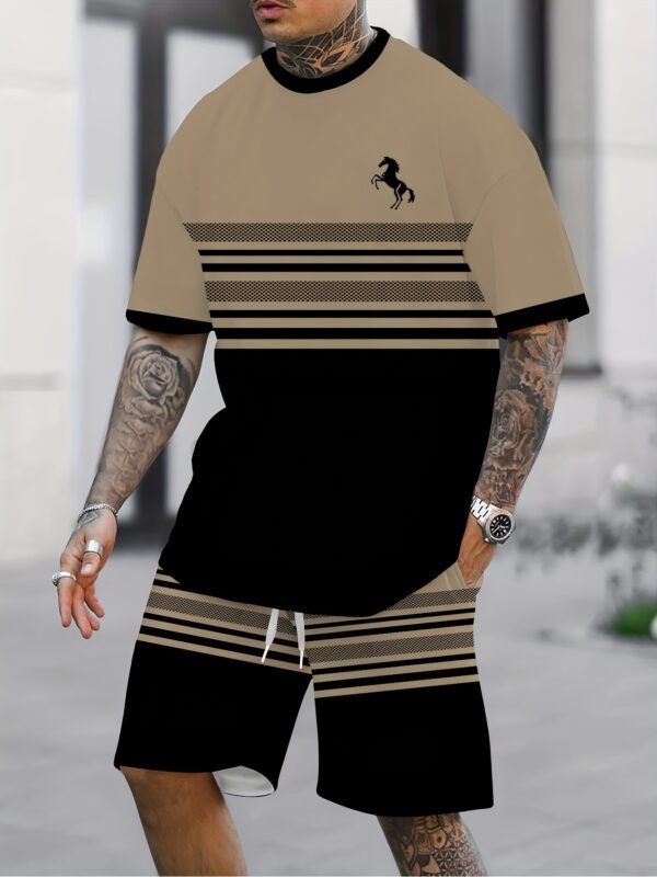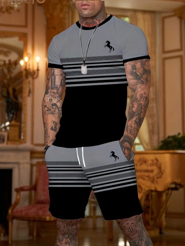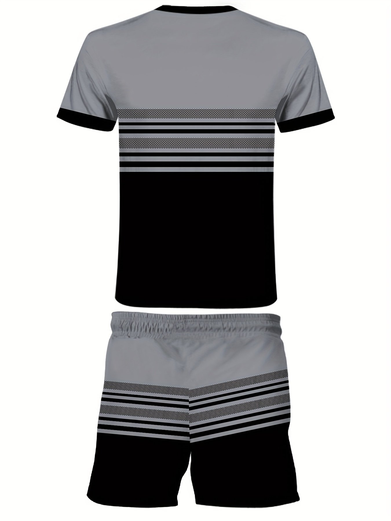 Ensemble décontracté pour hommes à rayures imprimées numériques d’été, T-shirt à col rond et manches courtes avec shorts à cordon de serrage et poches, tricot de col rond, micro-élastique, ensemble sportif régulier pour l’extérieur en été