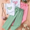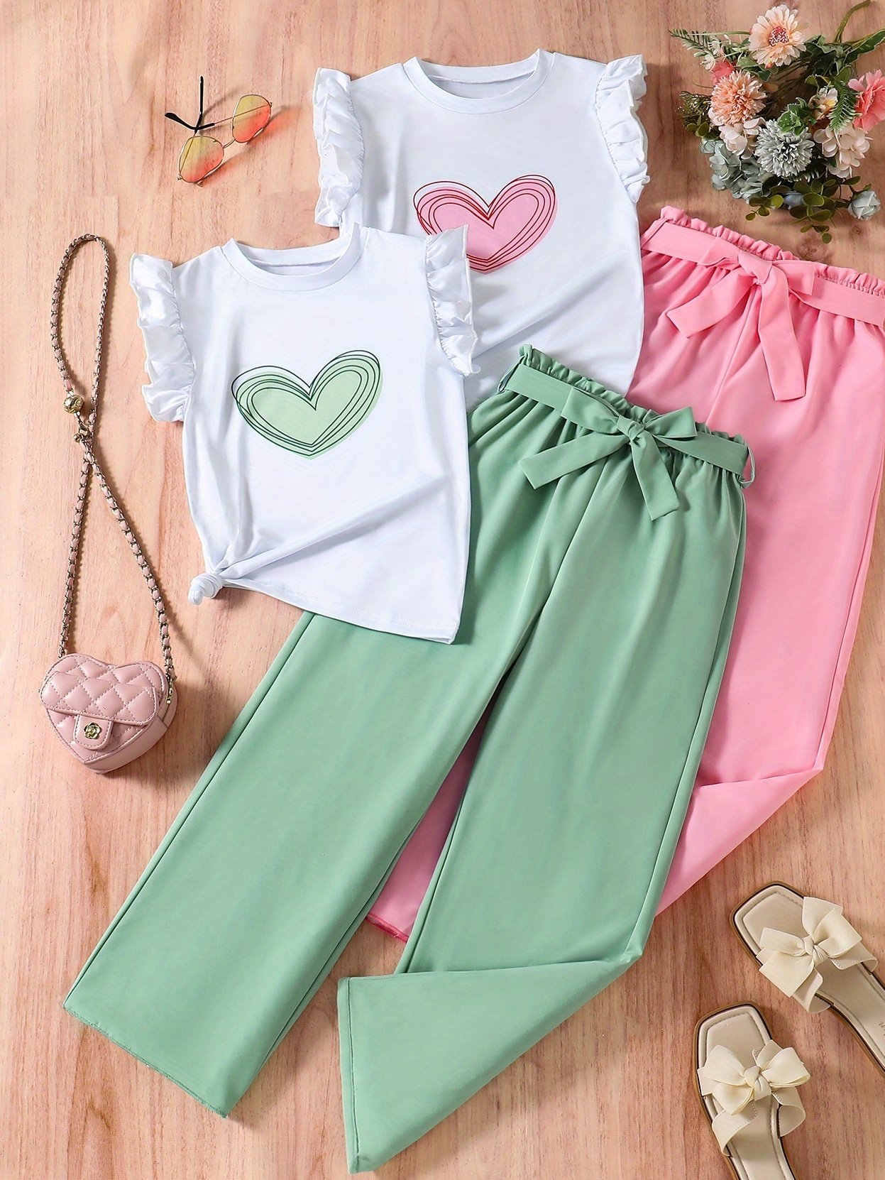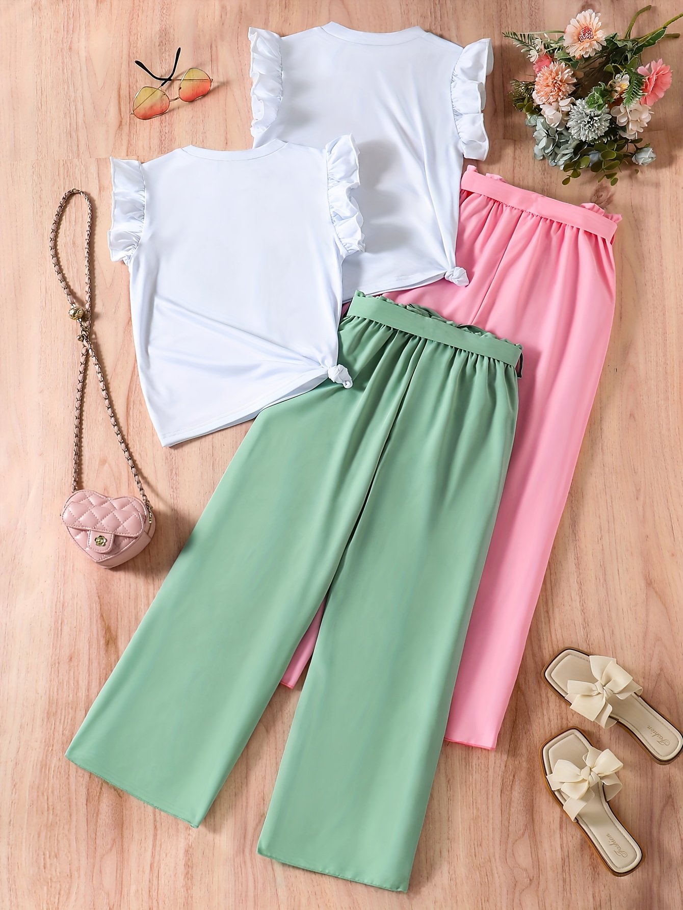 Ensemble fille 4 pièces, haut sans manches et pantalon en tissu fibre slick, style frais, idéal pour extérieur