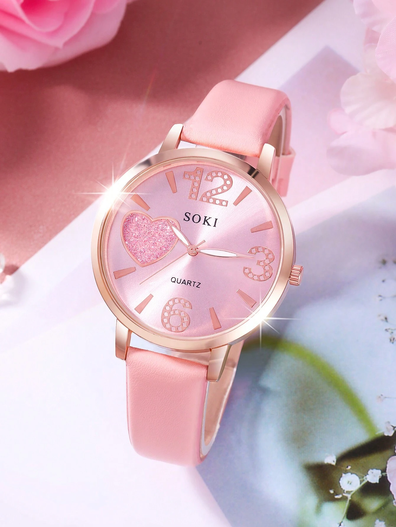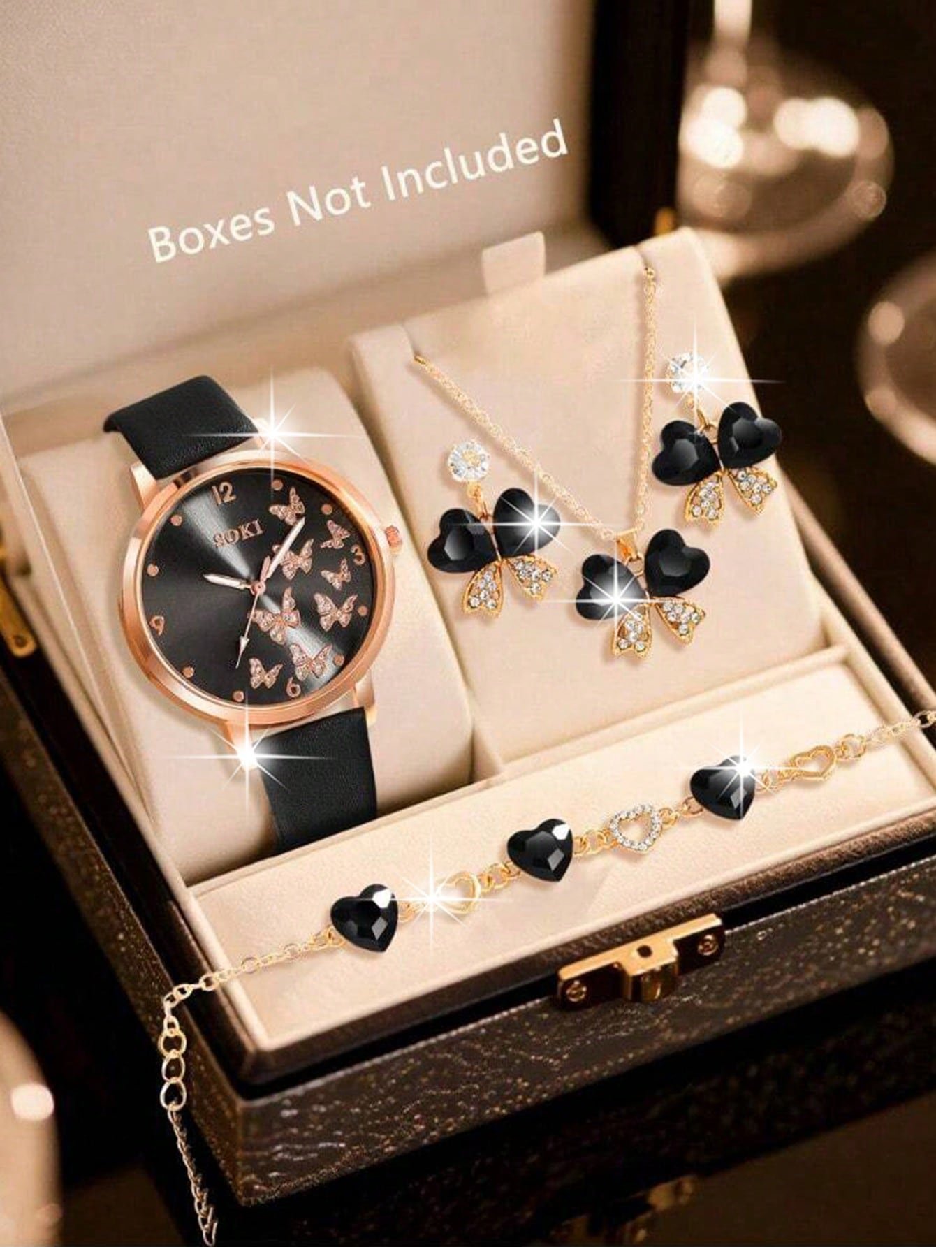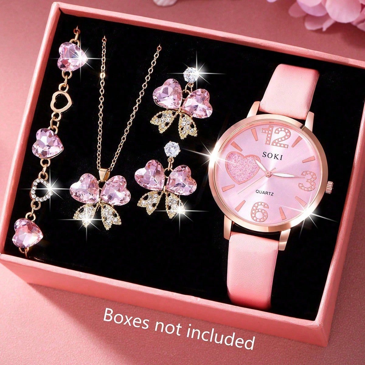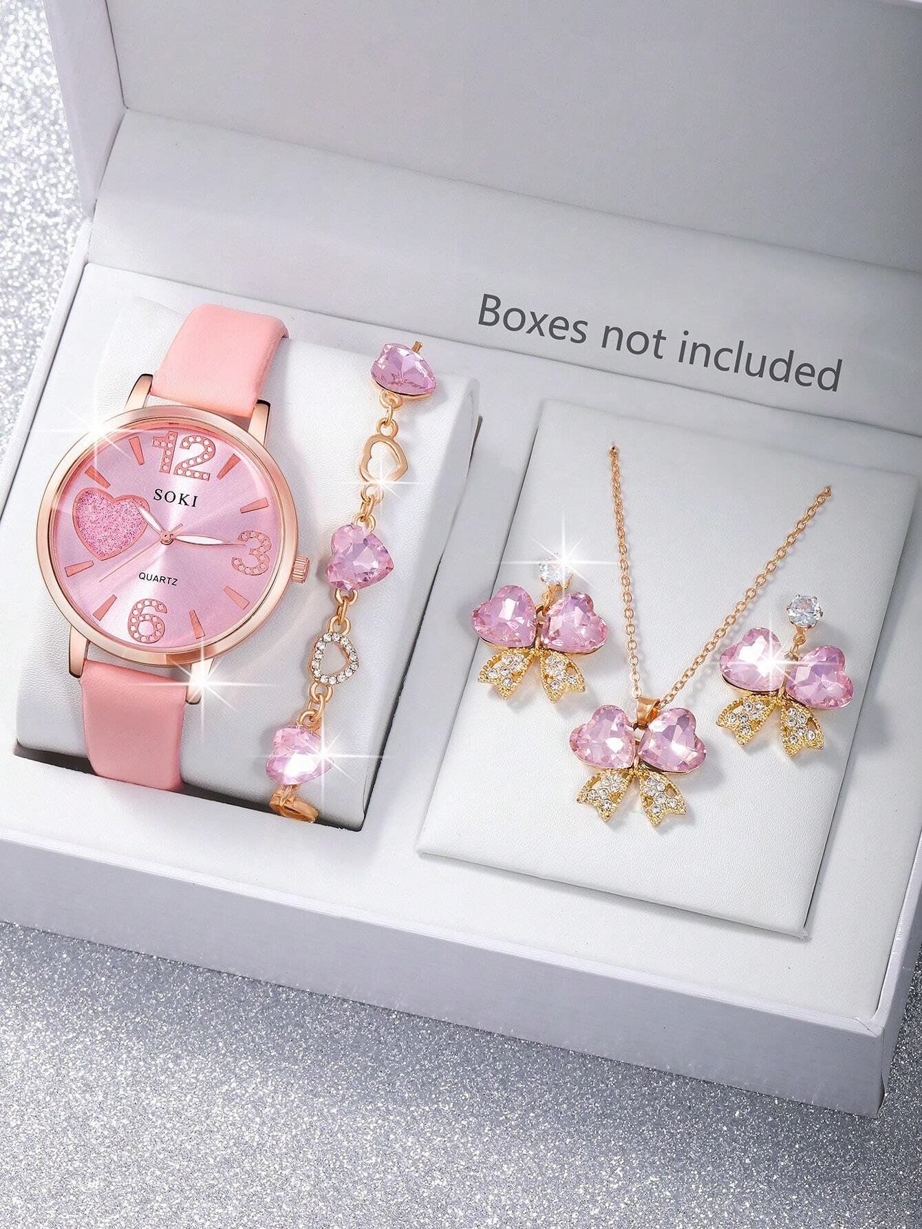 Ensemble Montre à quartz classique et décontractée pour femme, montre rose ciel étoilé pour dames, assortie à un élégant ensemble de bijoux de luxe rose avec papillon et cœur. Convient pour un port quotidien, un cadeau d'anniversaire, une fête, un rassemb