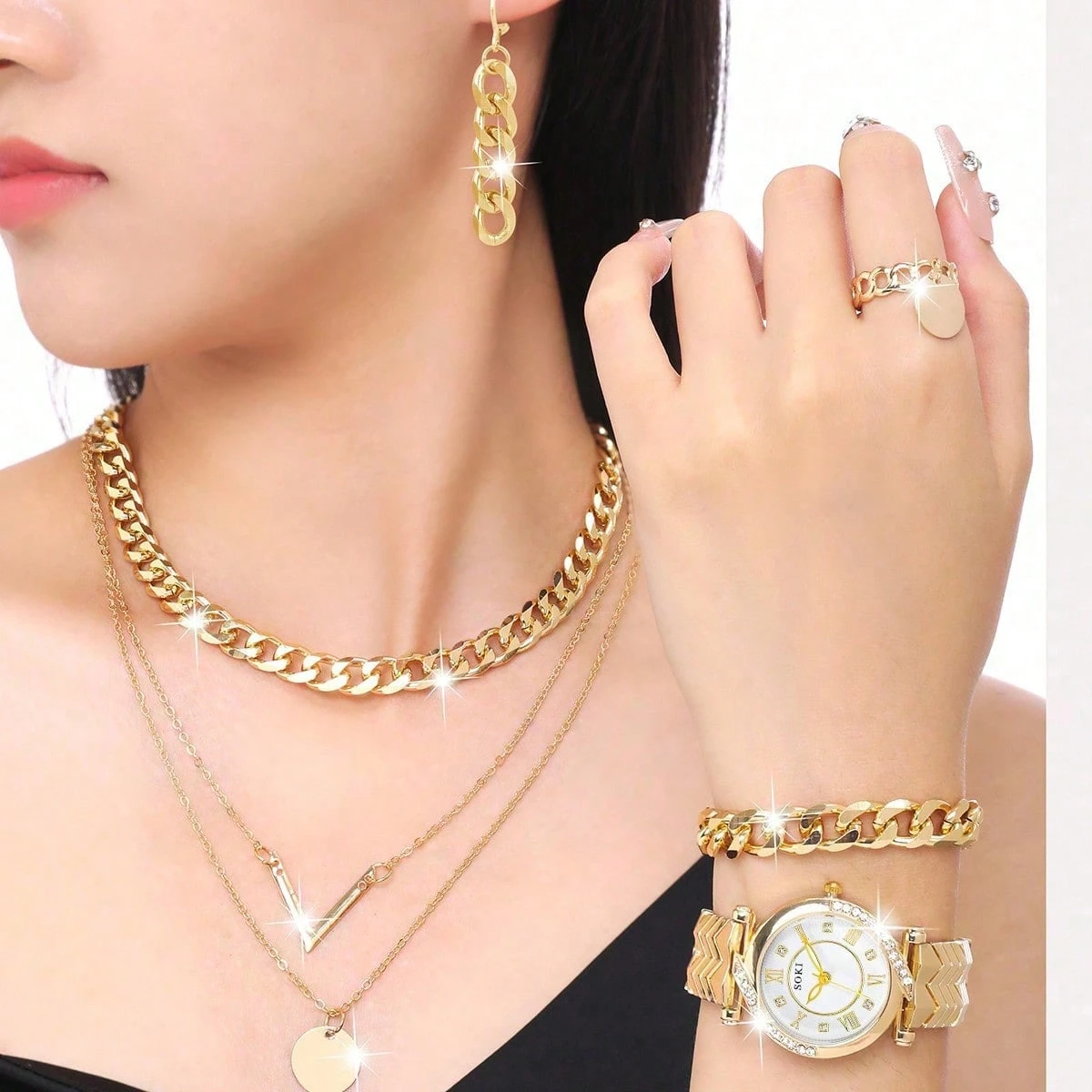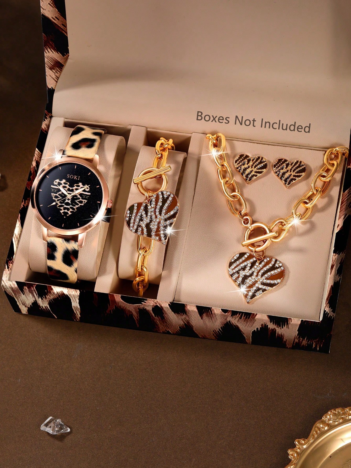 Ensemble Montre à quartz ronde avec cadran imprimé léopard personnalisé et assorti avec un collier, des boucles d'oreilles et un bracelet imprimé léopard. Parfait pour le port quotidien, les anniversaires, les fêtes, les rassemblements. Cadeau idéal pour